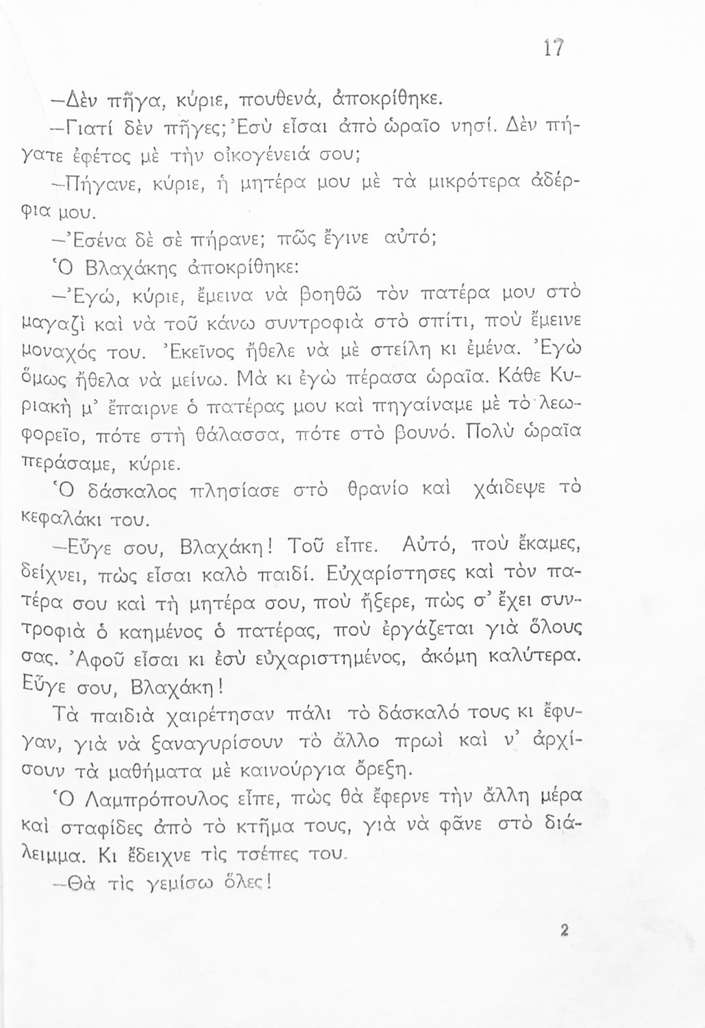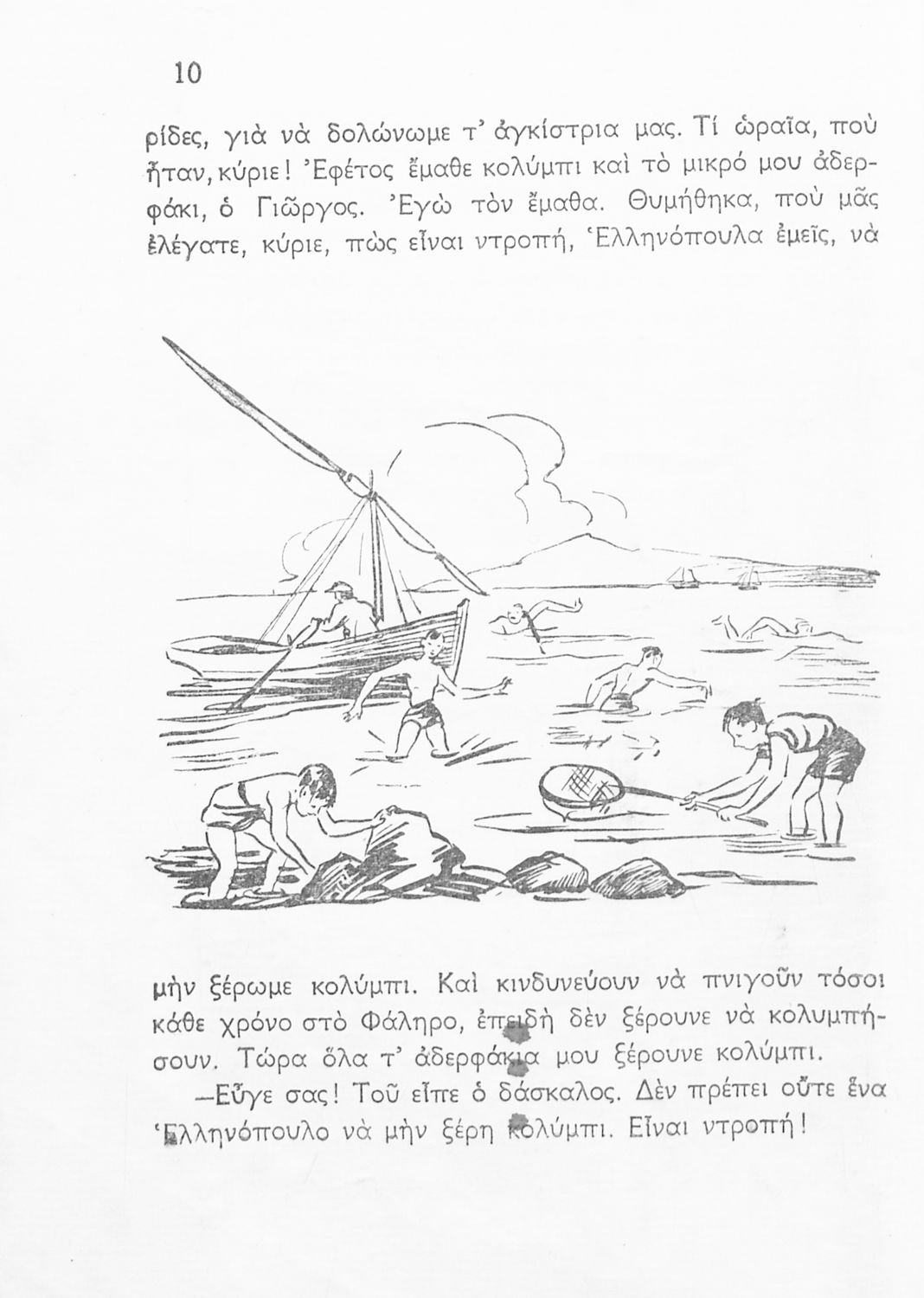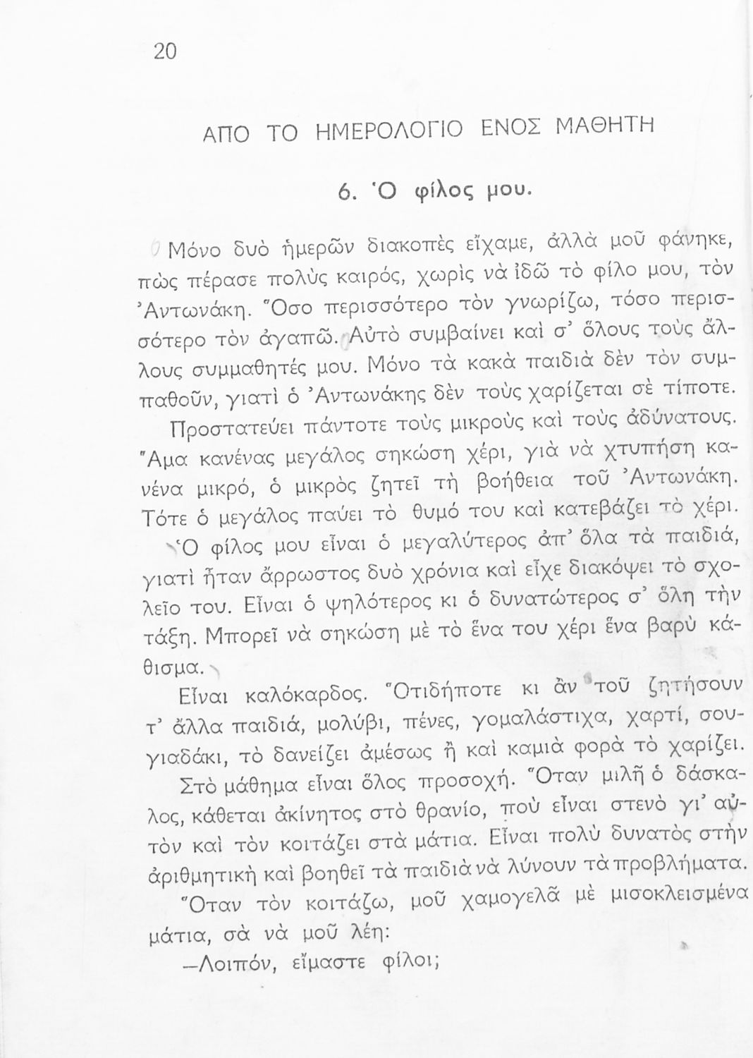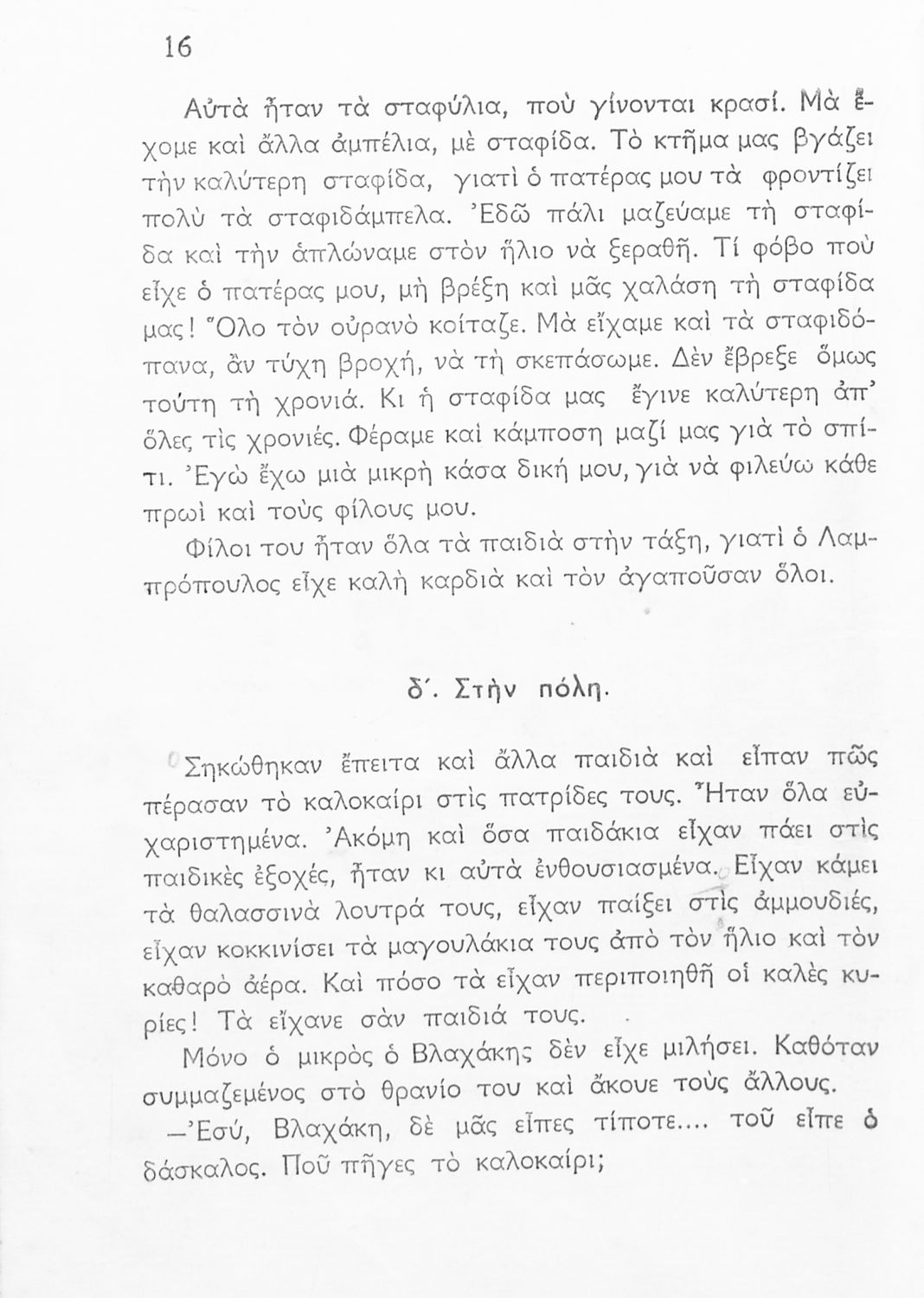 Βαθμίδα εκπαίδευσης: Πρωτοβάθμια Τάξη: Γ' Δημοτικού Μάθημα: Νέα Ελληνικά Γλώσσα: Δημοτική Παρουσίαση περιεχομένου: Αναγνωστικό Γ΄ Δημοτικού που περιλαμβάνει ποιήματα και πεζά εμπνευσμένα από τη ζωή της υπαίθρου, την οικογενειακή και κοινωνική ζωή και το εθνικό παρελθόν. Αποτυπώνει τις ιδεολογικές προκείμενες του μεταξικού καθεστώτος τόσο όσον αφορά το περιεχόμενο (“Ο στρατός περνά”, “4η Αυγούστου” και “Ύμνος της Εθνικής Νεολαίας”) όσο και την εικονογράφηση καθώς το εξώφυλλο του βιβλίου κοσμείται από τον χαρακτηριστικό φασιστικό χαιρετισμό δύο παιδιών. |
