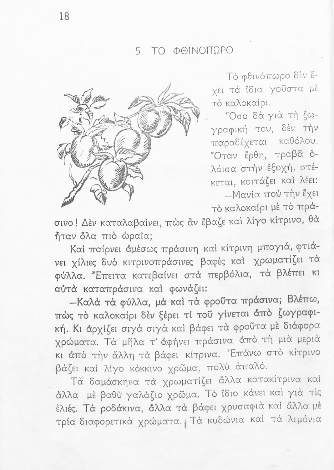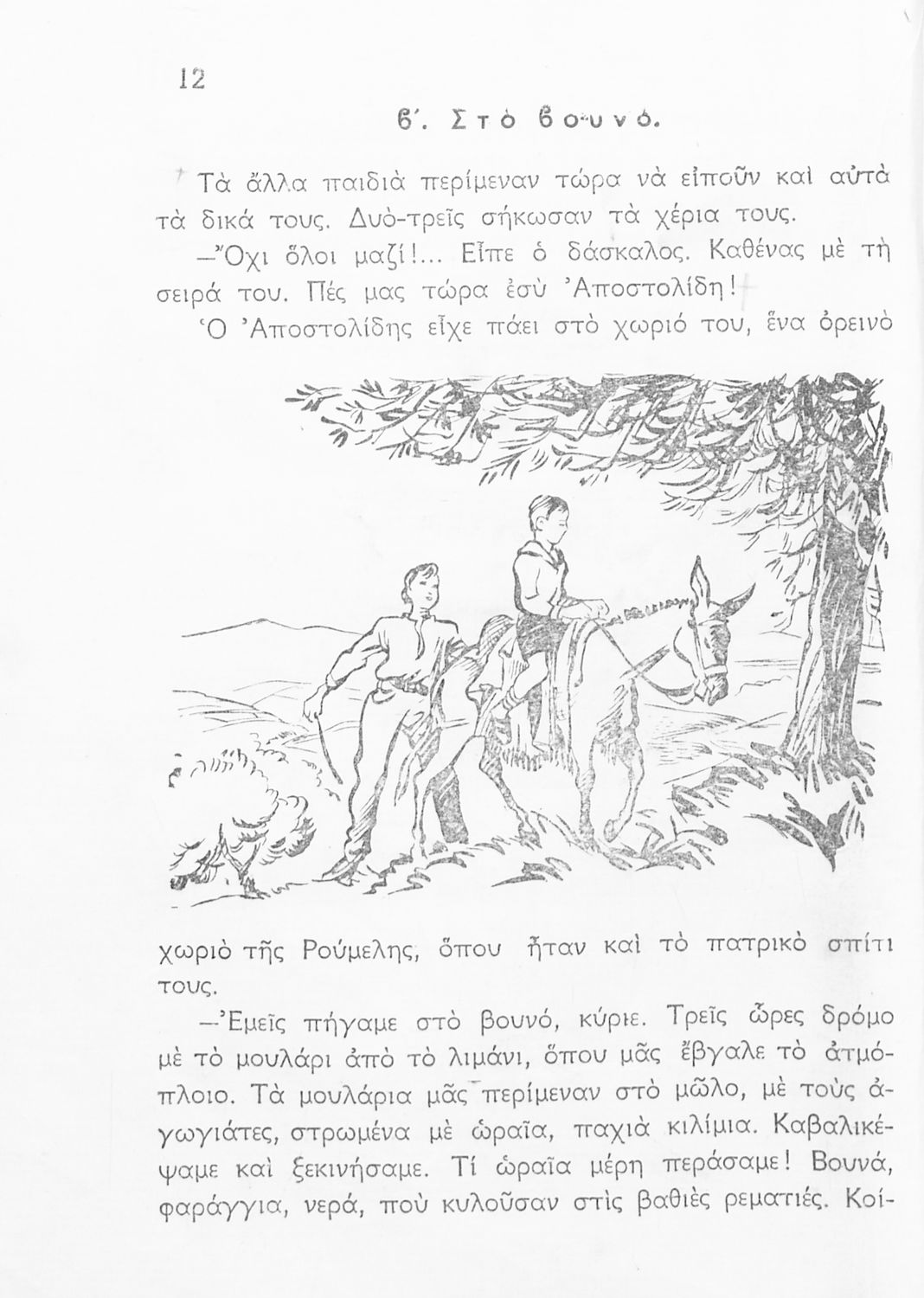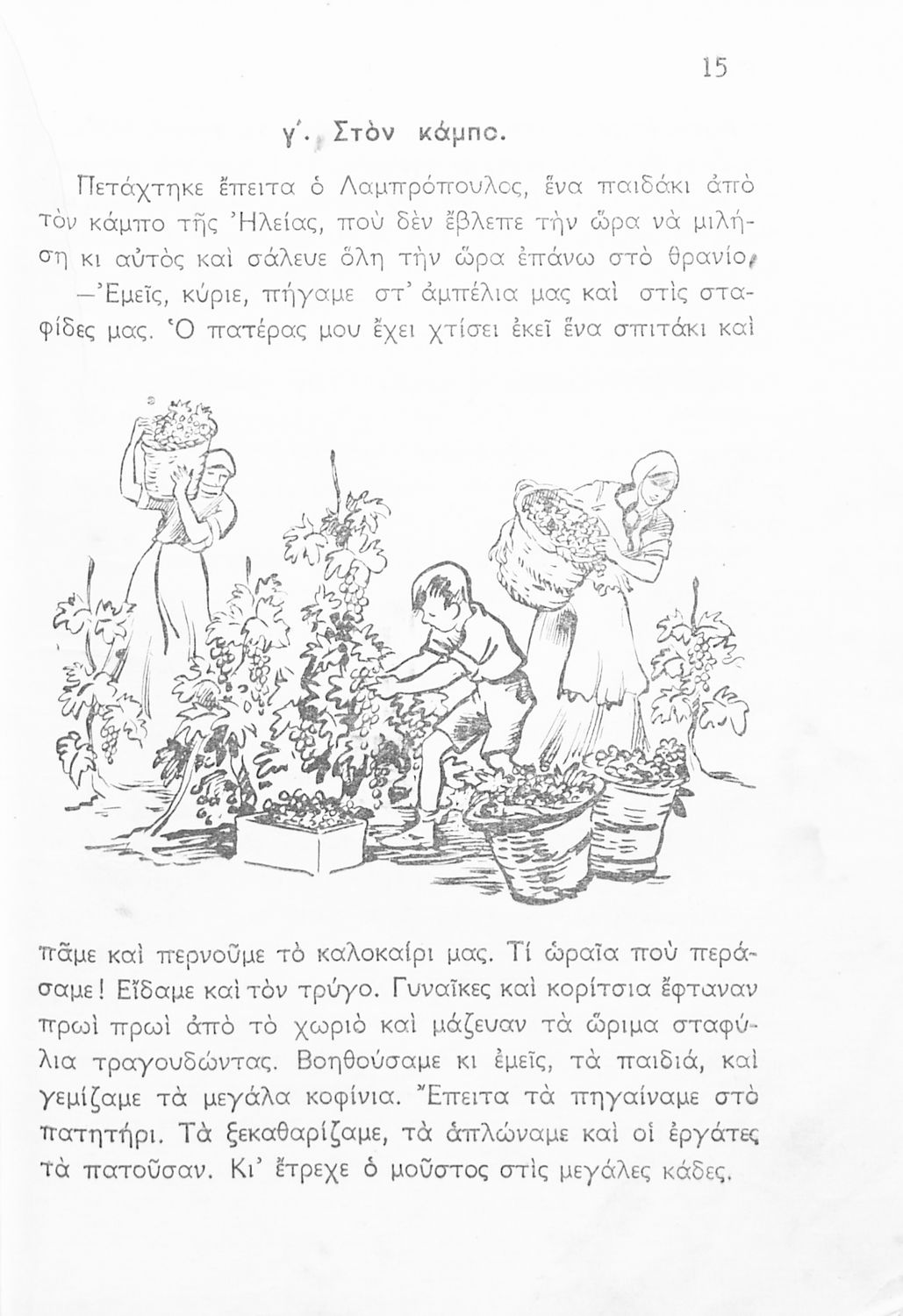 Αναγνωστικό Γ΄ Δημοτικού που περιλαμβάνει ποιήματα και πεζά εμπνευσμένα από τη ζωή της υπαίθρου, την οικογενειακή και κοινωνική ζωή και το εθνικό παρελθόν. Αποτυπώνει τις ιδεολογικές προκείμενες του μεταξικού καθεστώτος τόσο όσον αφορά το περιεχόμενο (“Ο στρατός περνά”, “4η Αυγούστου” και “Ύμνος της Εθνικής Νεολαίας”) όσο και την εικονογράφηση καθώς το εξώφυλλο του βιβλίου κοσμείται από τον χαρακτηριστικό φασιστικό χαιρετισμό δύο παιδιών.