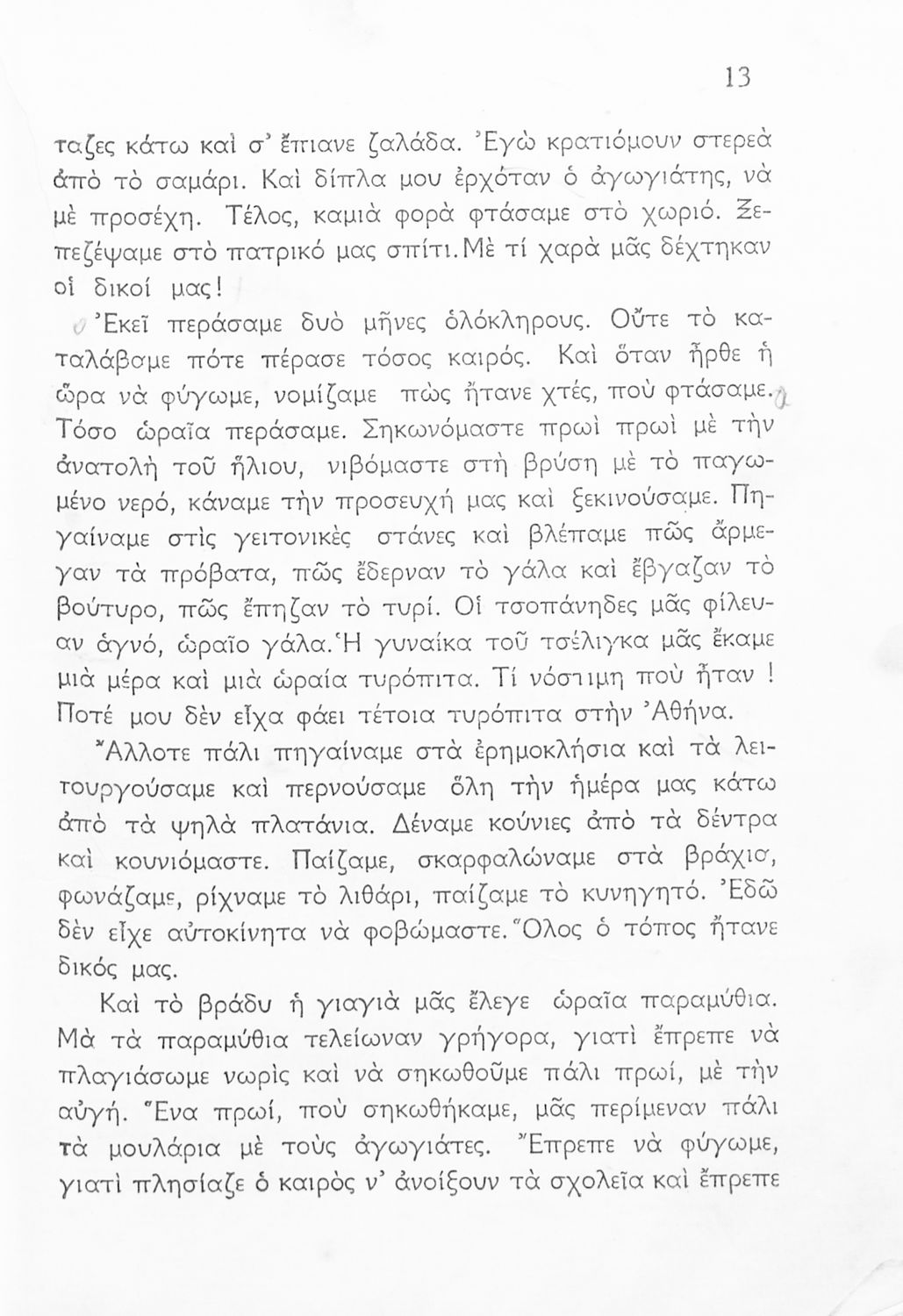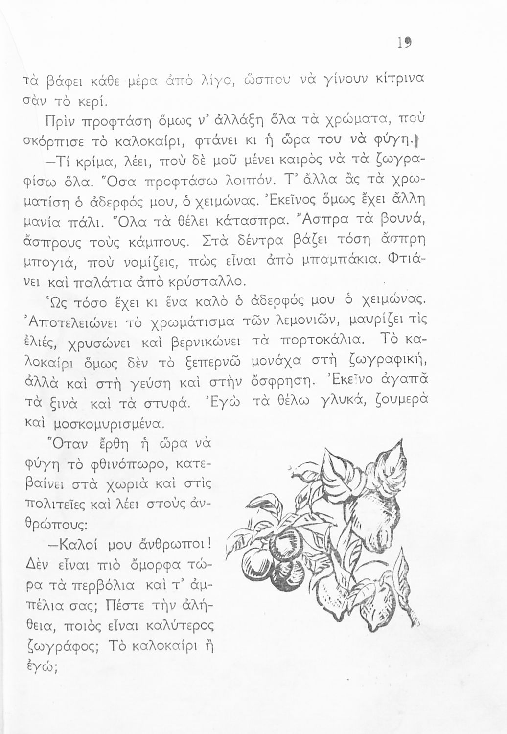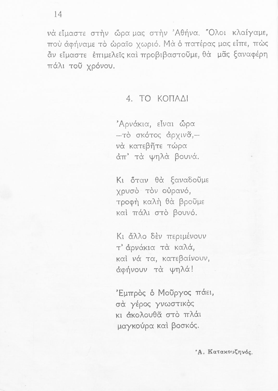 Αναγνωστικό Γ΄ Δημοτικού που περιλαμβάνει ποιήματα και πεζά εμπνευσμένα από τη ζωή της υπαίθρου, την οικογενειακή και κοινωνική ζωή και το εθνικό παρελθόν. Αποτυπώνει τις ιδεολογικές προκείμενες του μεταξικού καθεστώτος τόσο όσον αφορά το περιεχόμενο (“Ο στρατός περνά”, “4η Αυγούστου” και “Ύμνος της Εθνικής Νεολαίας”) όσο και την εικονογράφηση καθώς το εξώφυλλο του βιβλίου κοσμείται από τον χαρακτηριστικό φασιστικό χαιρετισμό δύο παιδιών.