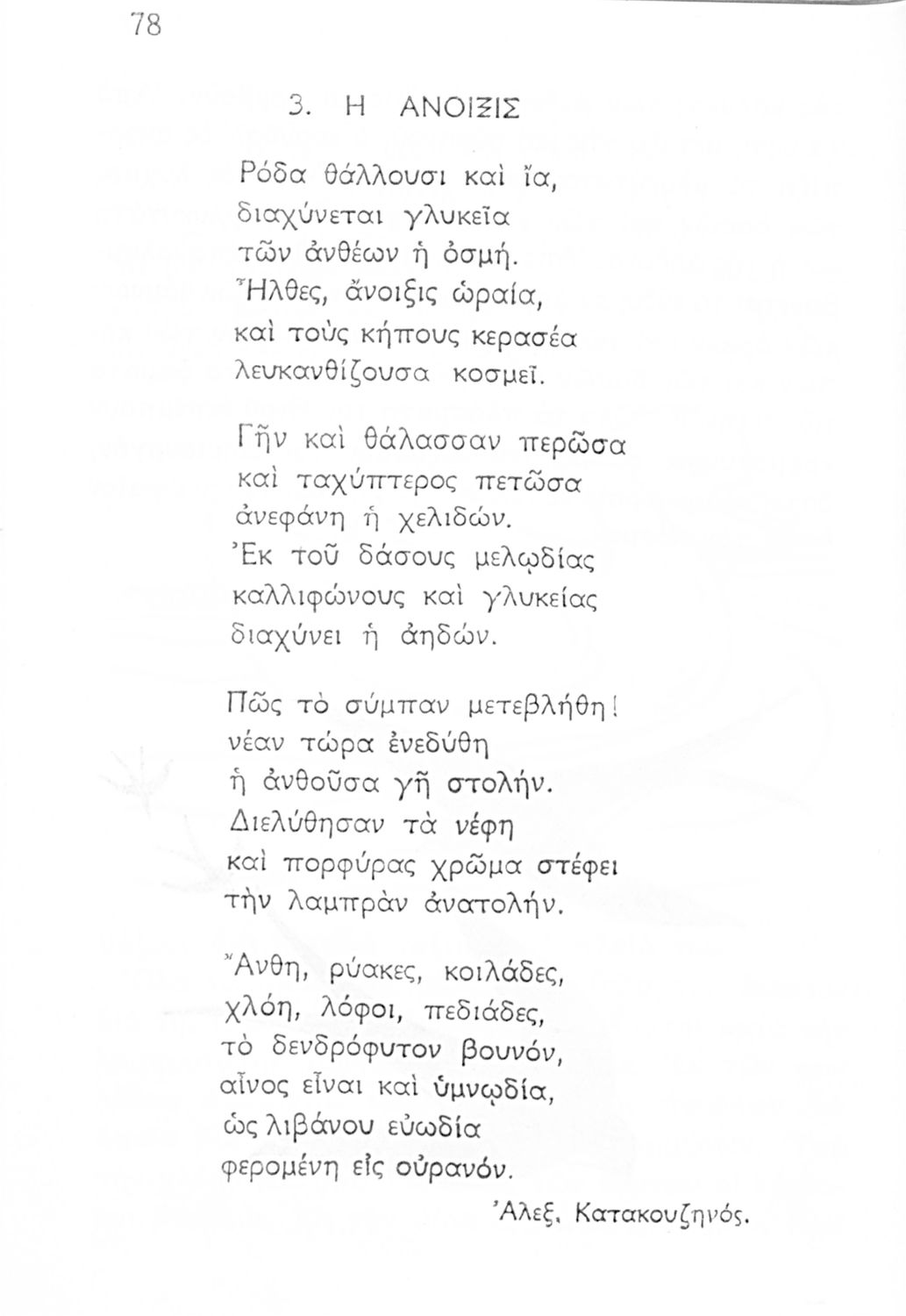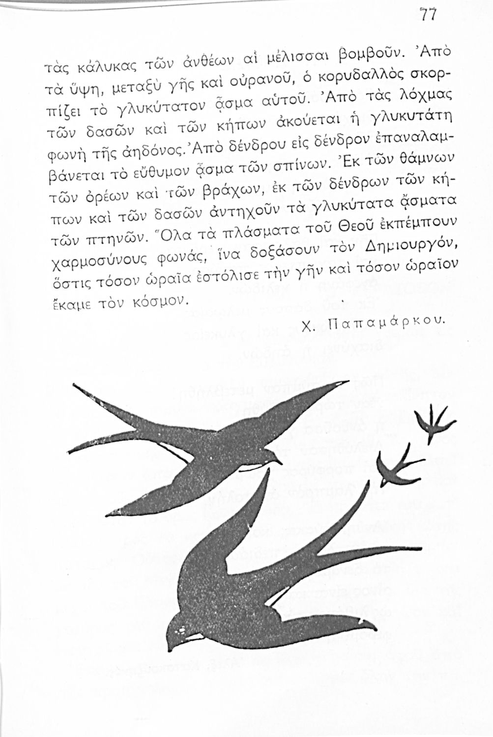 Αναγνωστικό ΣΤ΄ Δημοτικού που περιλαμβάνει ποιήματα και πεζά με θέματα από την οικογενειακή, κοινωνική και θρησκευτική ζωή των Ελλήνων και την ελληνική φύση και ιστορία.