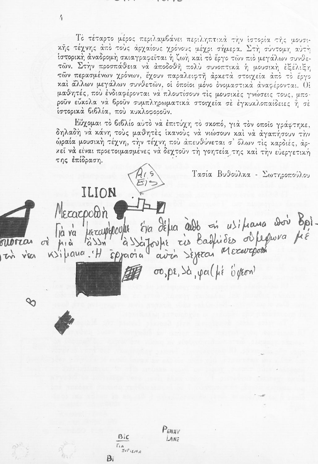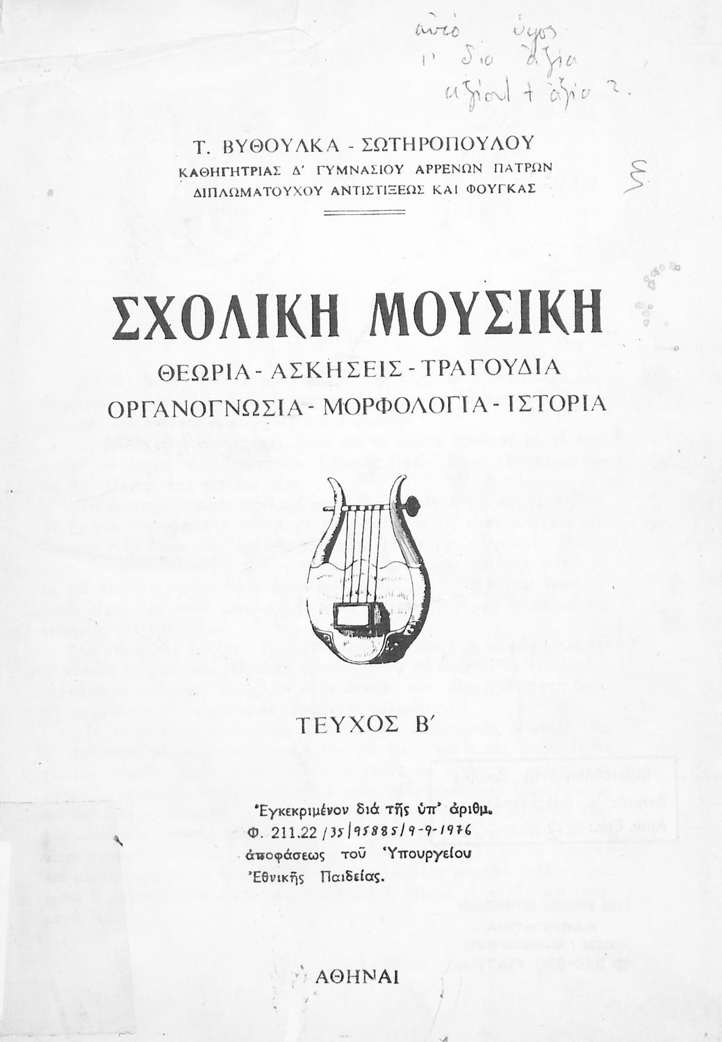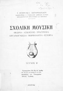 Σχολικό εγχειρίδιο Μουσικής κατά το αναλυτικόν πρόγραμμα του Υπουργείου Παιδείας. Περιέχει Θεωρία- Σολφέζ- Τραγούδι- Οργανολογία- Μορφολογία και Ιστορία της Μουσικής.