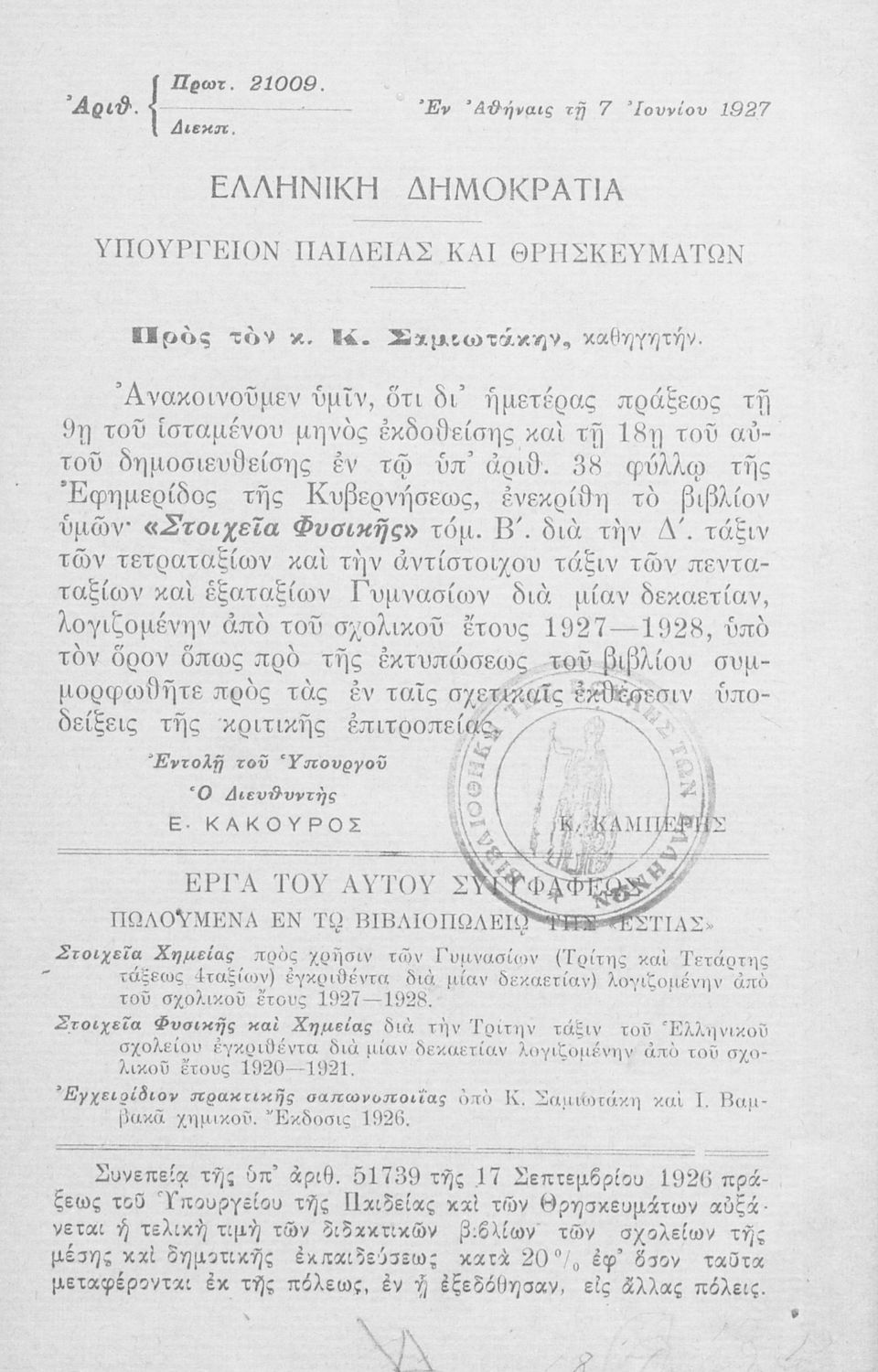Υπουργική απόφαση / Σύμβαση: 21009/7-8-1927