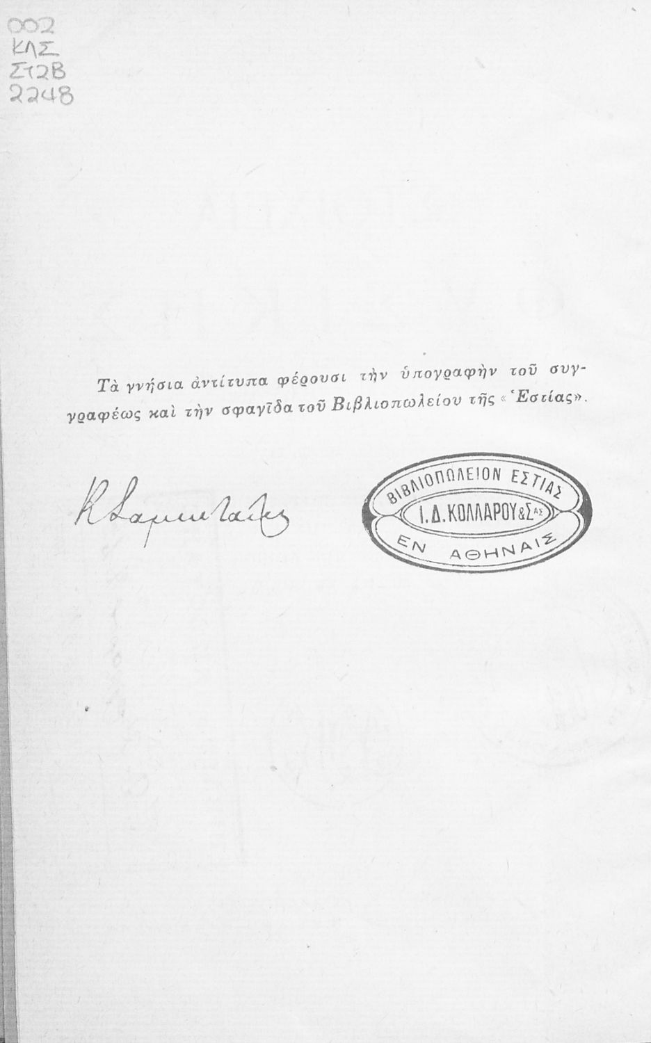 Εκδότης: Ιωάννης Δ. Κολλάρος και ΣΙΑ, Βιβλιοπωλείο της "Εστίας"