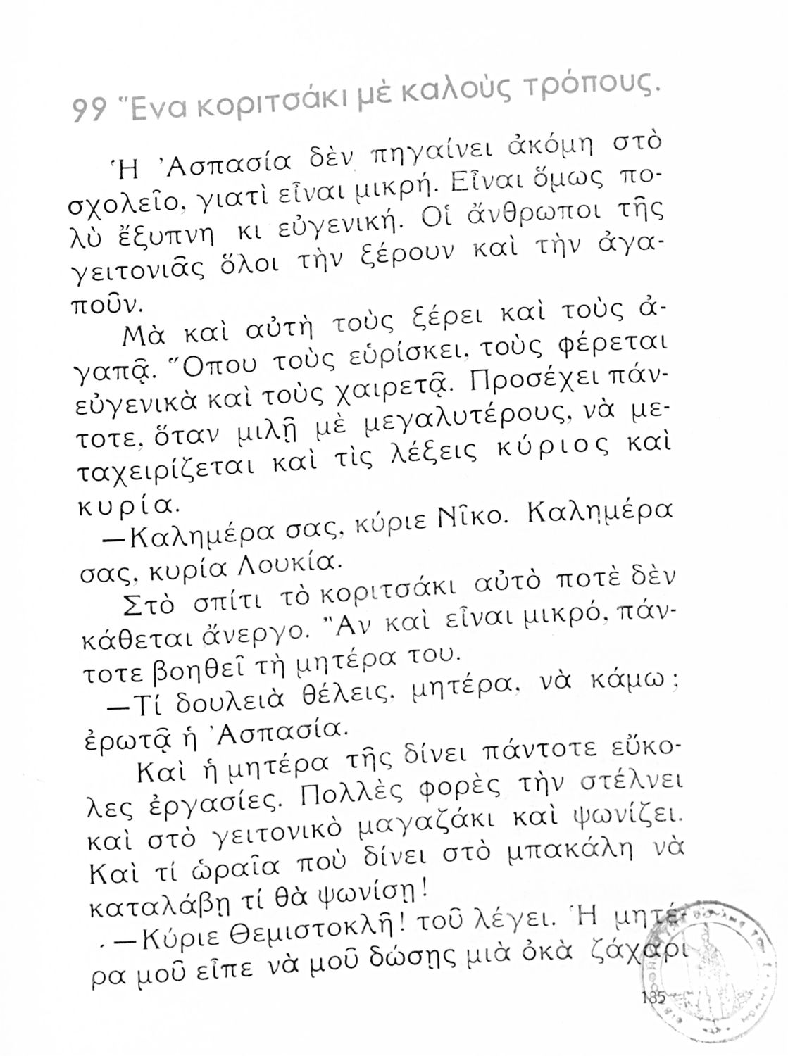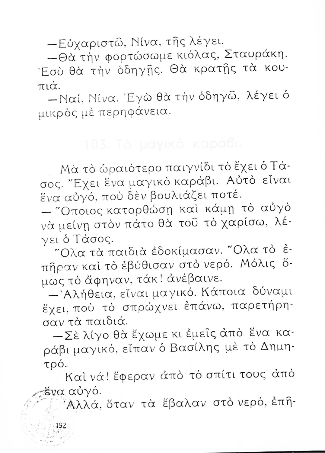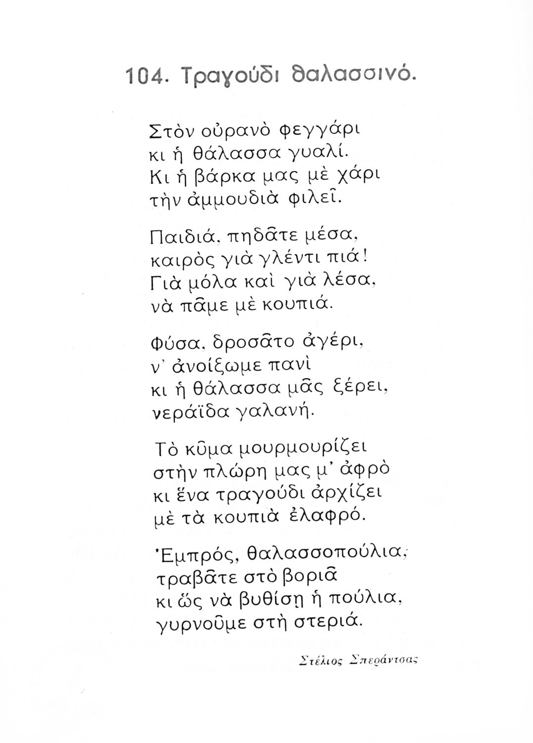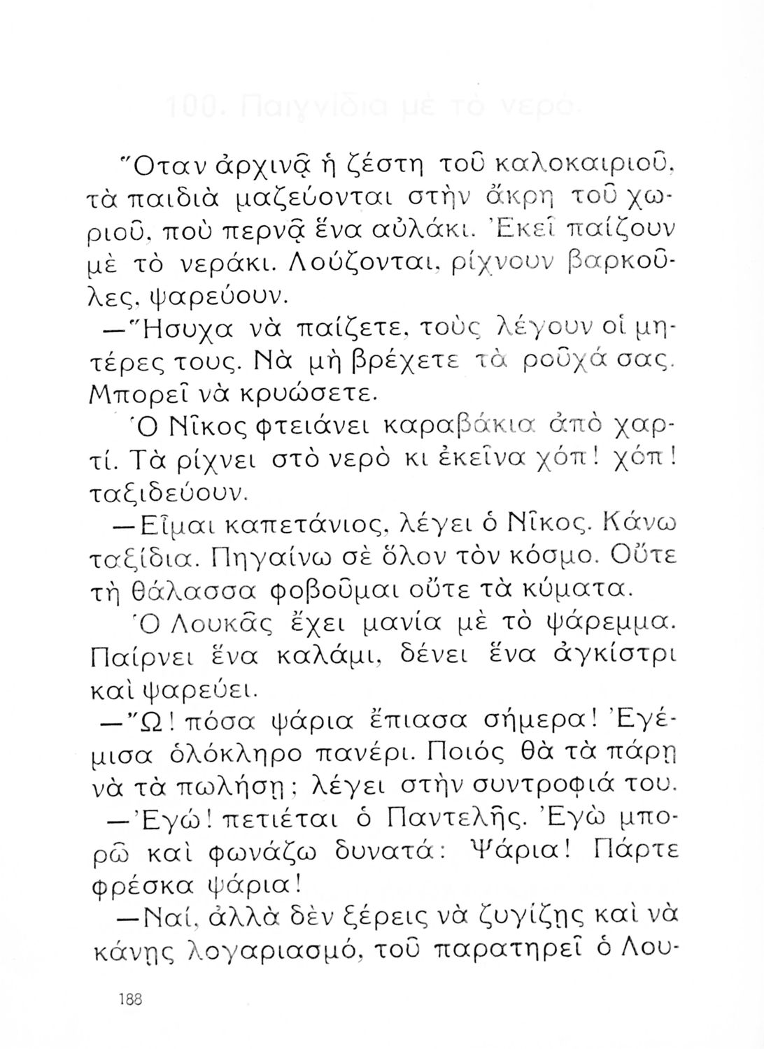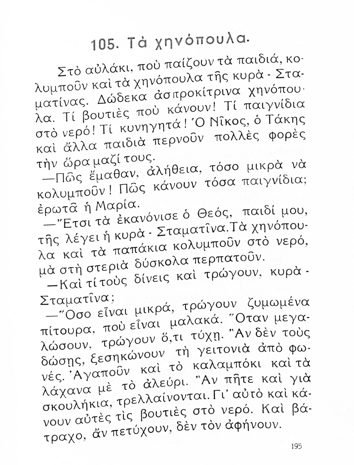 Αναγνωστικό Β' Δημοτικού που είναι χωρισμένο σύμφωνα με τις εποχές του χρόνου και περιλαμβάνει κείμενα ηθοποιητικού περιεχομένου εμπνευσμένα από τη θρησκευτική, εθνική, κοινωνική και οικογενειακή ζωή.