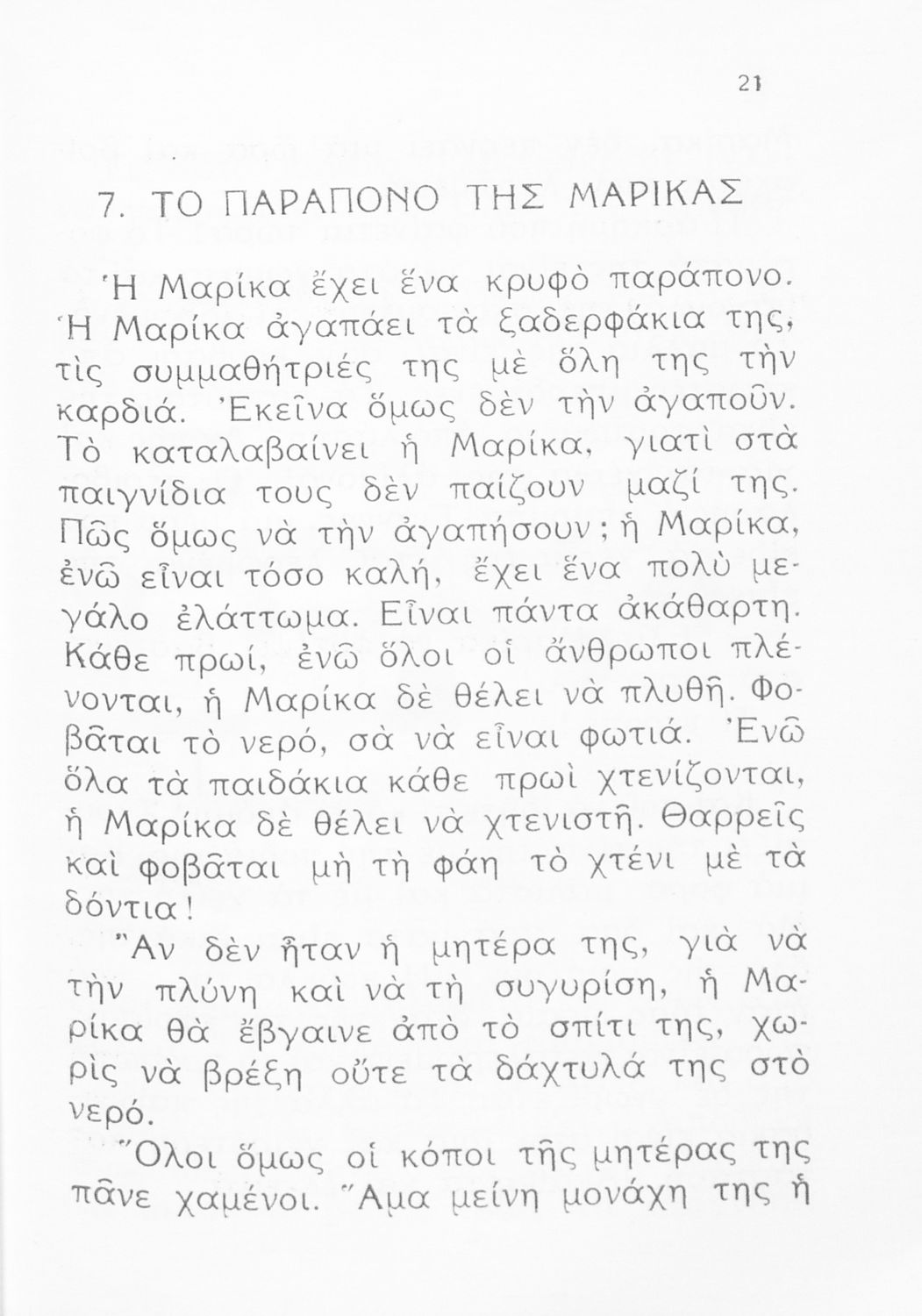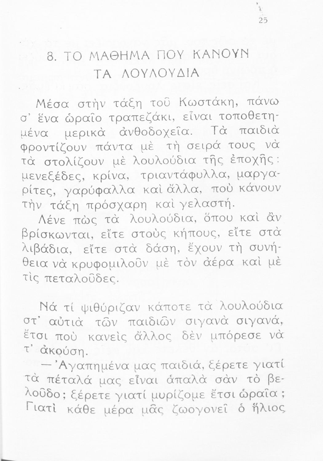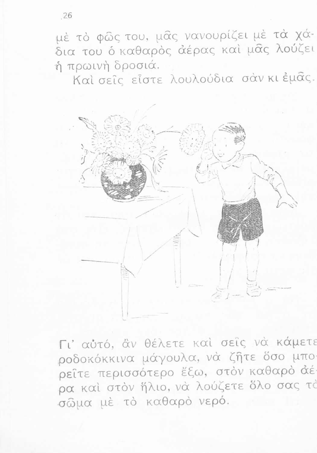 Αναγνωστικό Β΄ Δημοτικού που περιέχει κείμενα πεζά και ποιήματα ηθικοπλαστικού περιεχομένου εμπνευσμένα από την καθημερινότητα των παιδιών, τη θρησκευτική παράδοση, τις εποχές του χρόνου, και την ελληνική φύση.