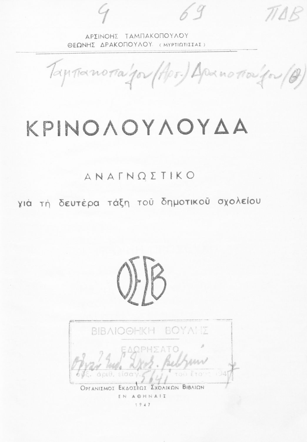 Συγγραφέας: Αρσινόη Ταμπακοπούλου, Θεώνη Δρακοπούλου (Μυρτιώτισσα)