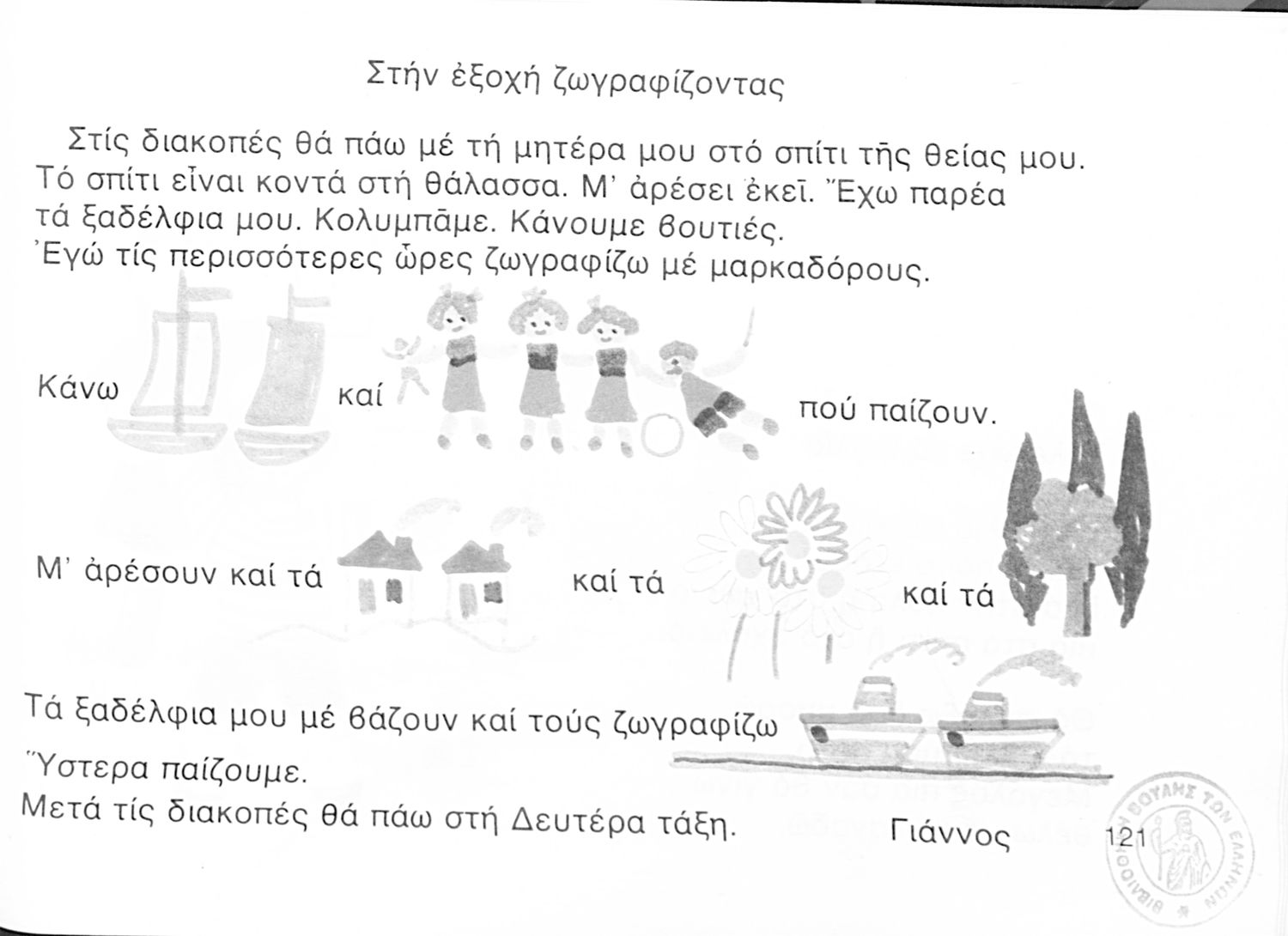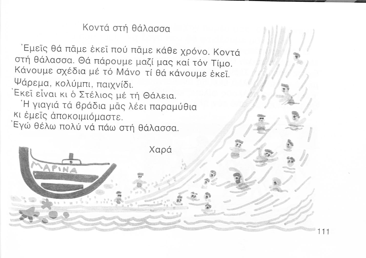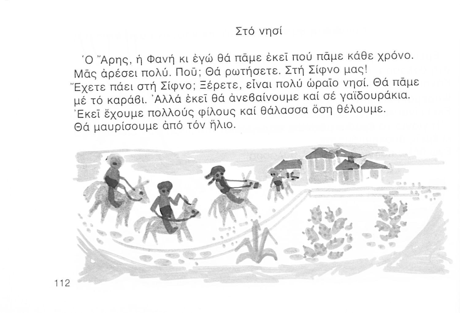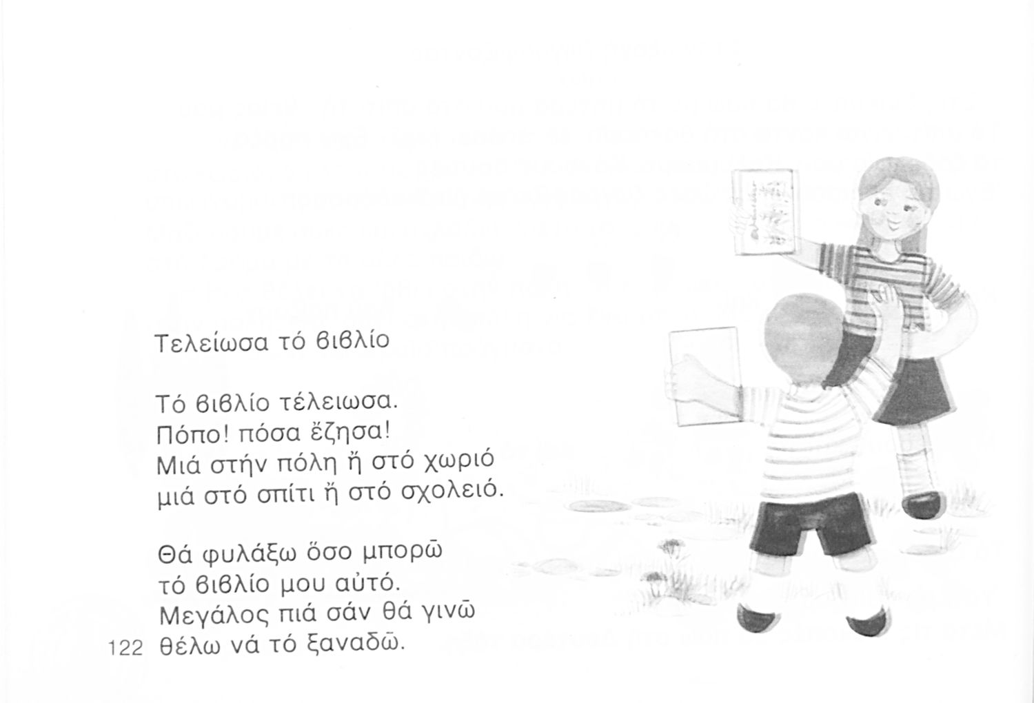 Αναγνωστικό Α΄ Δημοτικού που περιέχει γράμματα, συλλαβές, λέξεις, προτάσεις και κείμενα εμπνευσμένα από την οικογενειακή και κοινωνική ζωή του τόπου. Φέρει το σύμβολο της δικτατορίας.