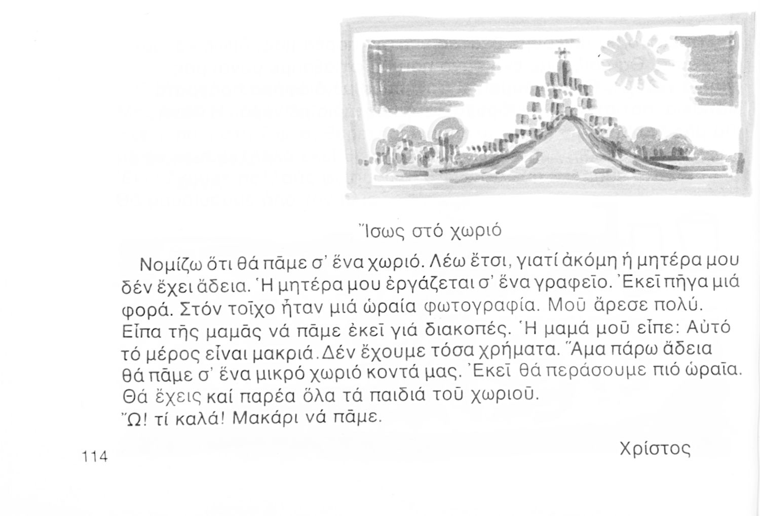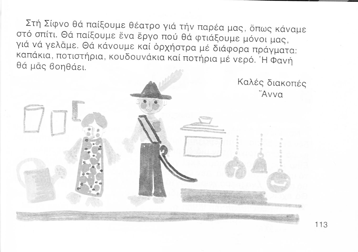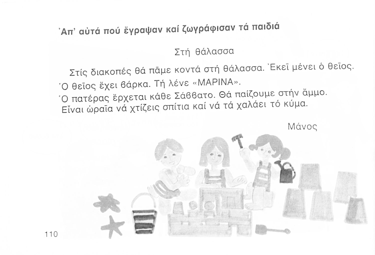 Αναγνωστικό Α΄ Δημοτικού που περιέχει γράμματα, συλλαβές, λέξεις, προτάσεις και κείμενα εμπνευσμένα από την οικογενειακή και κοινωνική ζωή του τόπου. Φέρει το σύμβολο της δικτατορίας.
