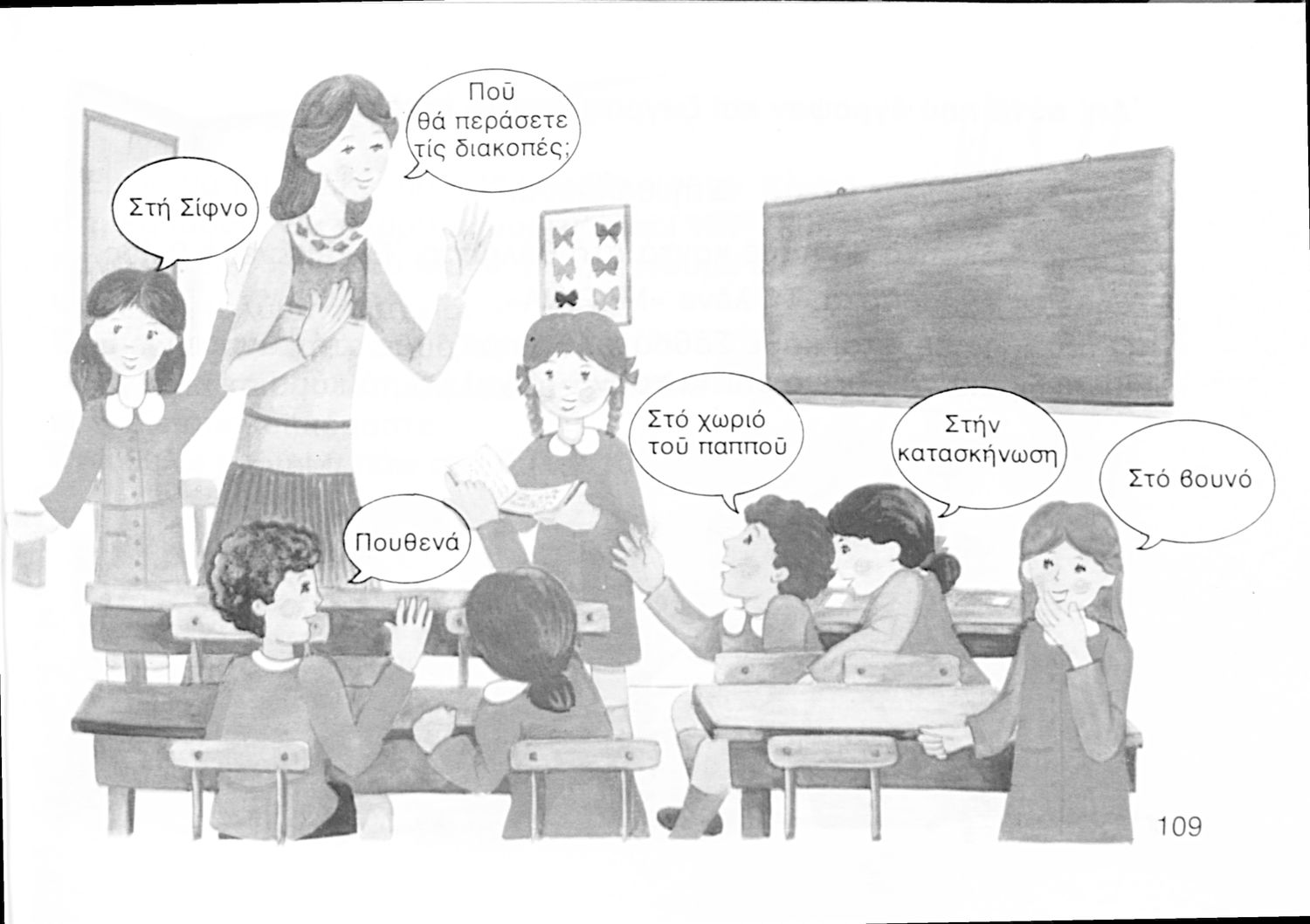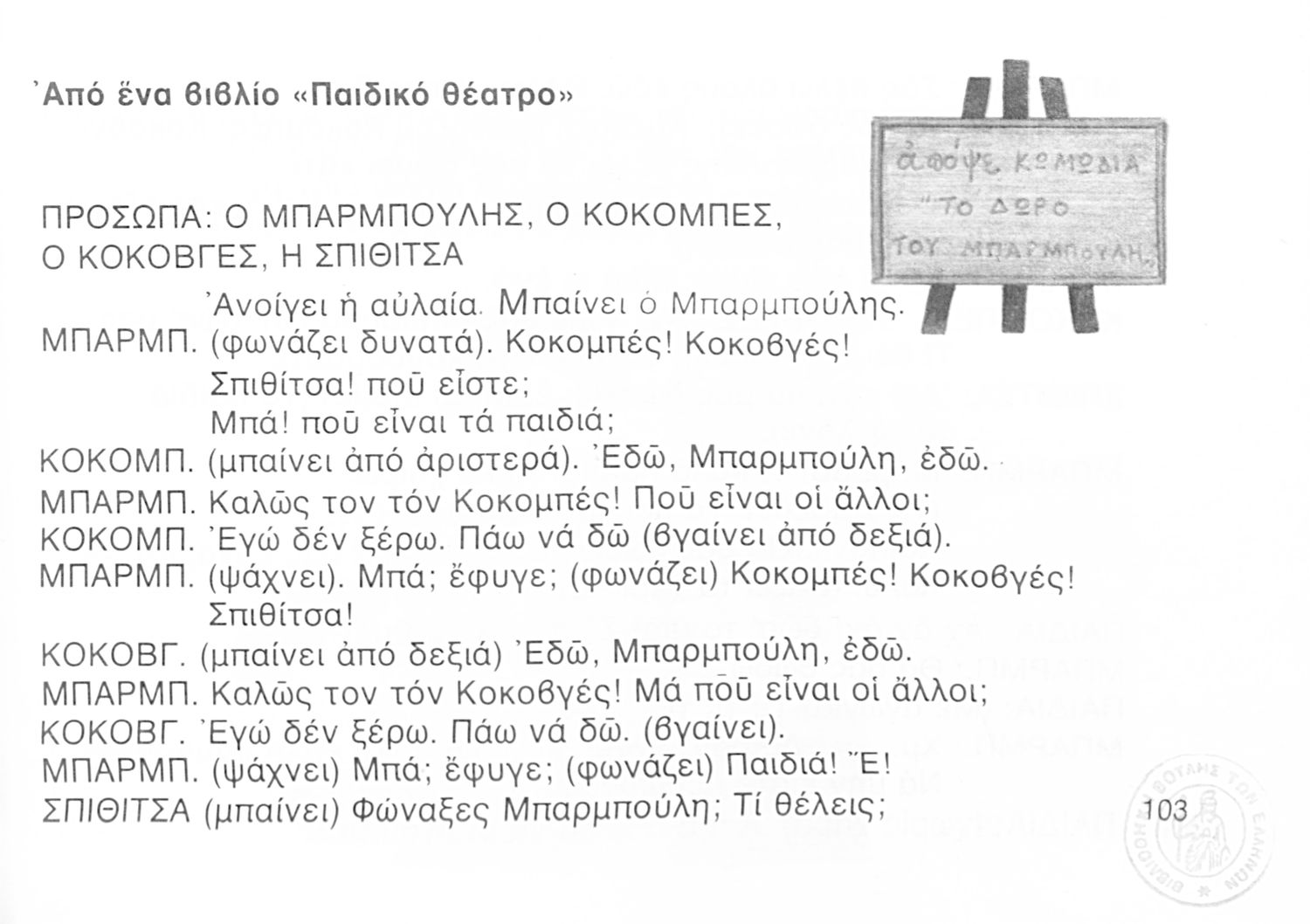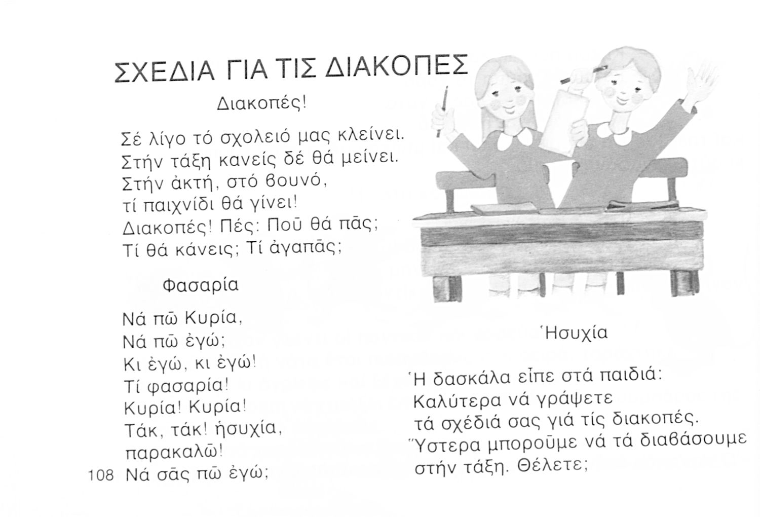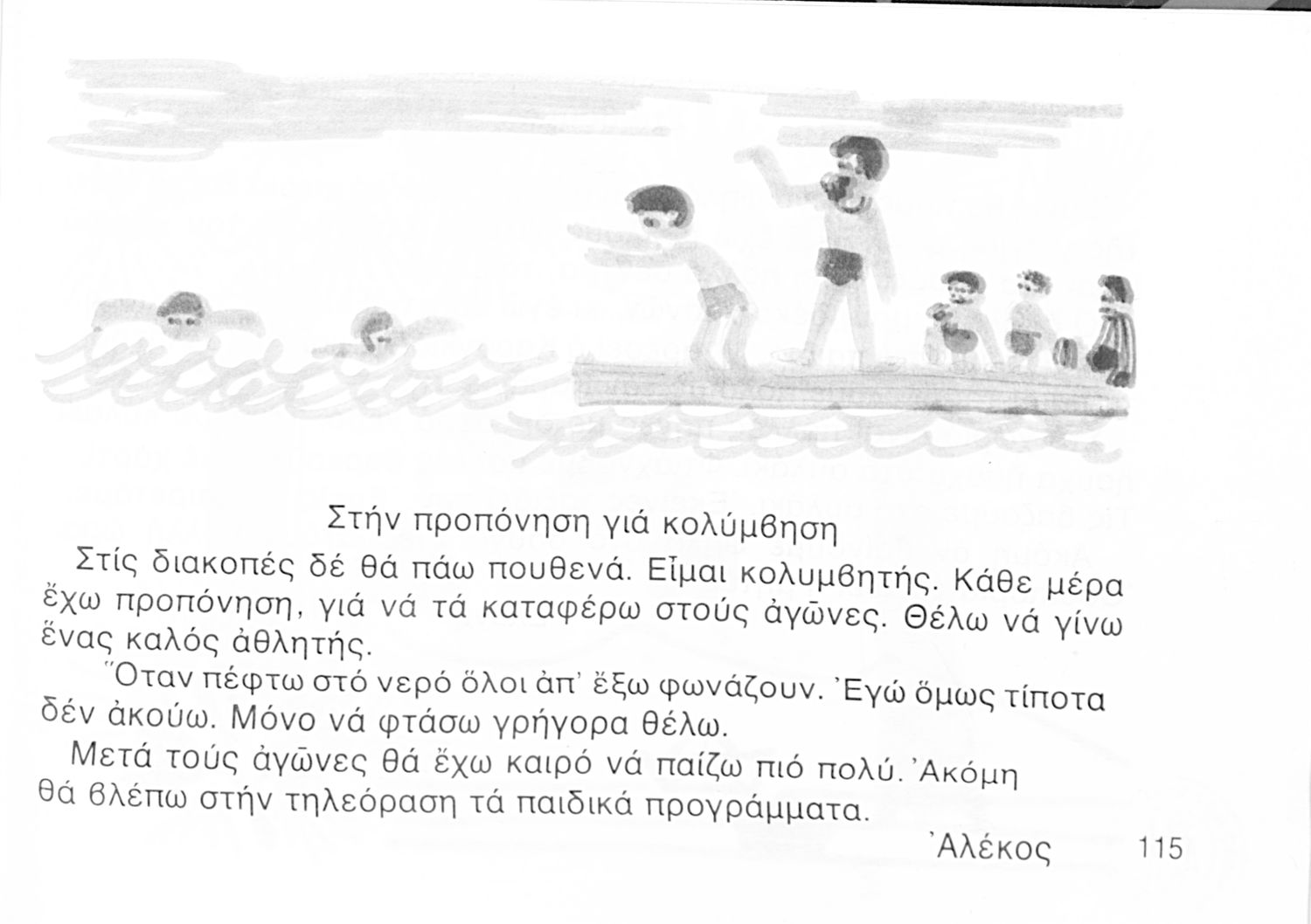 Αναγνωστικό Α΄ Δημοτικού που περιέχει γράμματα, συλλαβές, λέξεις, προτάσεις και κείμενα εμπνευσμένα από την οικογενειακή και κοινωνική ζωή του τόπου. Φέρει το σύμβολο της δικτατορίας.