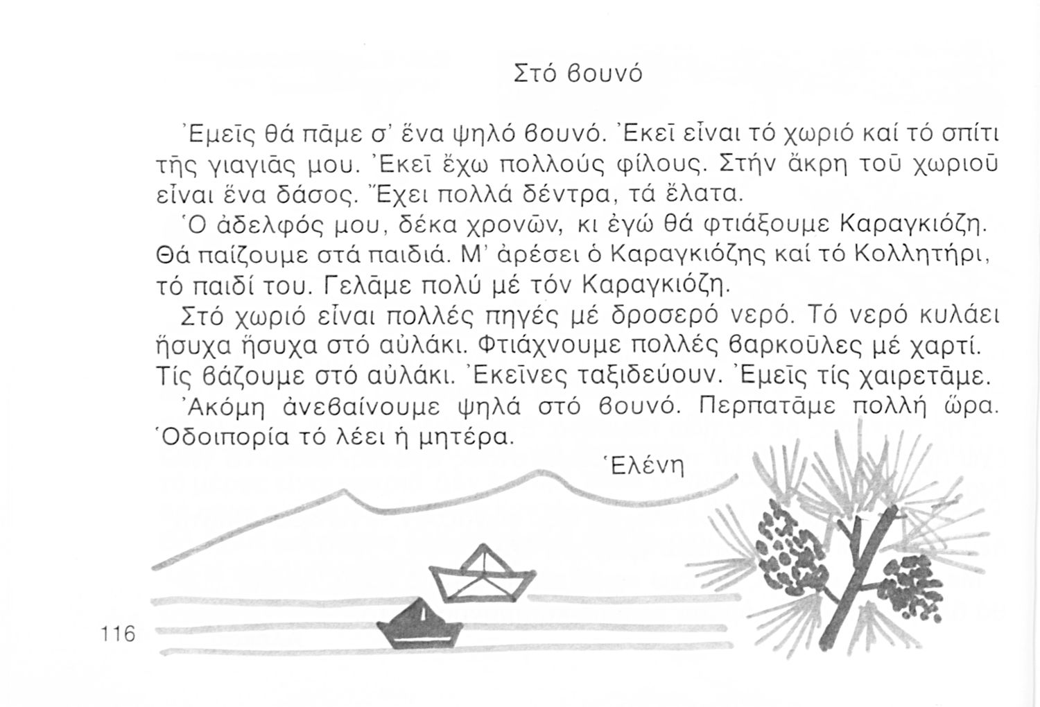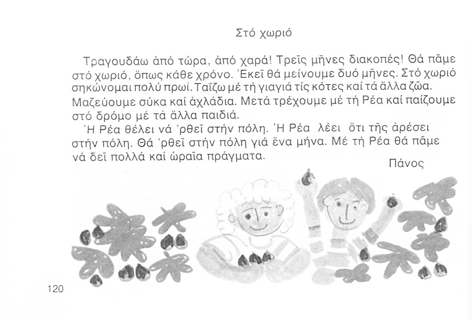 Αναγνωστικό Α΄ Δημοτικού που περιέχει λέξεις, προτάσεις και σύντομα κείμενα Ελλήνων συγγραφέων τα οποία αντλούν τα θέματά τους από την καθημερινή ζωή των ανθρώπων, την ελληνική ύπαιθρο, την αγροτική ζωή και τον οικογενειακό περίγυρο.