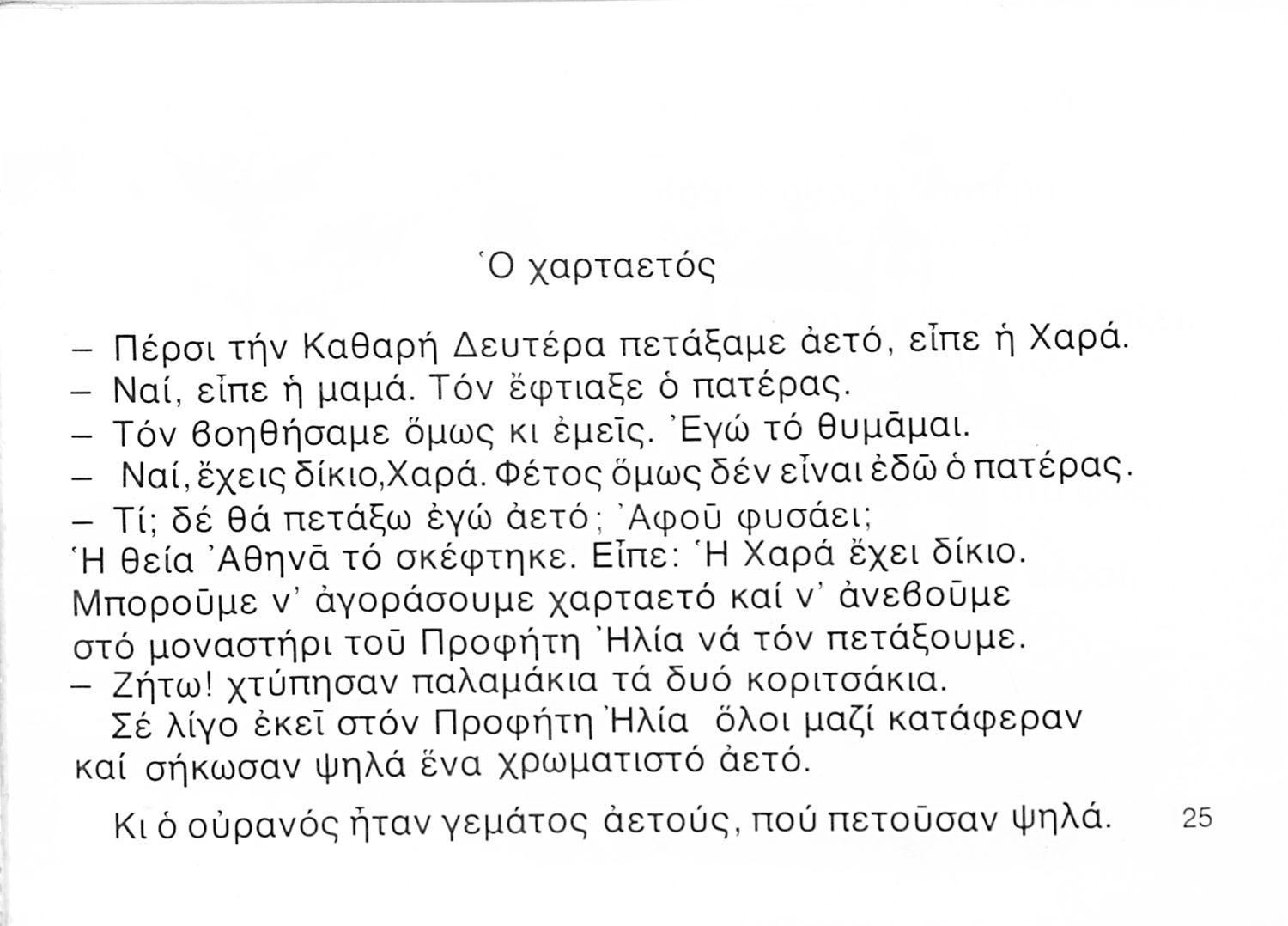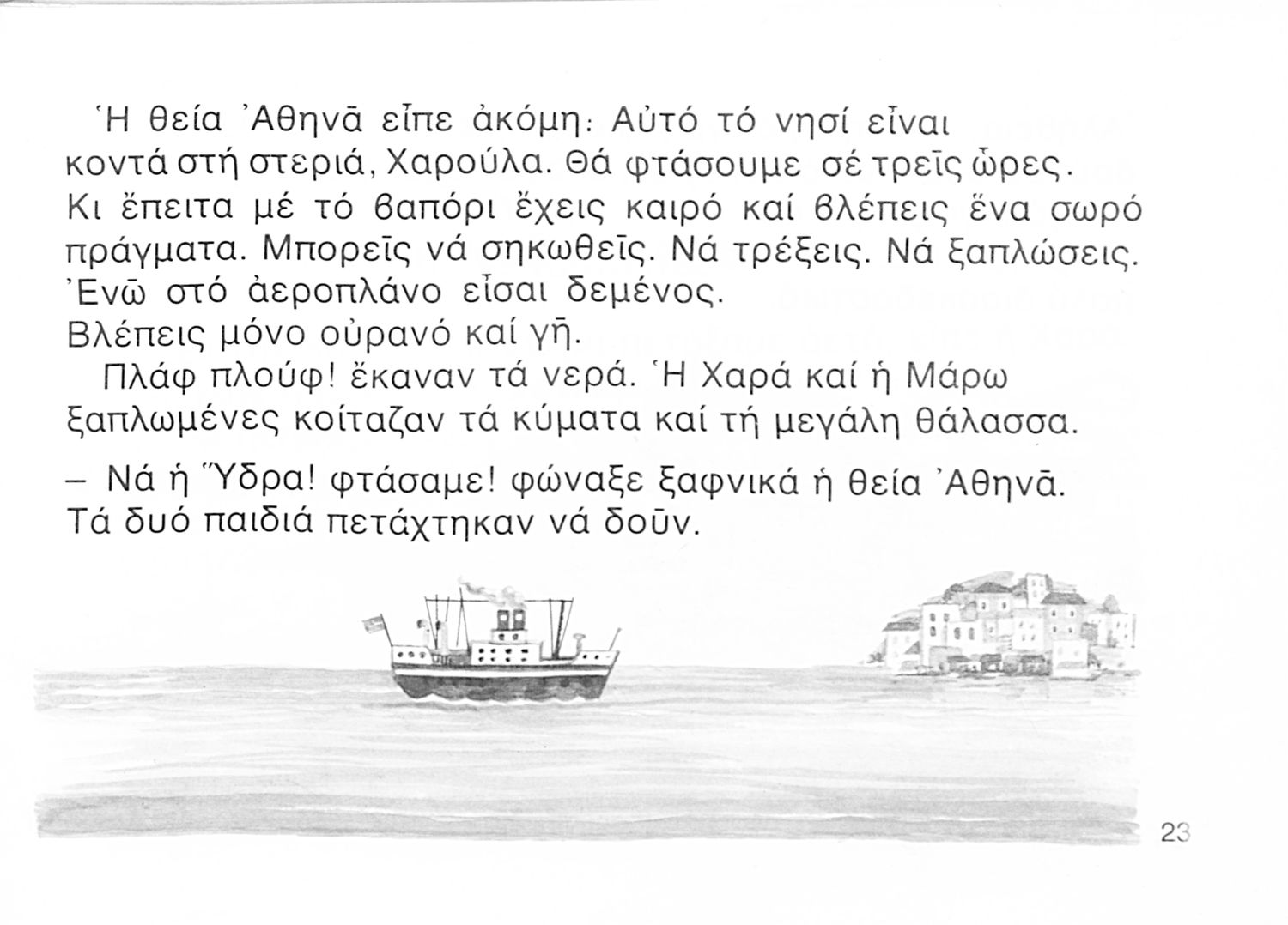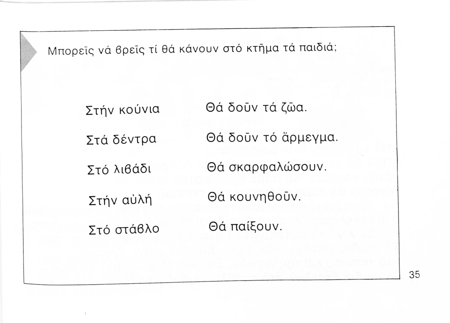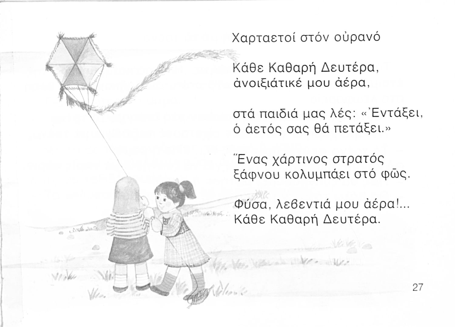 Αναγνωστικό Α΄ Δημοτικού που περιέχει λέξεις, προτάσεις και σύντομα κείμενα Ελλήνων συγγραφέων τα οποία αντλούν τα θέματά τους από την καθημερινή ζωή των ανθρώπων, την ελληνική ύπαιθρο, την αγροτική ζωή και τον οικογενειακό περίγυρο.