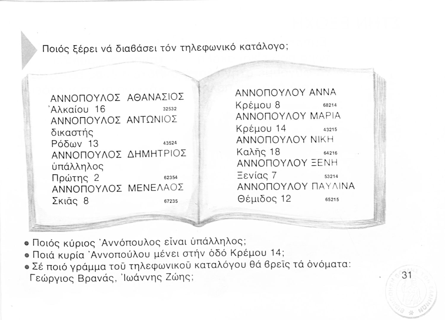 Βαθμίδα εκπαίδευσης: Πρωτοβάθμια Τάξη: Α' Δημοτικού Μάθημα: Νέα Ελληνικά Γλώσσα: Δημοτική Παρουσίαση περιεχομένου: Αναγνωστικό Α΄ Δημοτικού που περιέχει λέξεις, προτάσεις και σύντομα κείμενα Ελλήνων συγγραφέων τα οποία αντλούν τα θέματά τους από την καθημερινή ζωή των ανθρώπων, την ελληνική ύπαιθρο, την αγροτική ζωή και τον οικογενειακό περίγυρο. |
