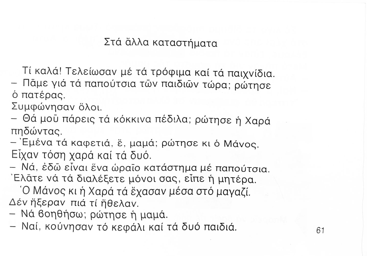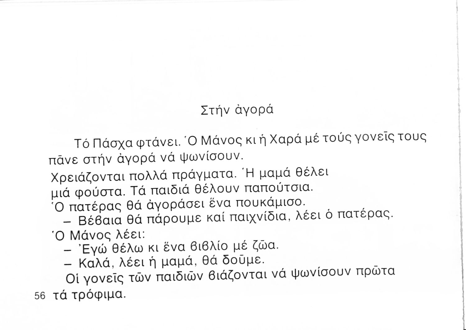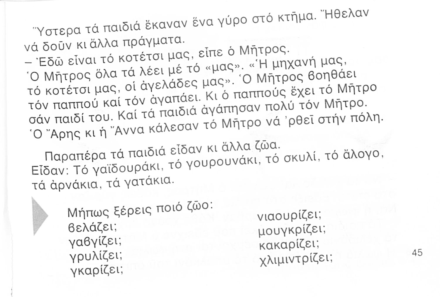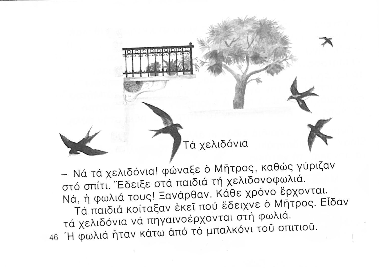 Αναγνωστικό Α΄ Δημοτικού που περιέχει γράμματα, συλλαβές, λέξεις, προτάσεις και κείμενα εμπνευσμένα από την οικογενειακή και κοινωνική ζωή του τόπου. Φέρει το σύμβολο της δικτατορίας.