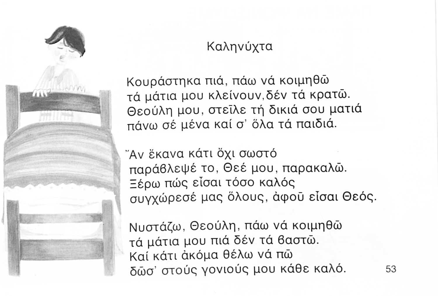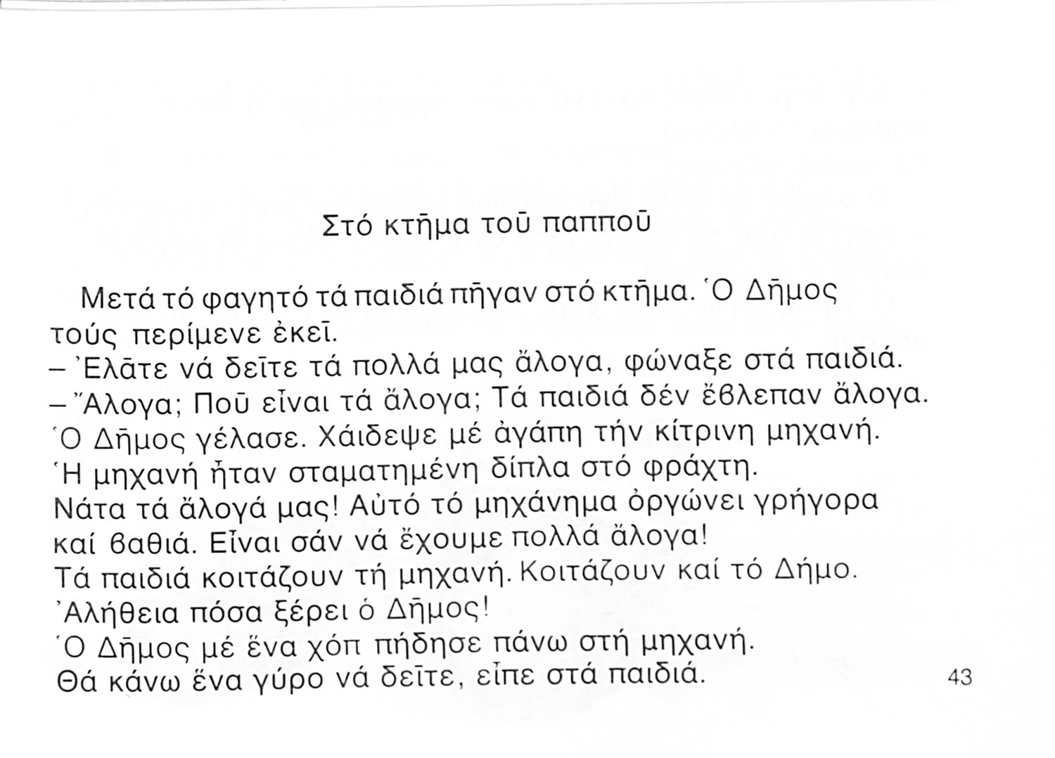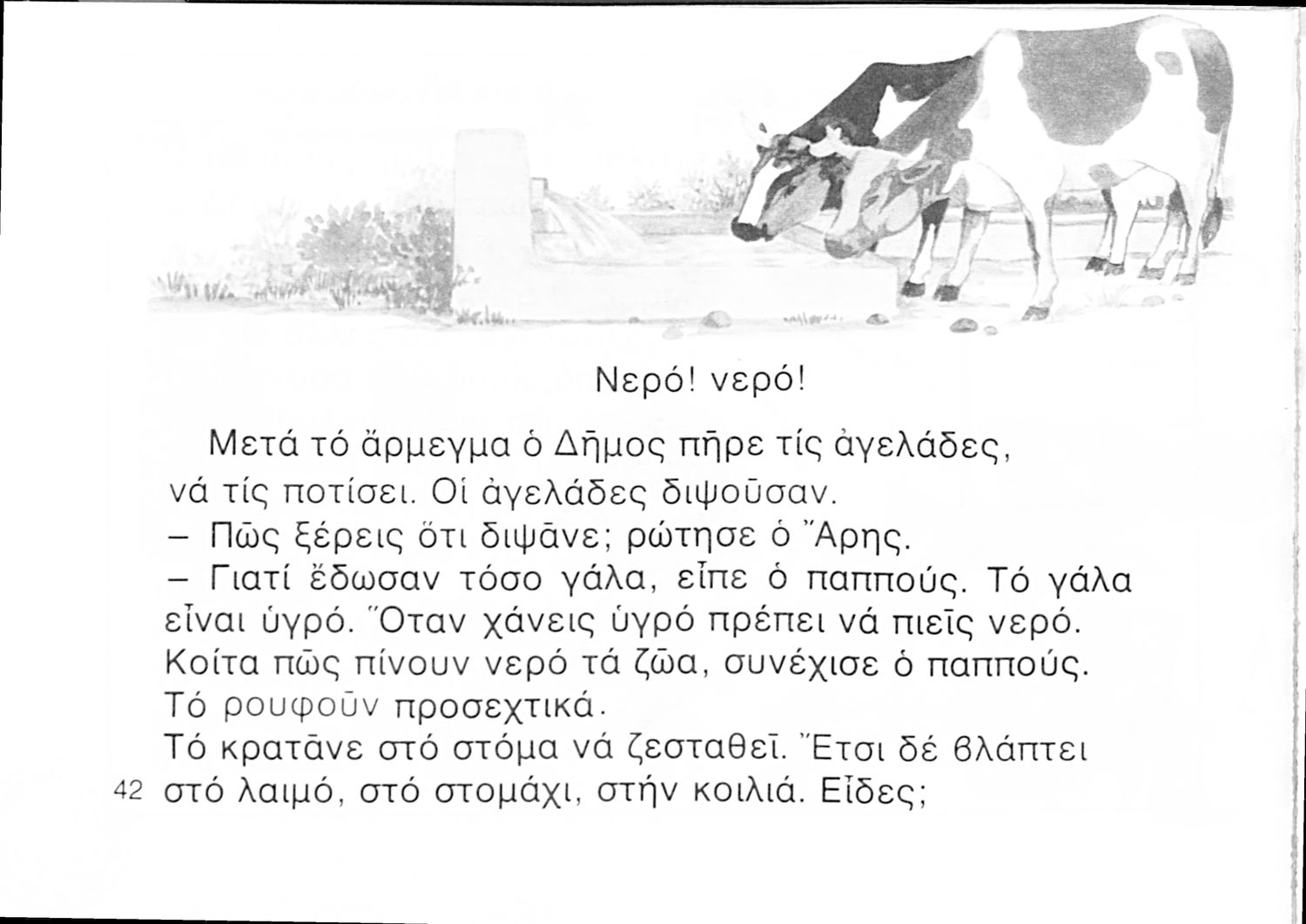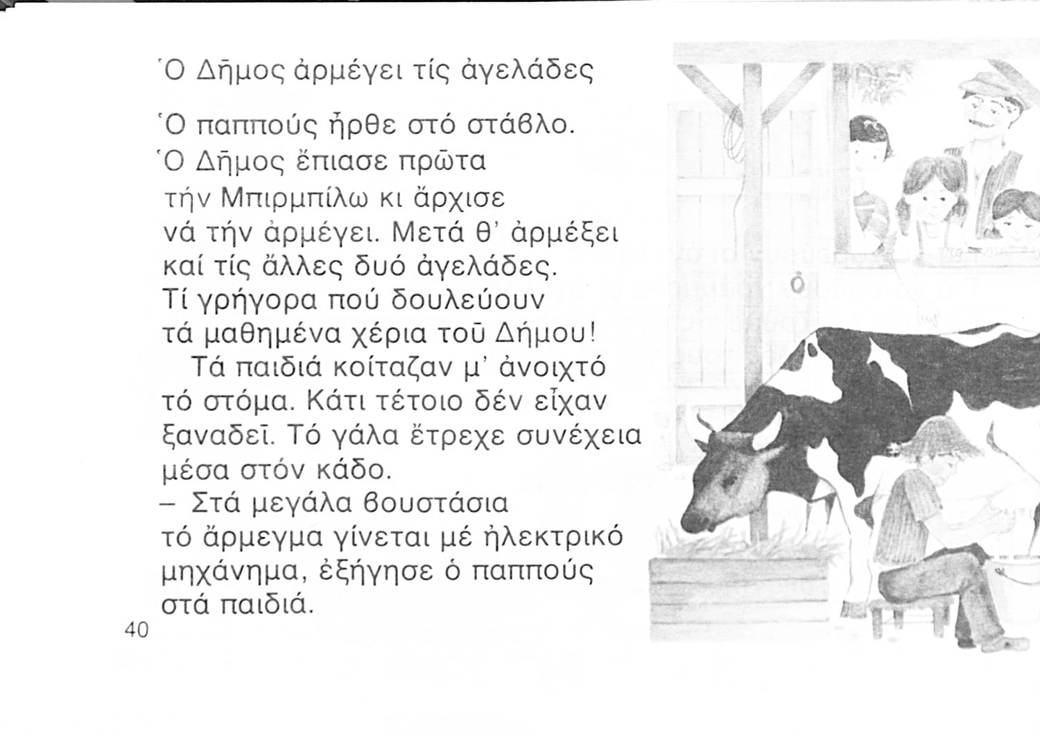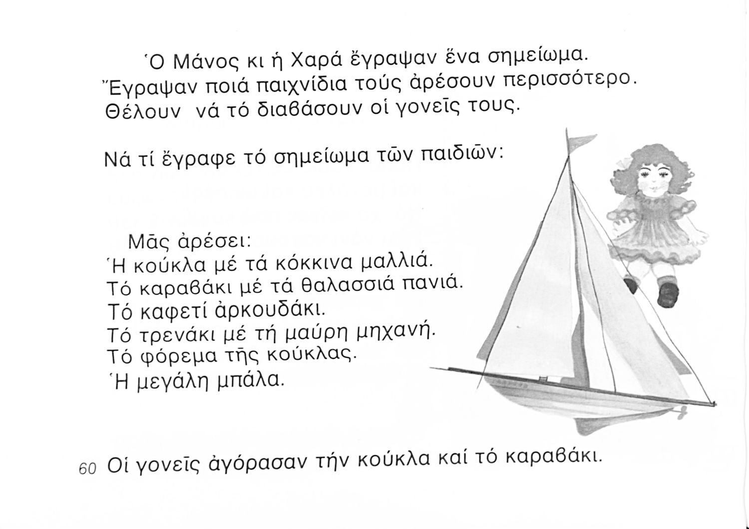 Αναγνωστικό Α΄ Δημοτικού που περιέχει γράμματα, συλλαβές, λέξεις, προτάσεις και κείμενα εμπνευσμένα από την οικογενειακή και κοινωνική ζωή του τόπου. Φέρει το σύμβολο της δικτατορίας.