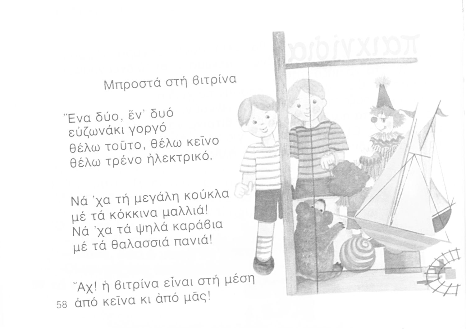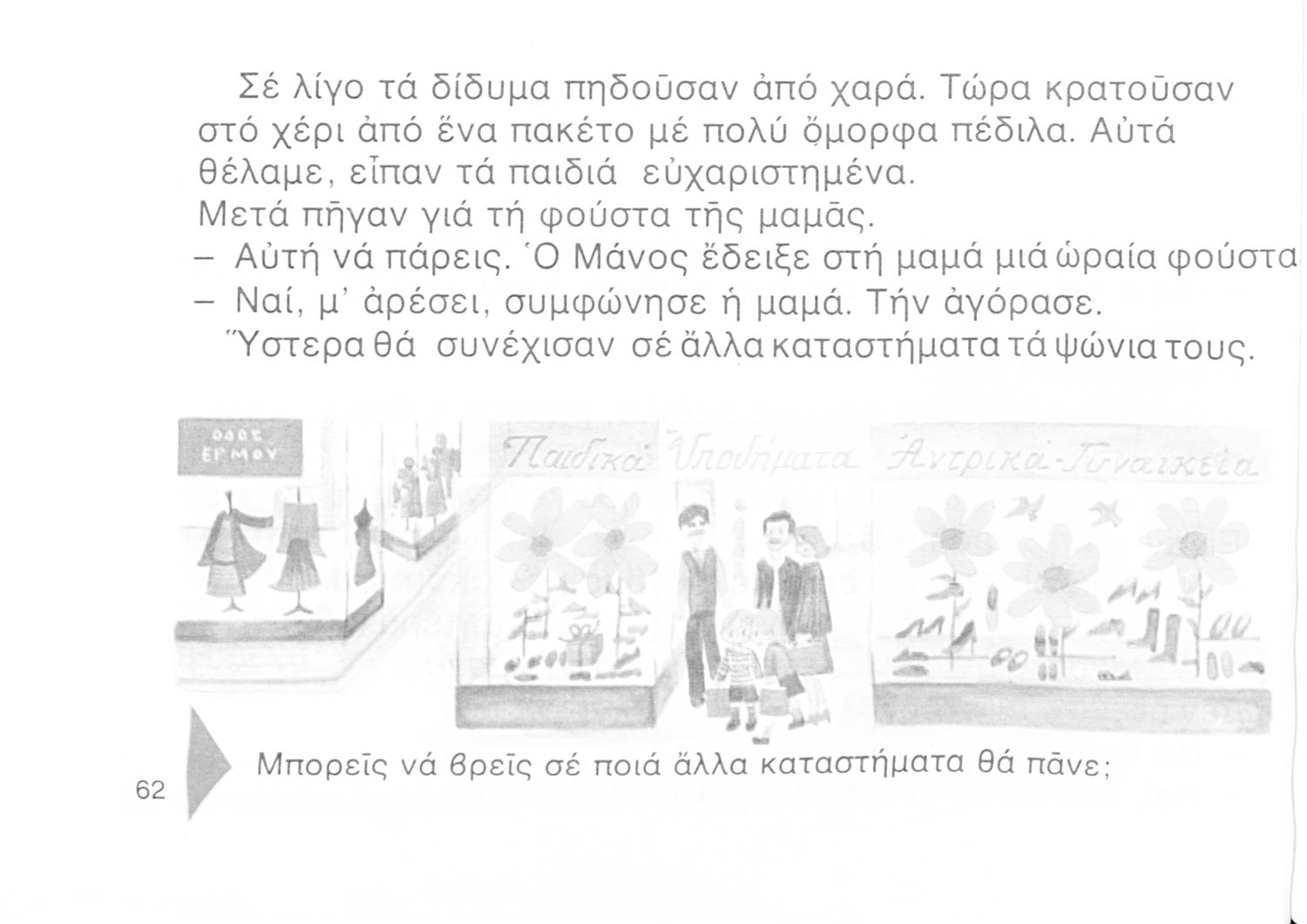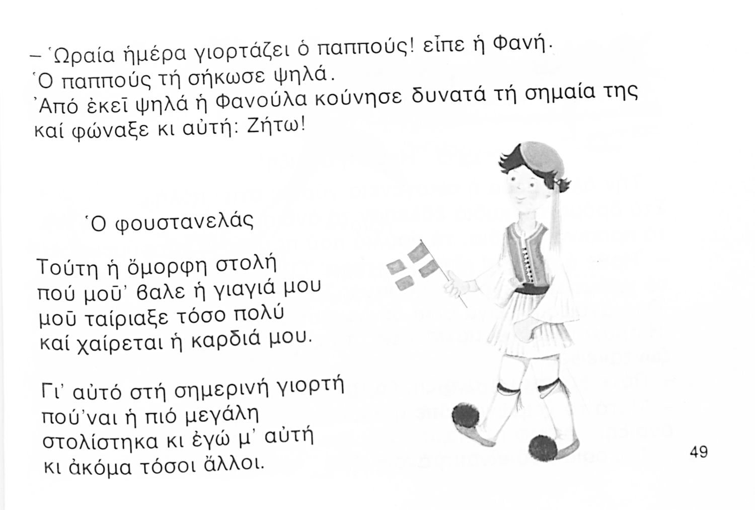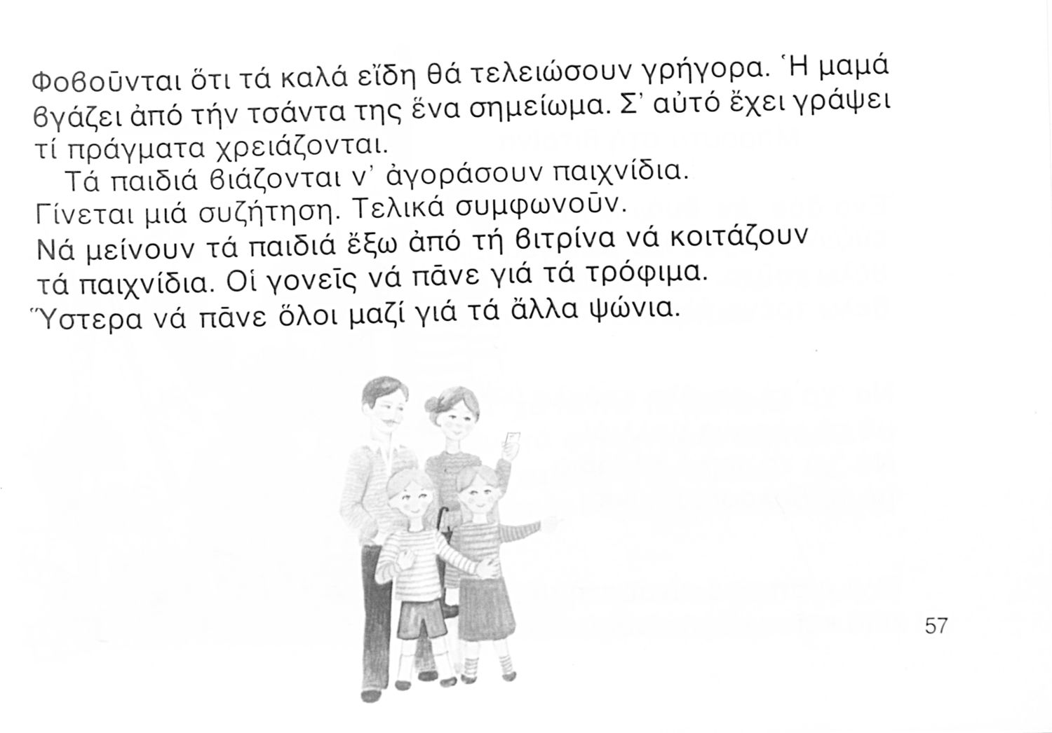 Αναγνωστικό Α΄ Δημοτικού που περιέχει γράμματα, συλλαβές, λέξεις, προτάσεις και κείμενα εμπνευσμένα από την οικογενειακή και κοινωνική ζωή του τόπου. Φέρει το σύμβολο της δικτατορίας.