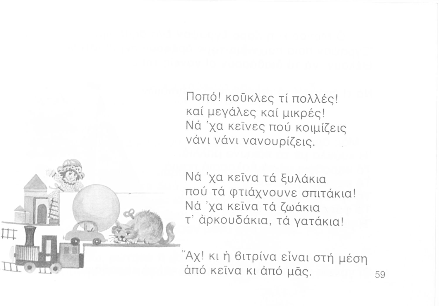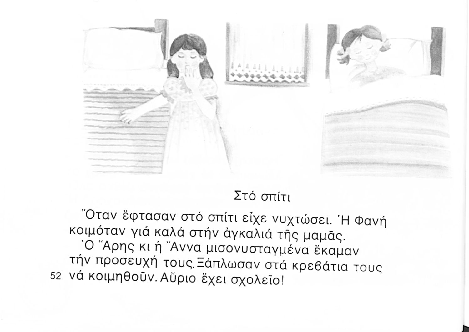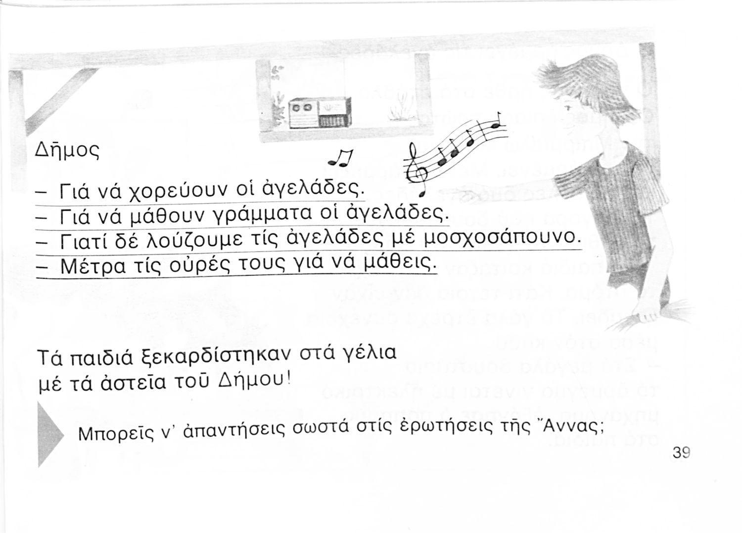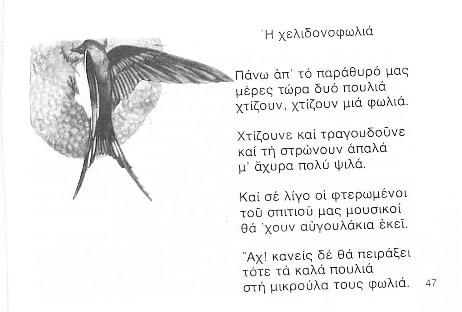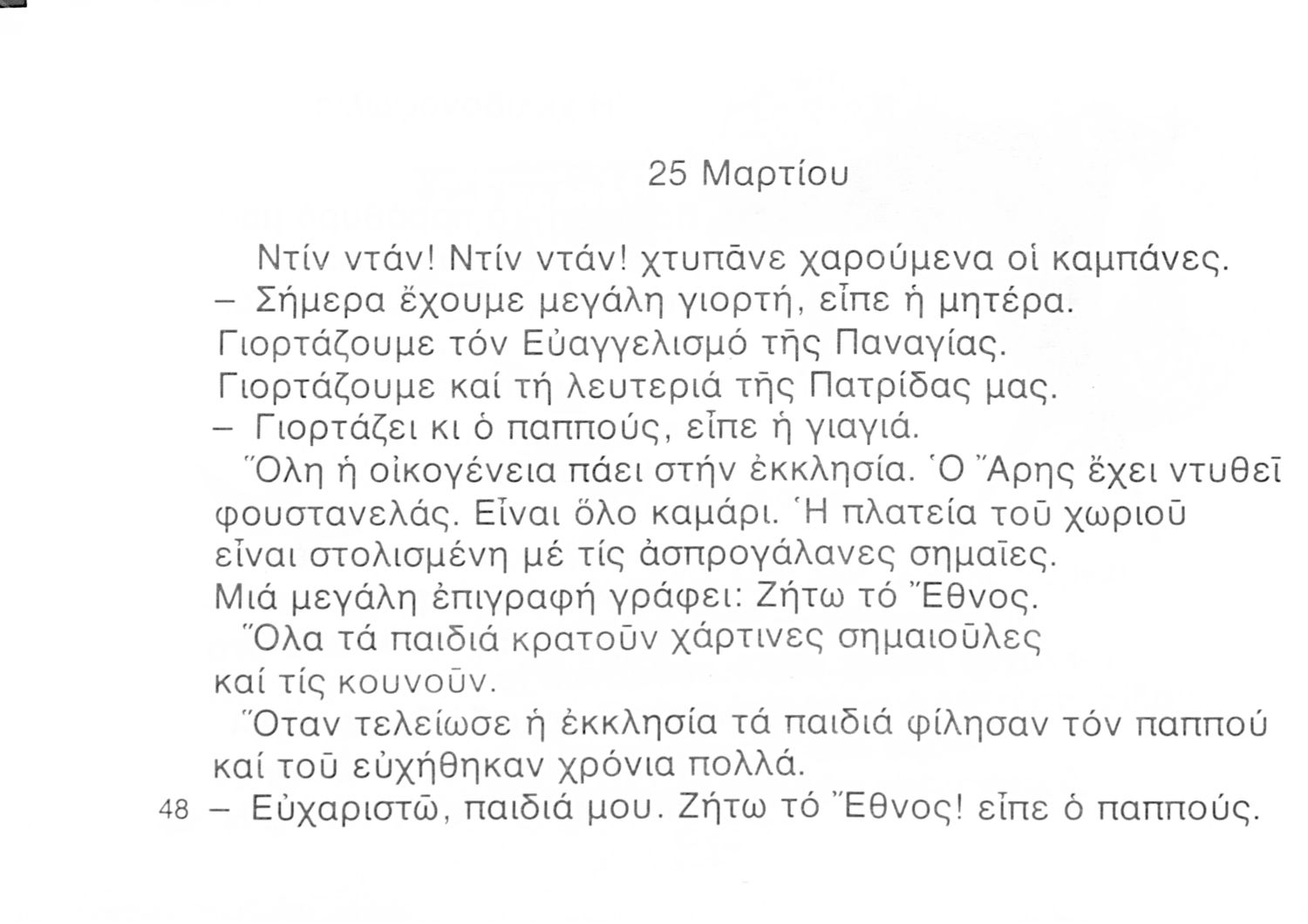 Αναγνωστικό Α΄ Δημοτικού που περιέχει γράμματα, συλλαβές, λέξεις, προτάσεις και κείμενα εμπνευσμένα από την οικογενειακή και κοινωνική ζωή του τόπου. Φέρει το σύμβολο της δικτατορίας.