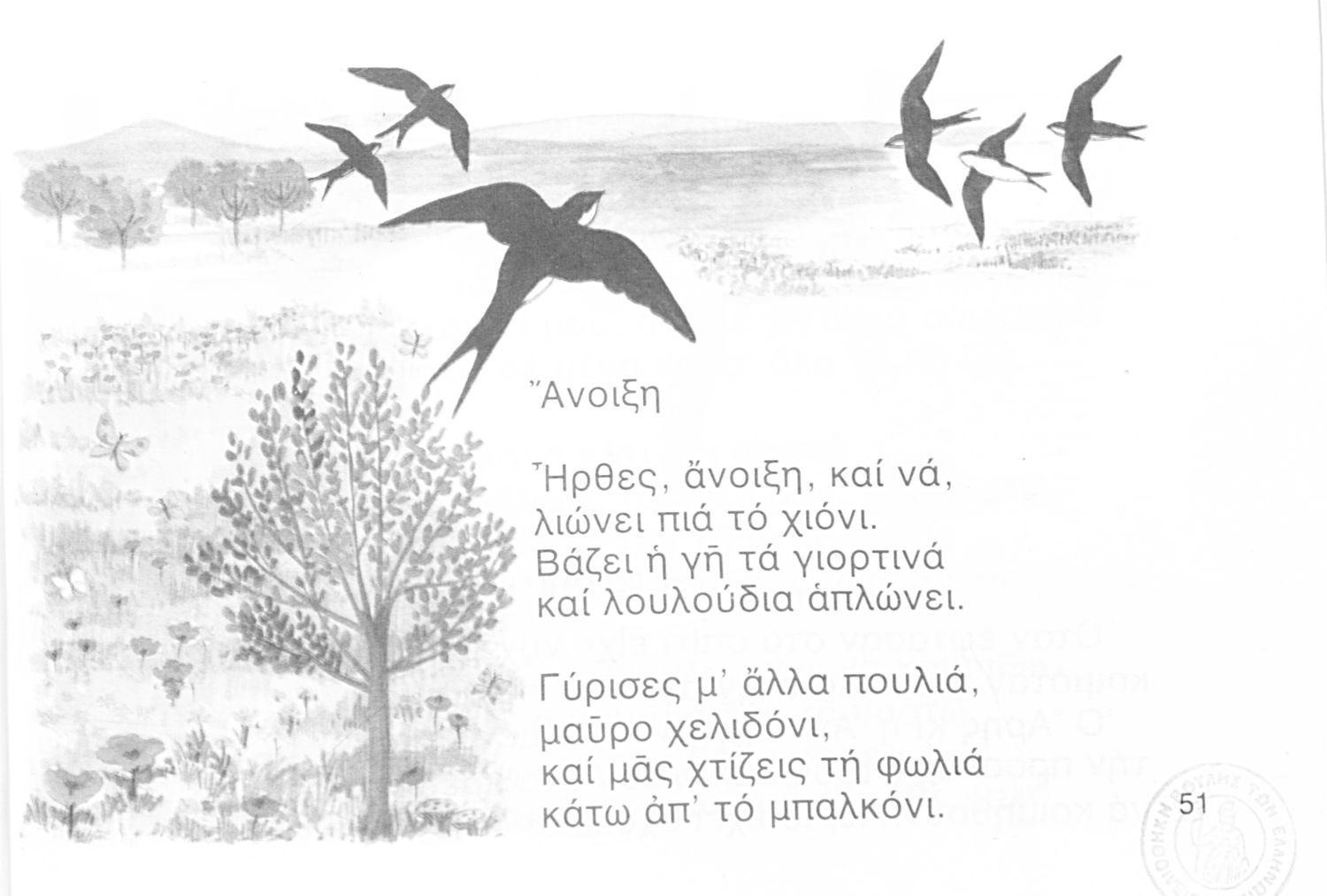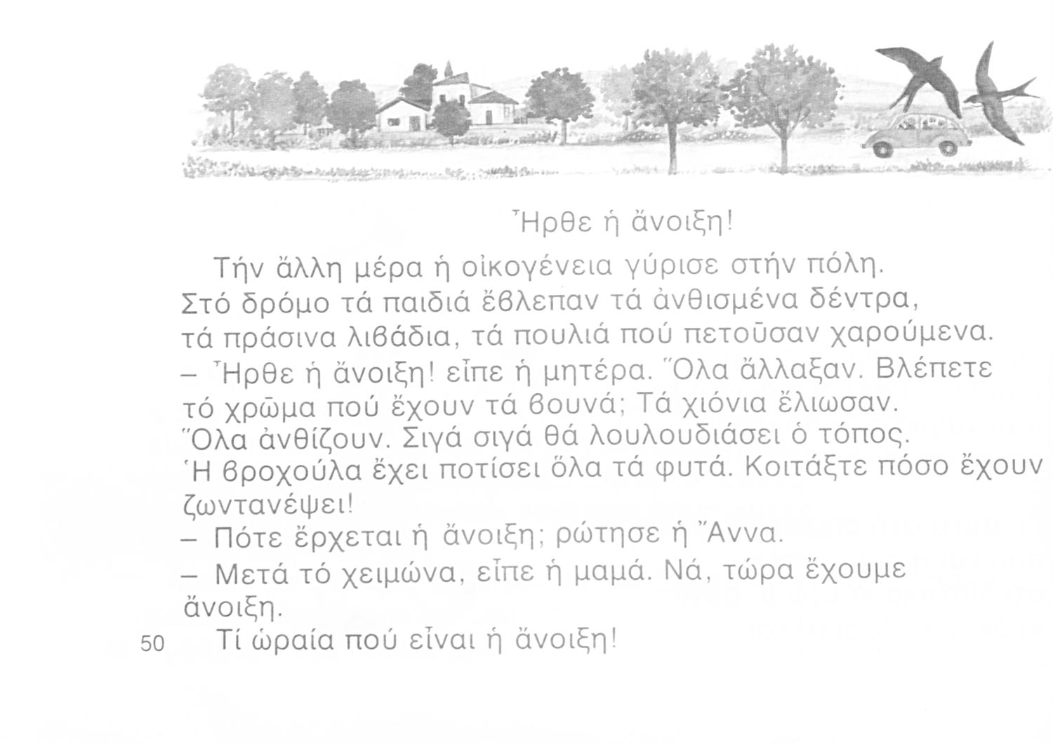 Αναγνωστικό Α΄ Δημοτικού που περιέχει λέξεις, προτάσεις και σύντομα κείμενα Ελλήνων συγγραφέων τα οποία αντλούν τα θέματά τους από την καθημερινή ζωή των ανθρώπων, την ελληνική ύπαιθρο, την αγροτική ζωή και τον οικογενειακό περίγυρο.