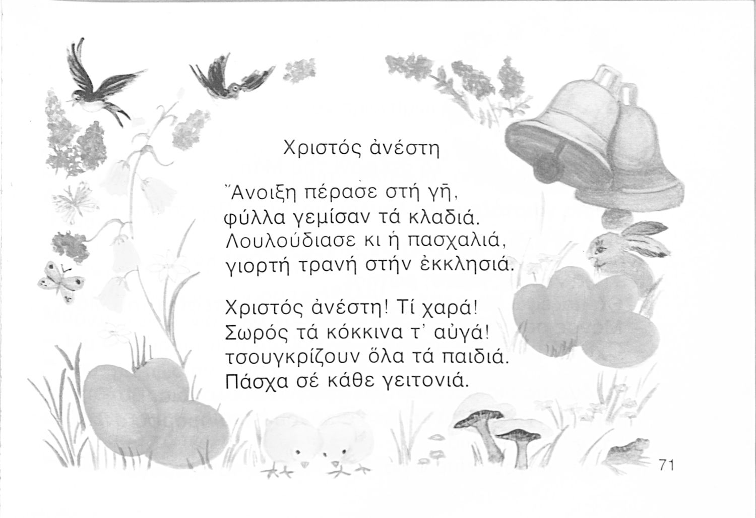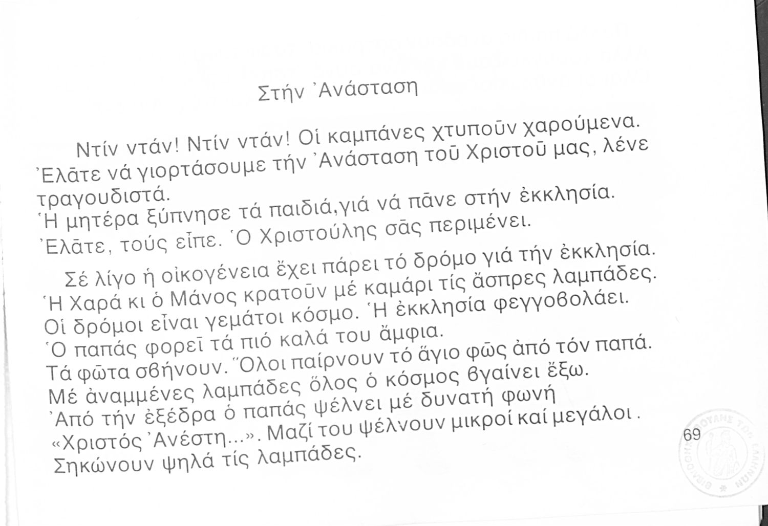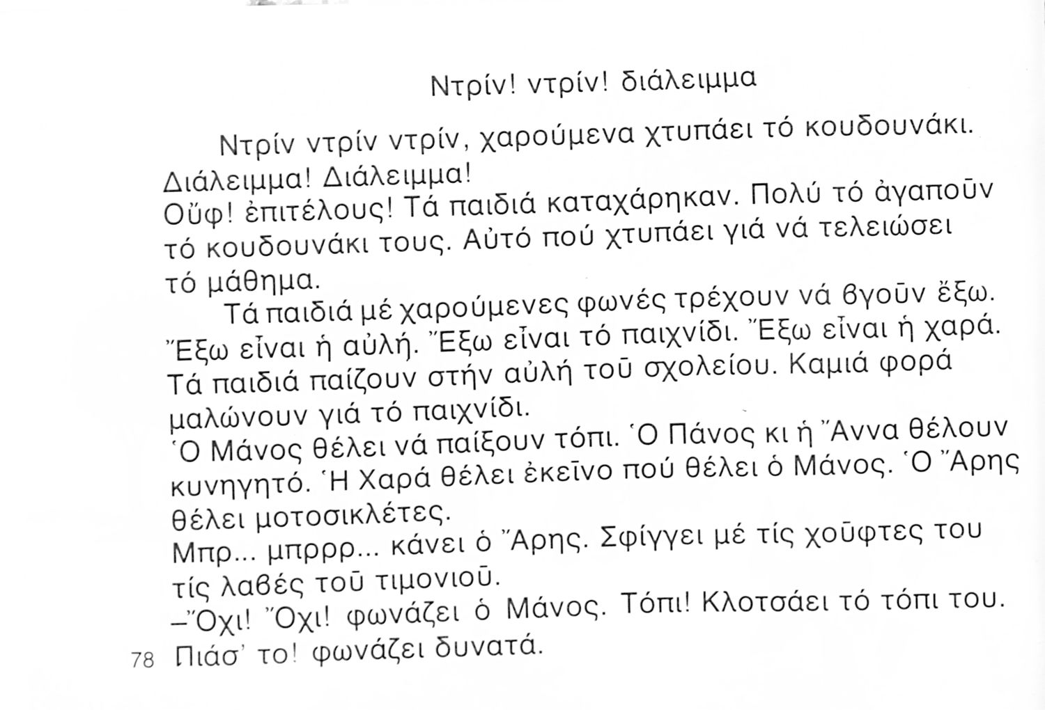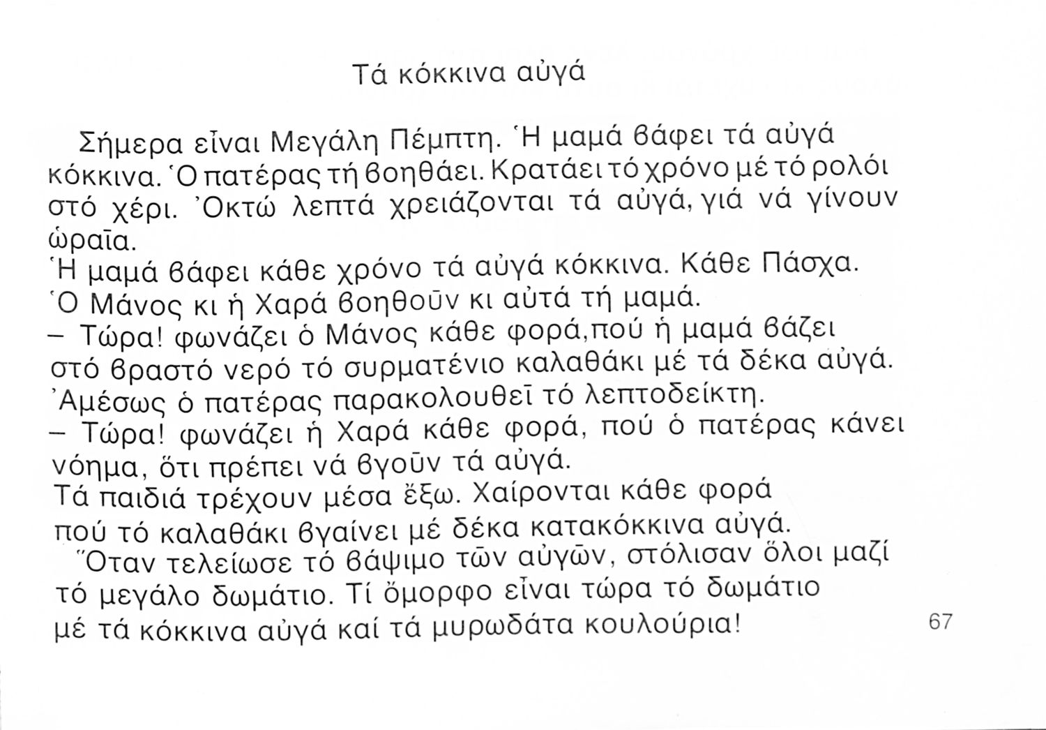 Αναγνωστικό Α΄ Δημοτικού που περιέχει γράμματα, συλλαβές, λέξεις, προτάσεις και κείμενα εμπνευσμένα από την οικογενειακή και κοινωνική ζωή του τόπου. Φέρει το σύμβολο της δικτατορίας.