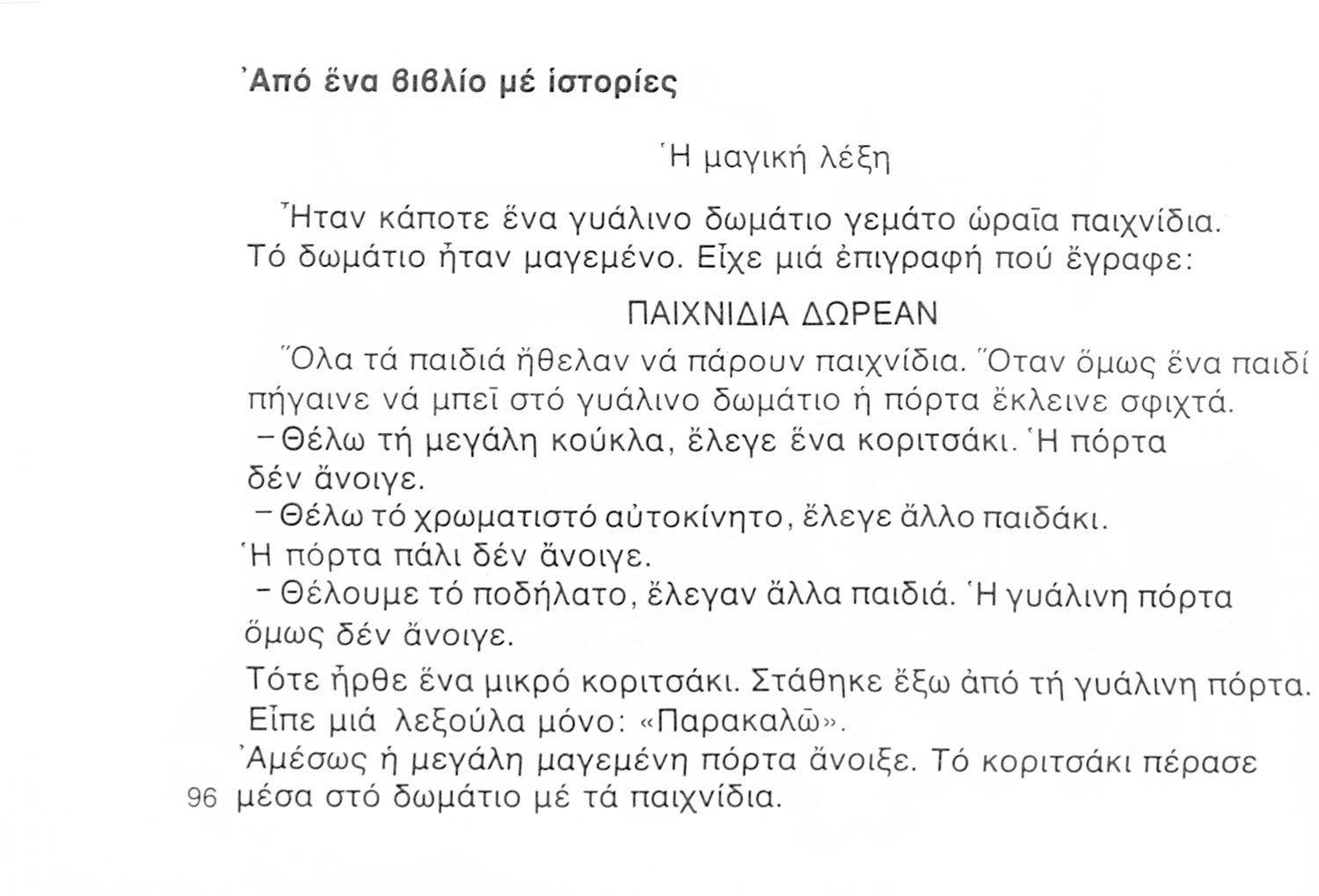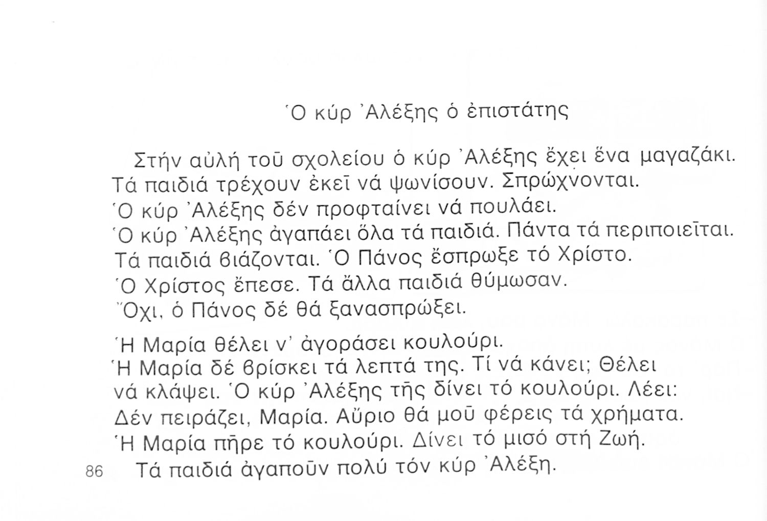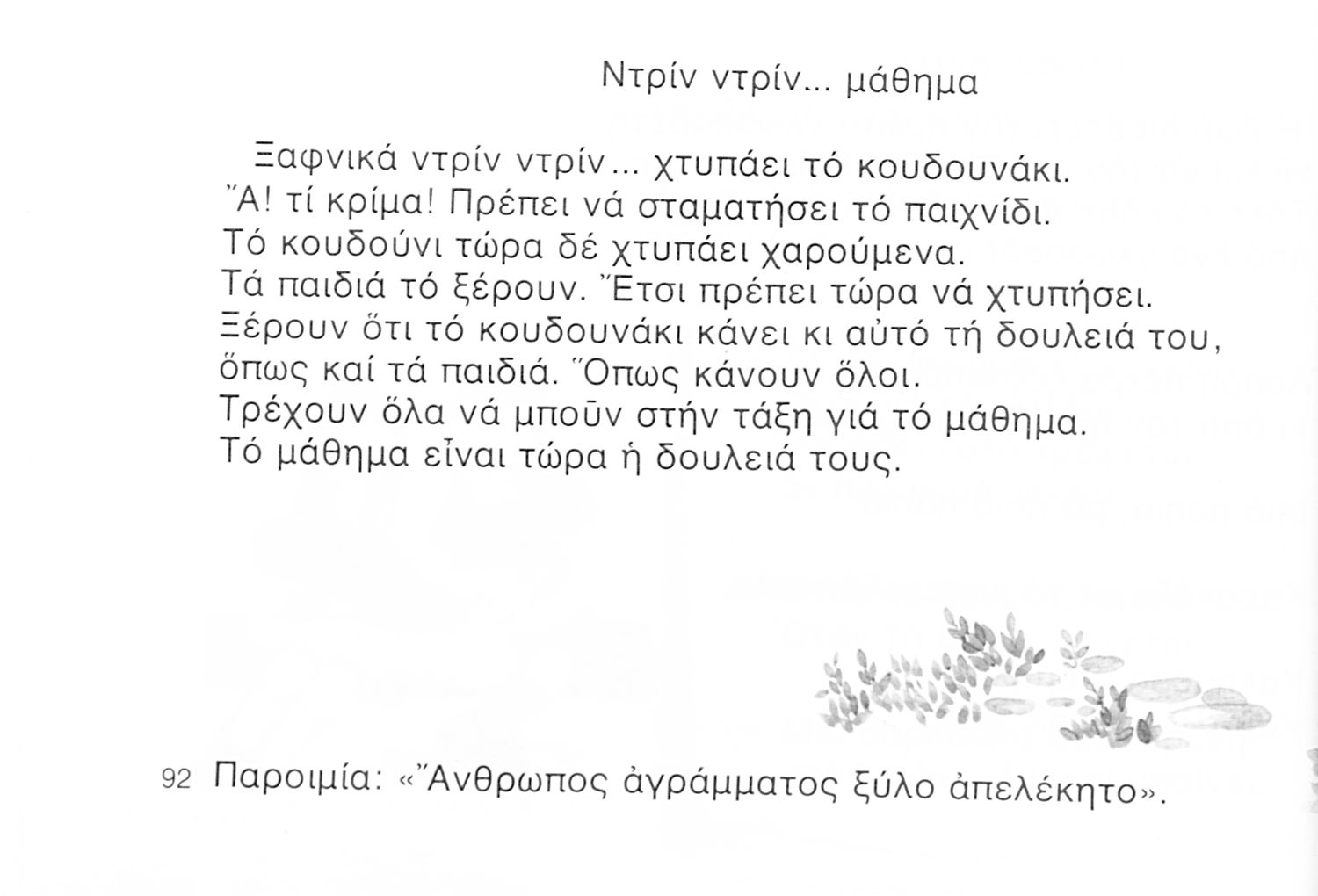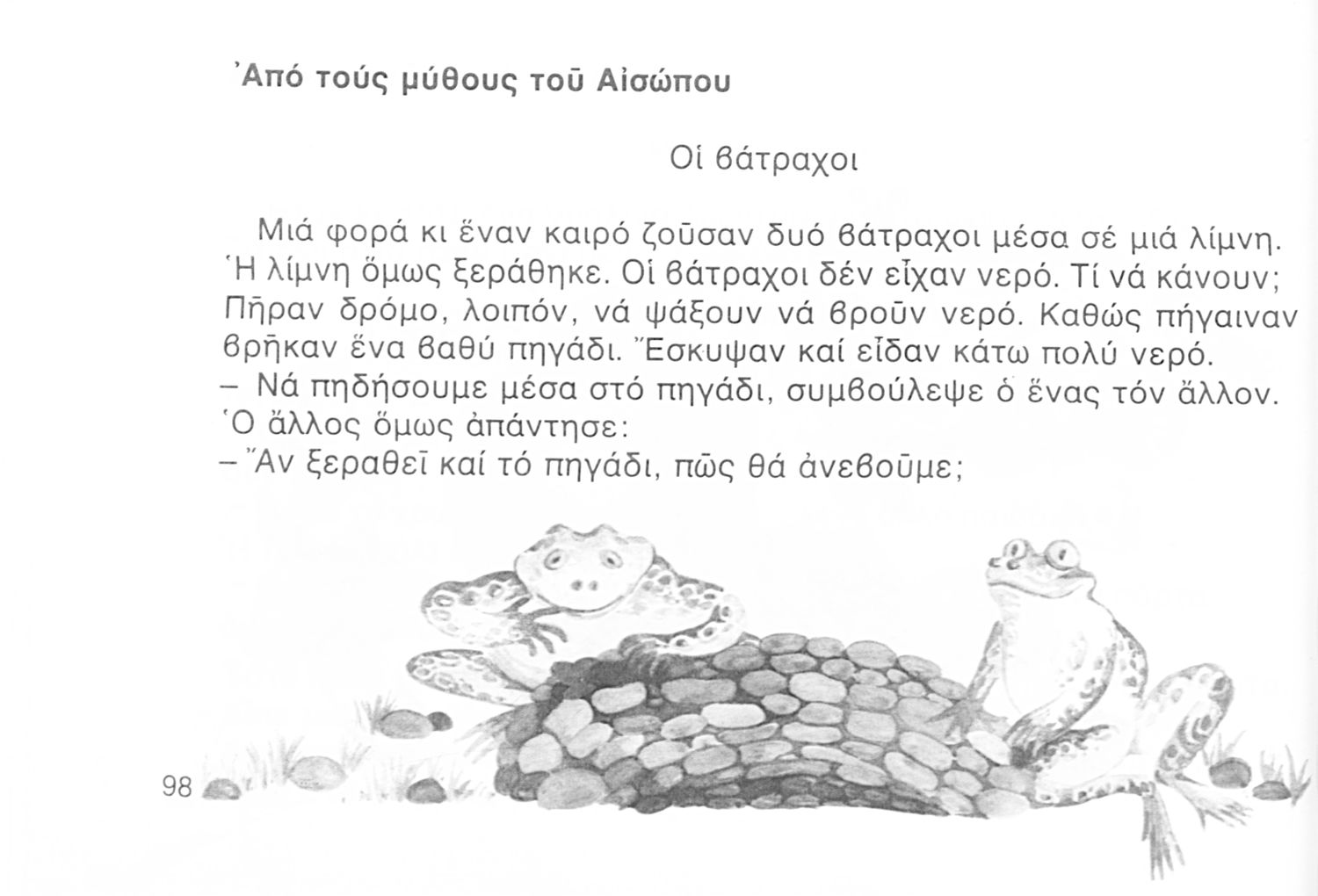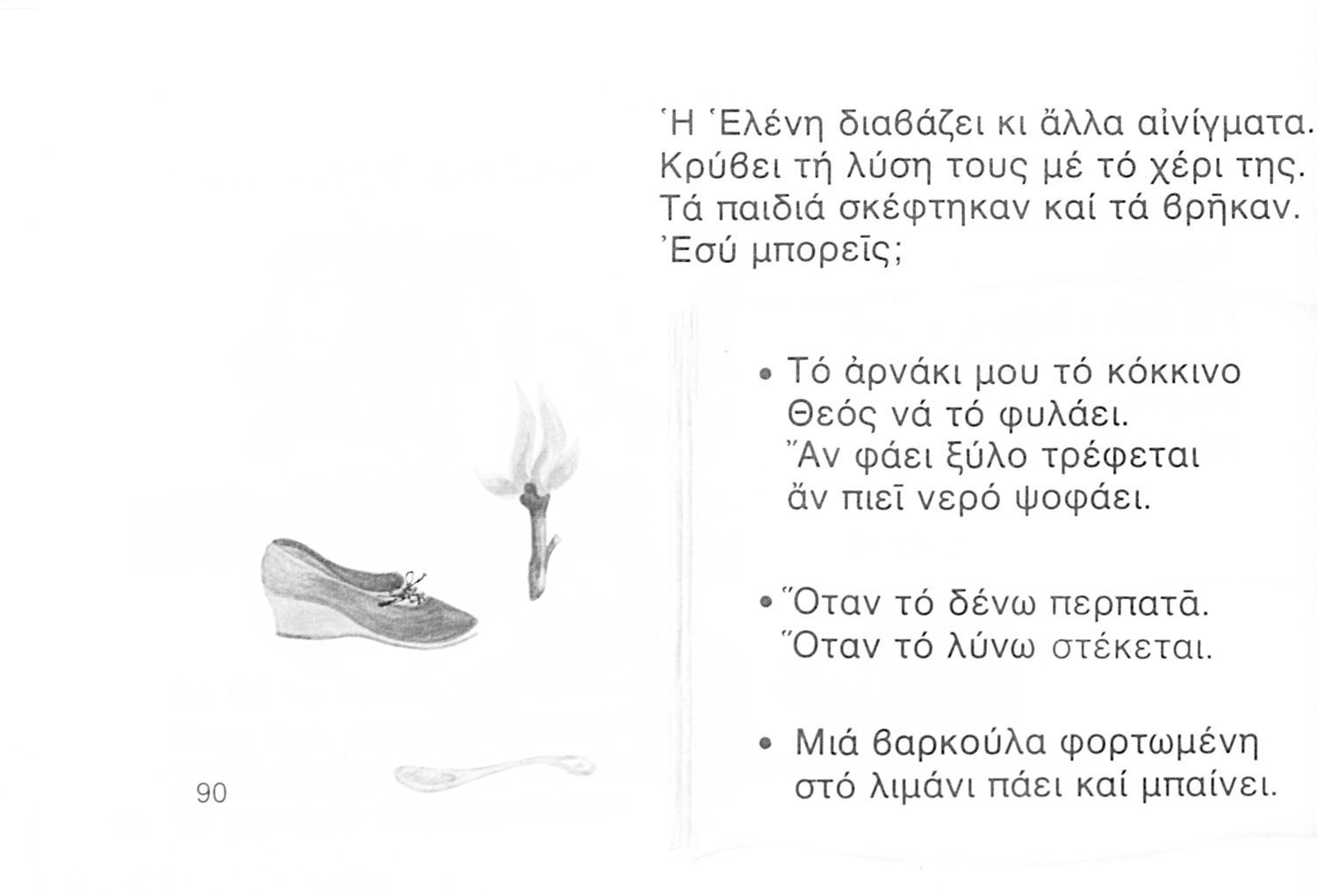 Αναγνωστικό Α΄ Δημοτικού που περιέχει λέξεις, προτάσεις και σύντομα κείμενα Ελλήνων συγγραφέων τα οποία αντλούν τα θέματά τους από την καθημερινή ζωή των ανθρώπων, την ελληνική ύπαιθρο, την αγροτική ζωή και τον οικογενειακό περίγυρο.
