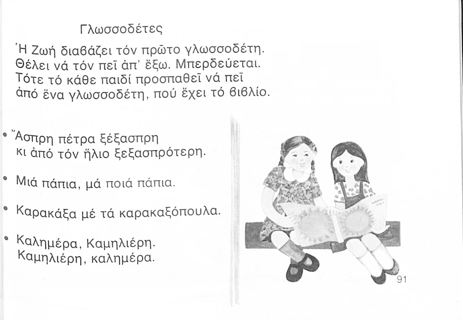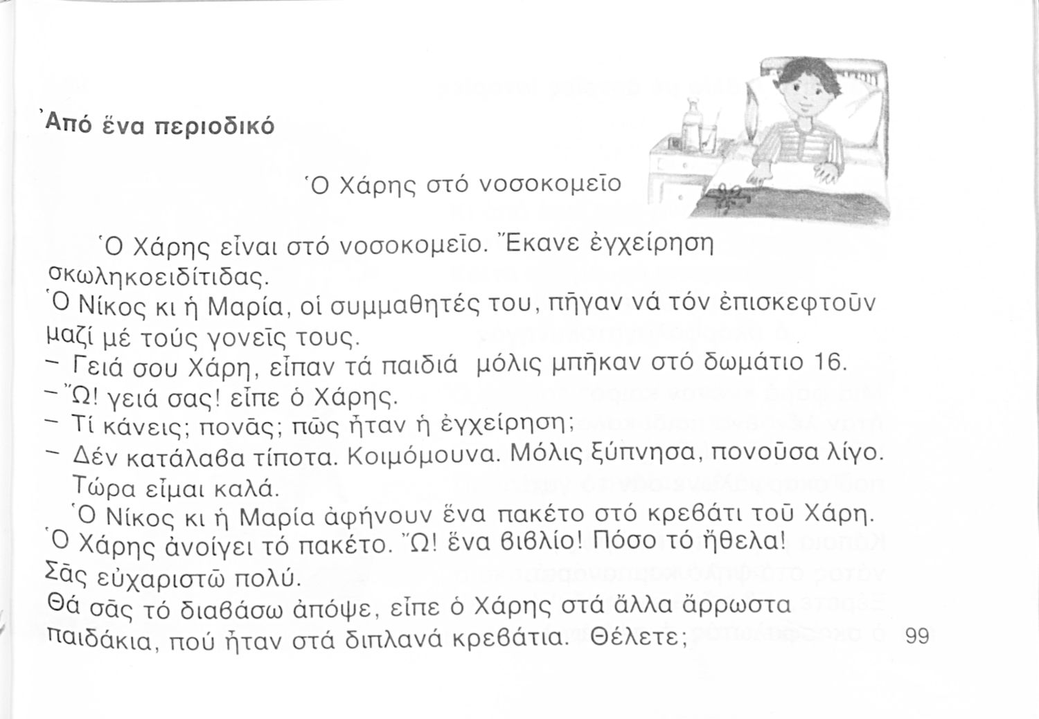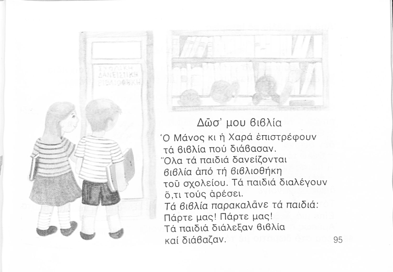 Βαθμίδα εκπαίδευσης: Πρωτοβάθμια Τάξη: Α' Δημοτικού Μάθημα: Νέα Ελληνικά Γλώσσα: Δημοτική Παρουσίαση περιεχομένου: Αναγνωστικό Α΄ Δημοτικού που περιέχει λέξεις, προτάσεις και σύντομα κείμενα Ελλήνων συγγραφέων τα οποία αντλούν τα θέματά τους από την καθημερινή ζωή των ανθρώπων, την ελληνική ύπαιθρο, την αγροτική ζωή και τον οικογενειακό περίγυρο. |