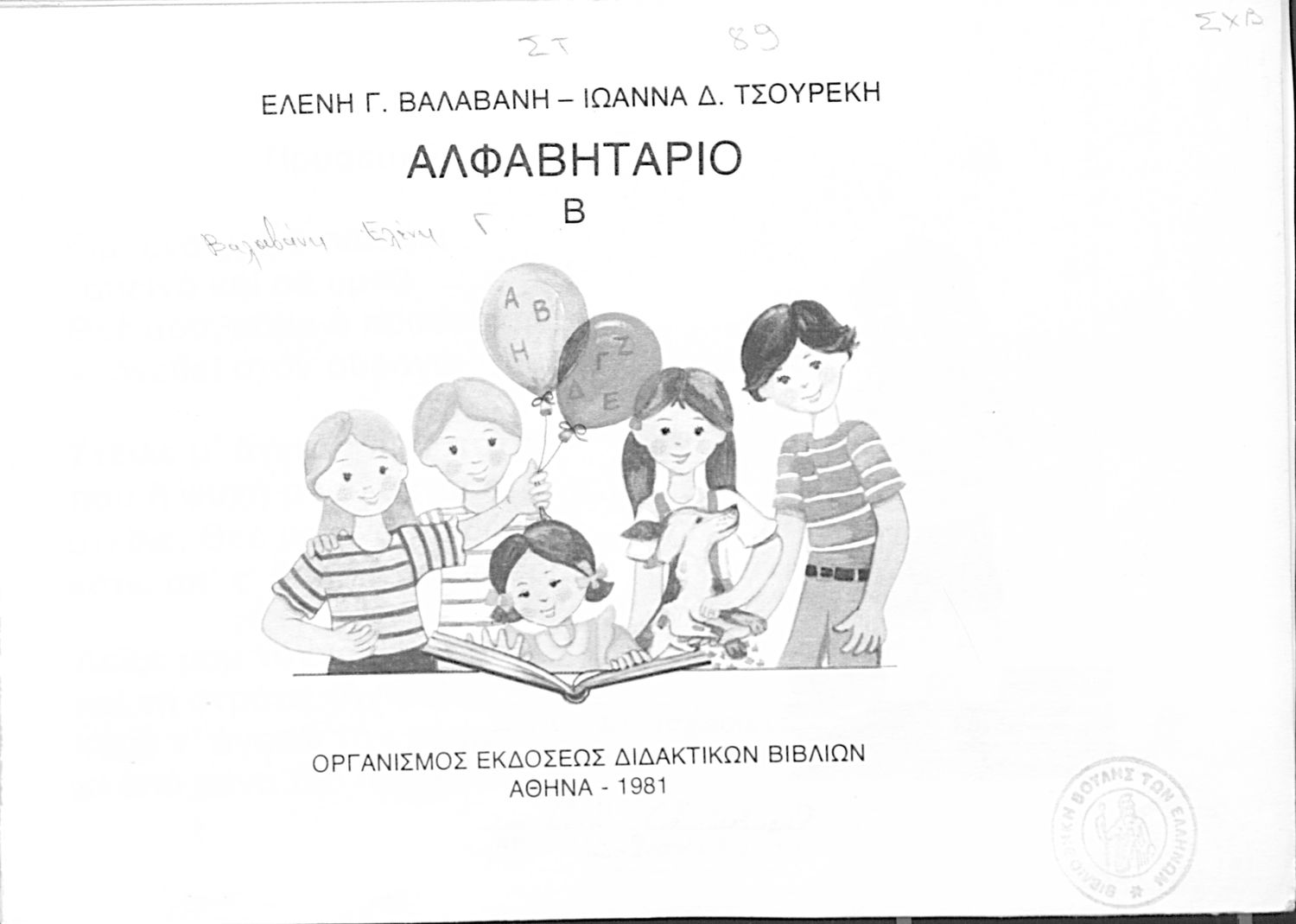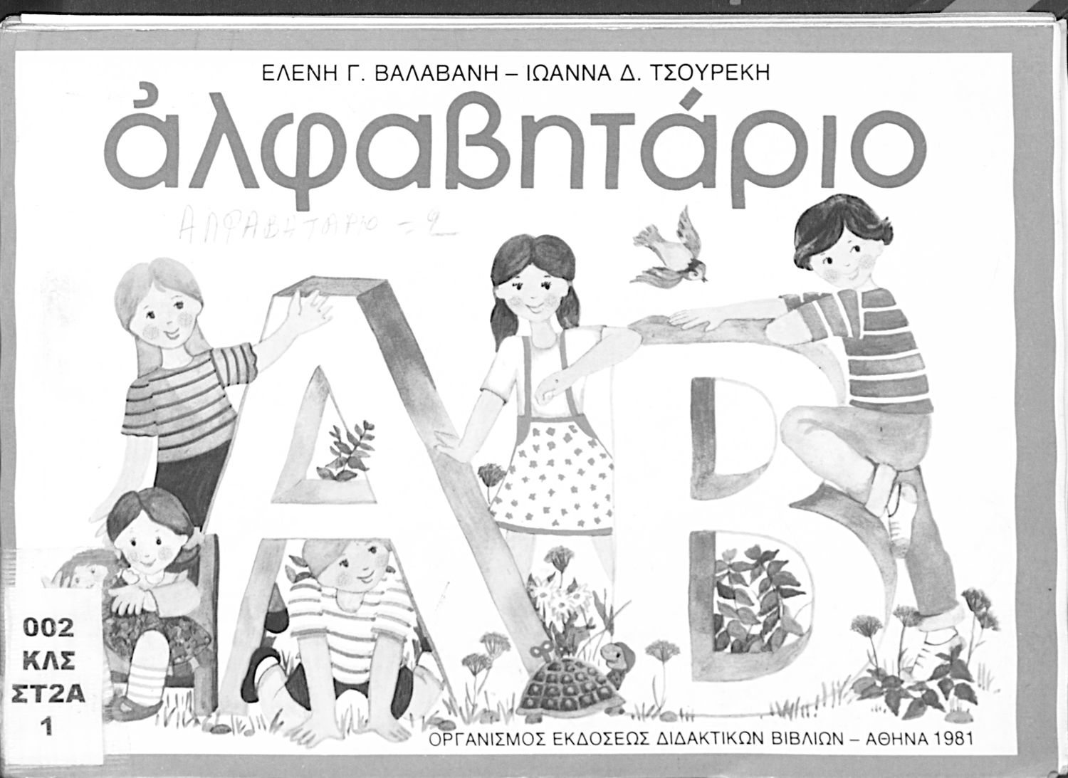 Αναγνωστικό [Α΄ ] Δημοτικού που περιλαμβάνει τα γράμματα, συλλαβές, λέξεις, και ασκήσεις συλλαβισμού.