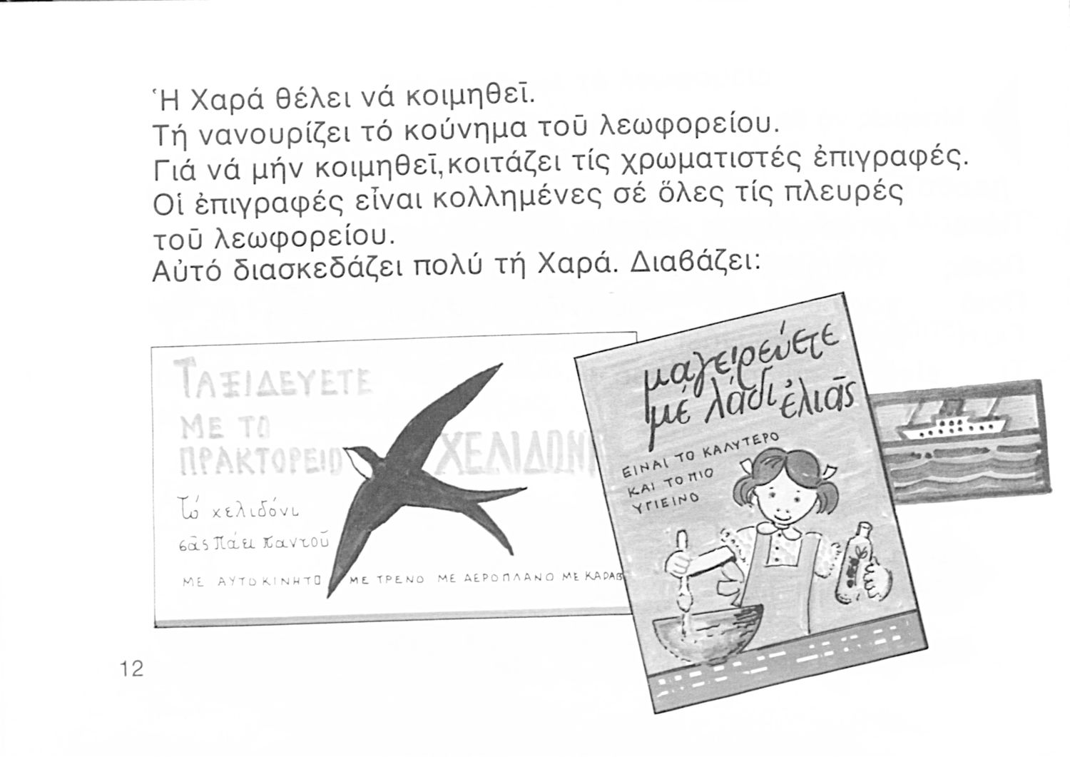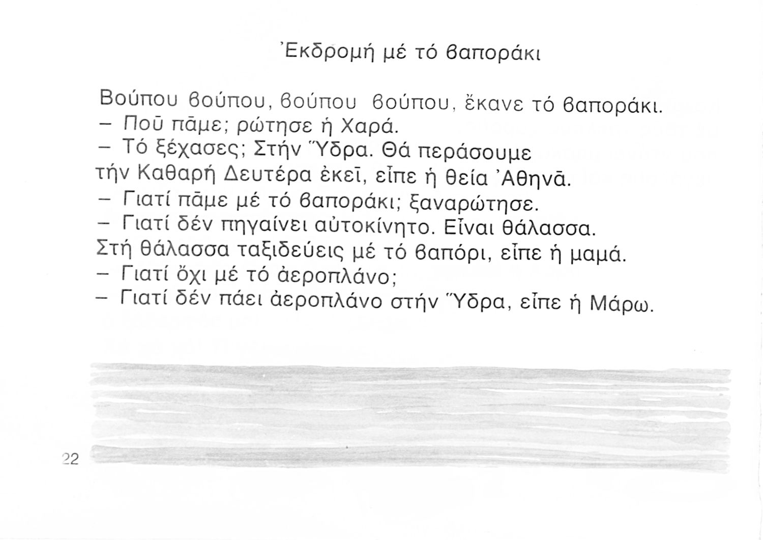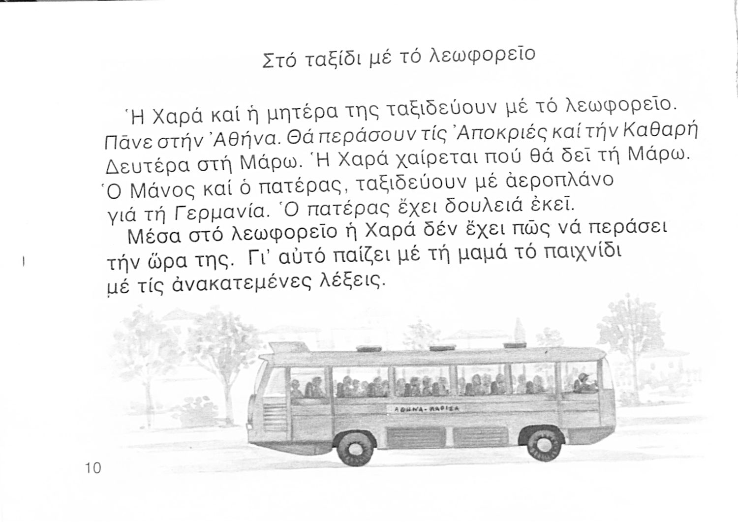 Αναγνωστικό Α΄ Δημοτικού που περιέχει γράμματα, συλλαβές, λέξεις, προτάσεις και κείμενα εμπνευσμένα από την οικογενειακή και κοινωνική ζωή του τόπου. Φέρει το σύμβολο της δικτατορίας.