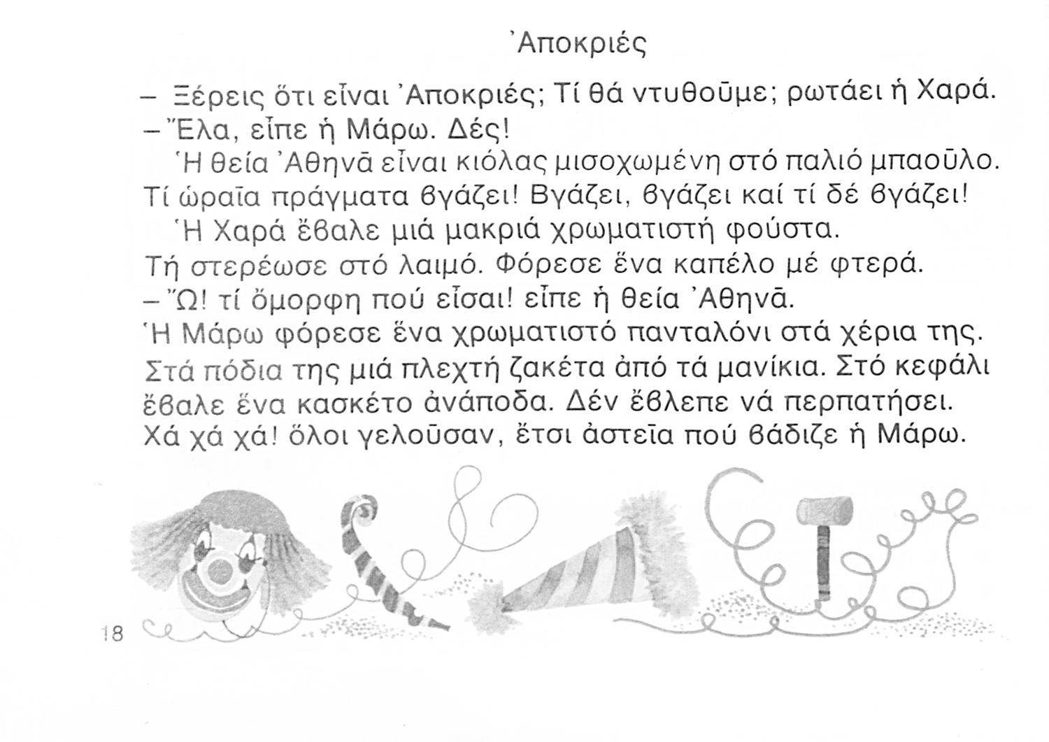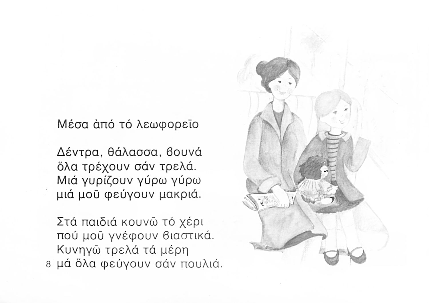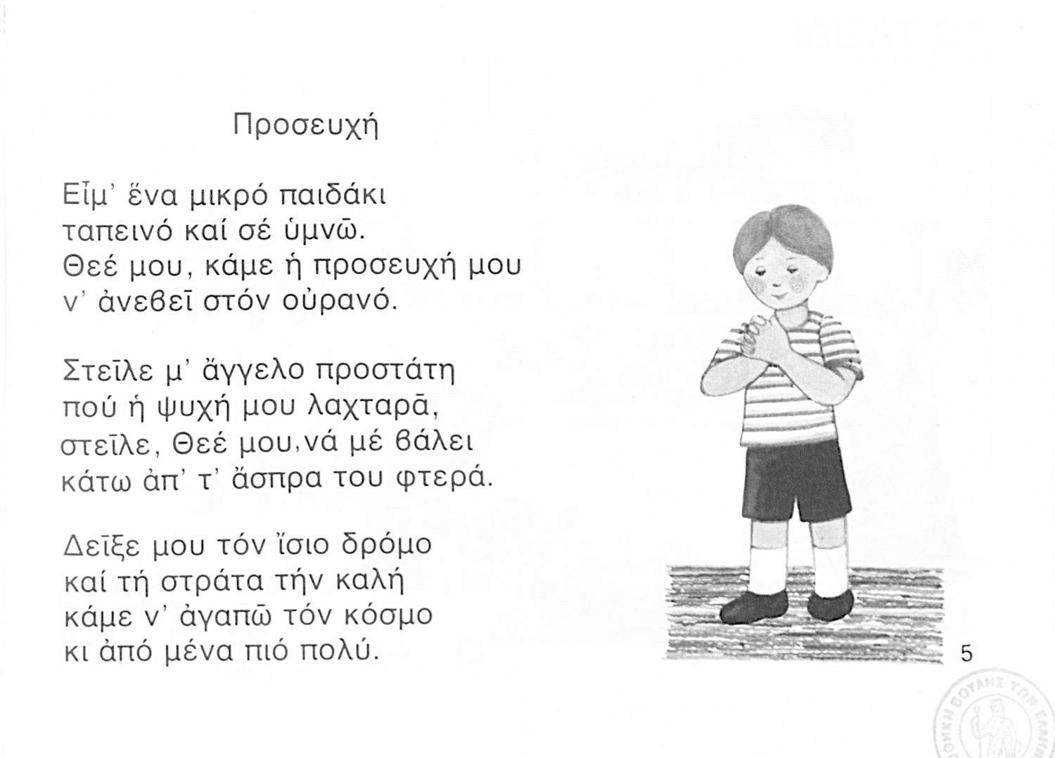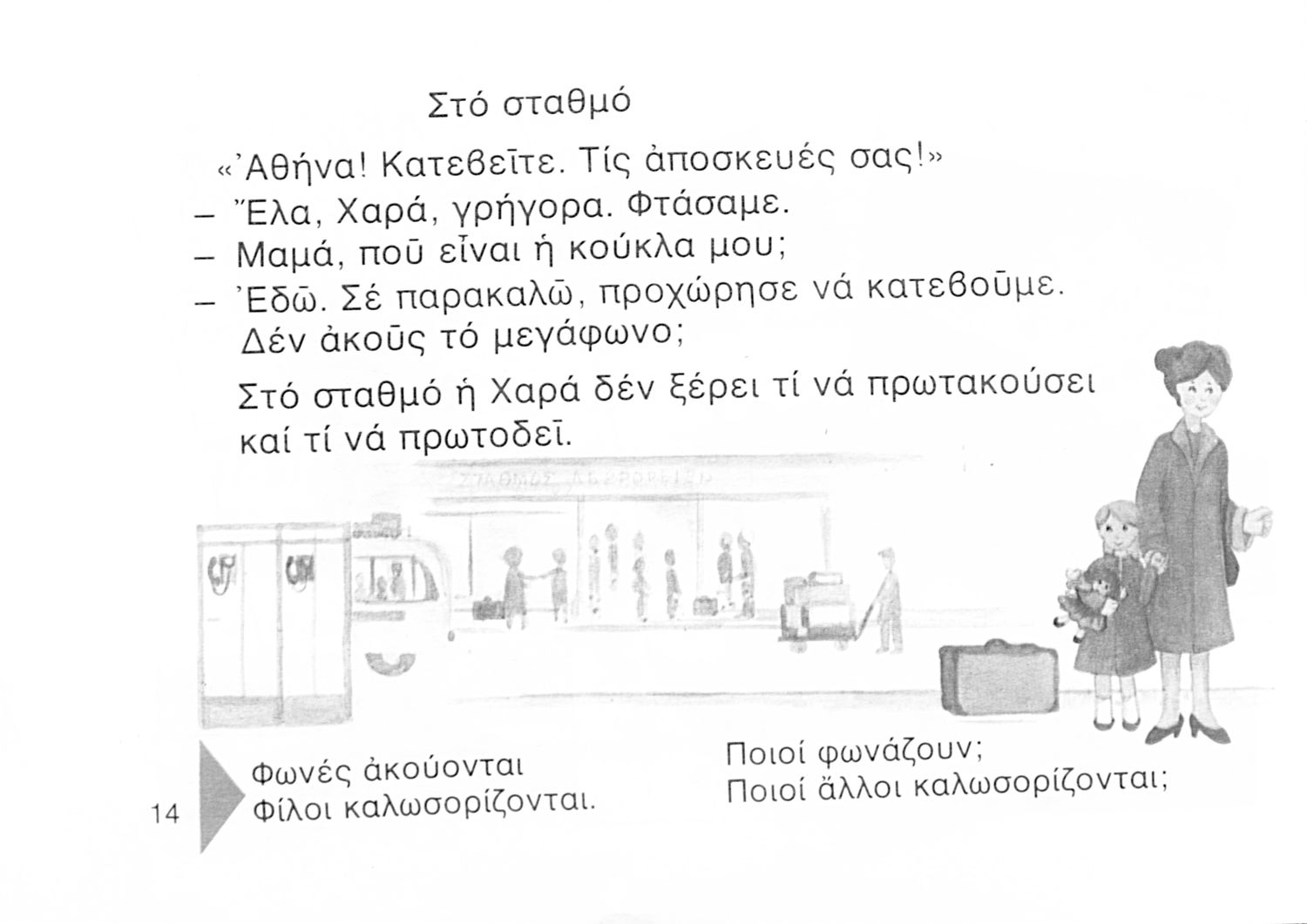 Αναγνωστικό Α΄ Δημοτικού που περιέχει γράμματα, συλλαβές, λέξεις, προτάσεις και κείμενα εμπνευσμένα από την οικογενειακή και κοινωνική ζωή του τόπου. Φέρει το σύμβολο της δικτατορίας.