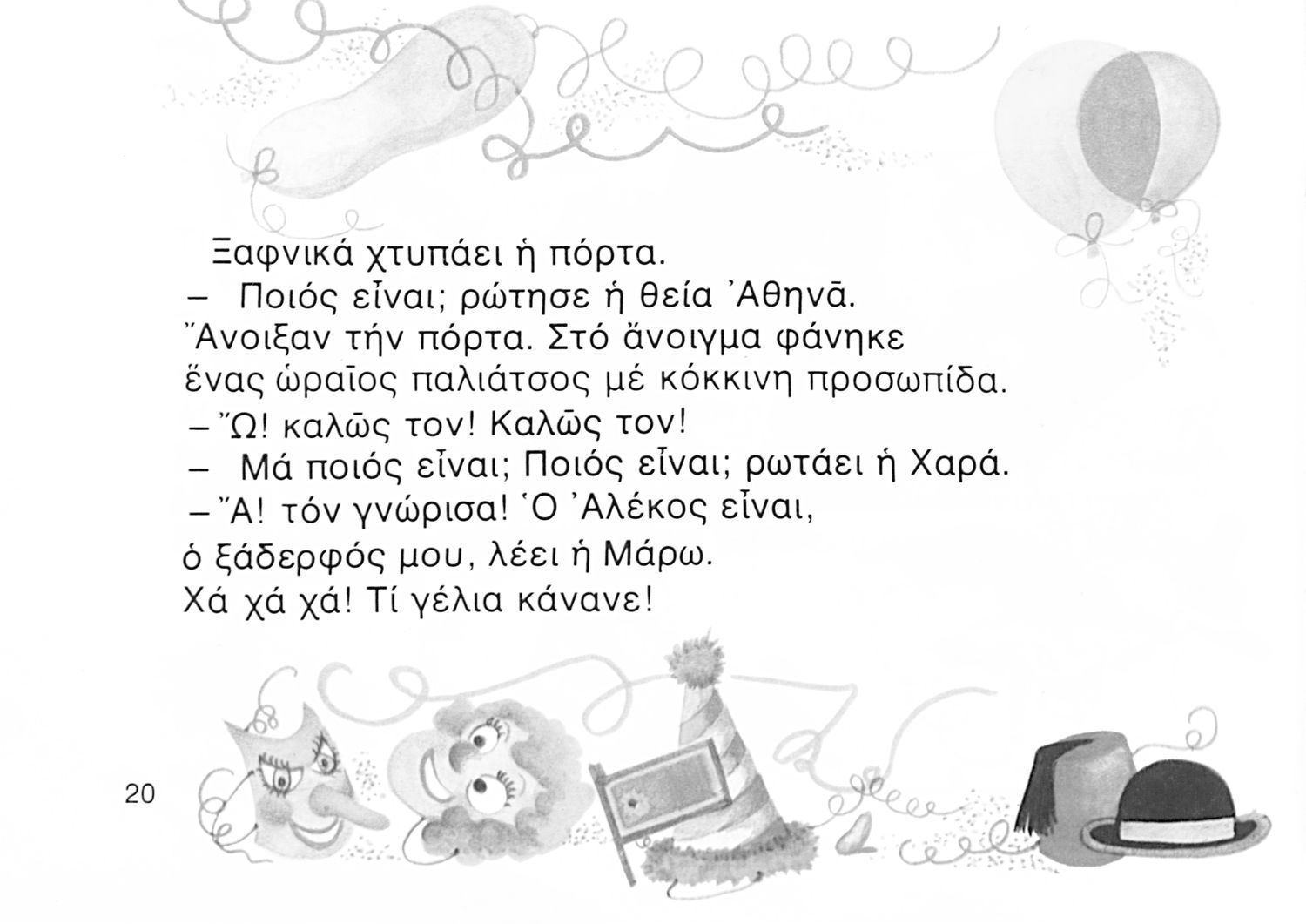 Αναγνωστικό Α΄ Δημοτικού που περιέχει ποιήματα και πεζά με σκηνές και προκρίνει τις αξίες της καλοσύνης, της υπευθυνότητας, της εργατικότητας, της αγάπης προς τα ζώα, αλλά και της διασκέδασης.