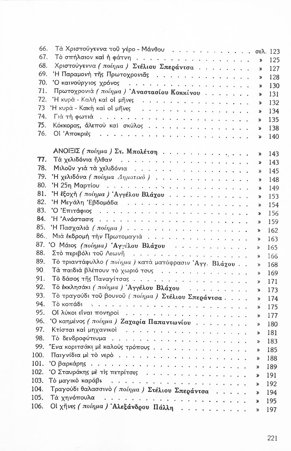 Αναγνωστικό Β' Δημοτικού που είναι χωρισμένο σύμφωνα με τις εποχές του χρόνου και περιλαμβάνει κείμενα ηθοποιητικού περιεχομένου εμπνευσμένα από τη θρησκευτική, εθνική, κοινωνική και οικογενειακή ζωή. Φέρει το
