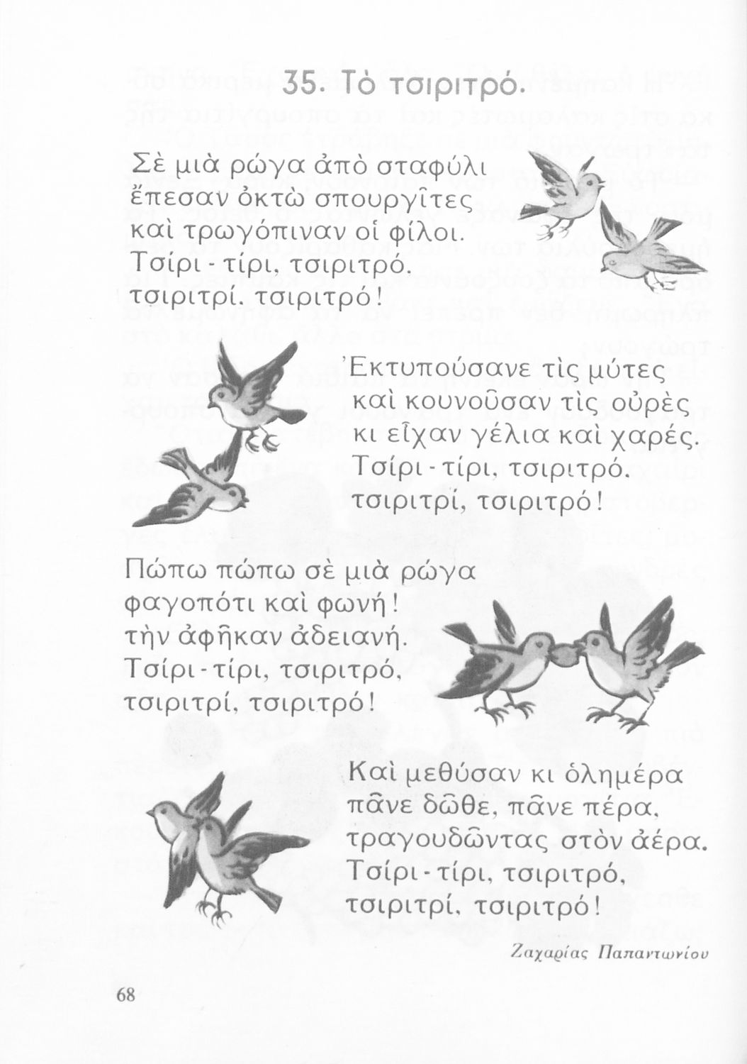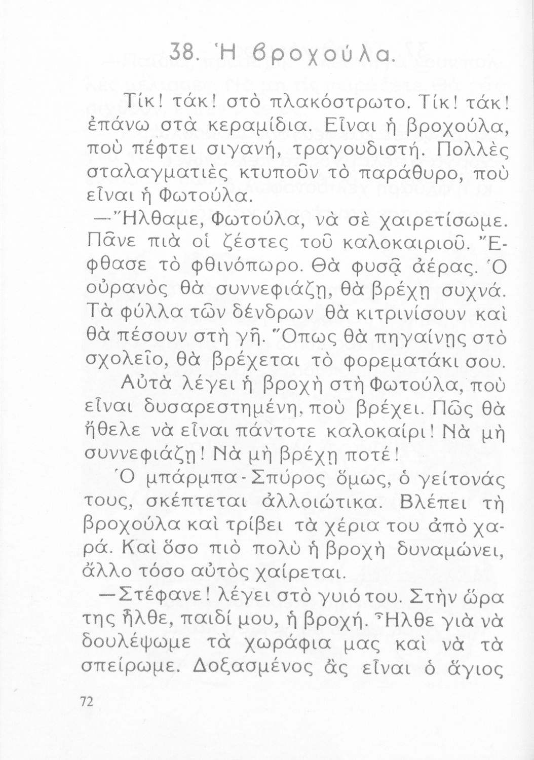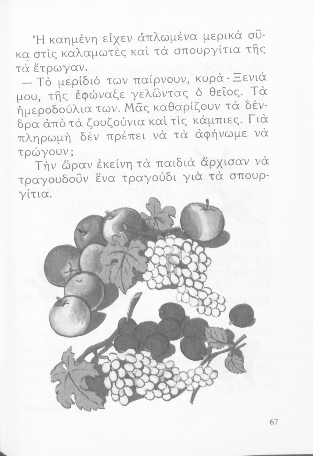Αναγνωστικό Β' Δημοτικού που περιλαμβάνει μικρά διηγήματα και ποιήματα με περιεχόμενο από την οικογενειακή και κοινωνική ζωή, την ελληνική φύση, την ελληνική ιστορία και μυθολογία και την υγιεινή.