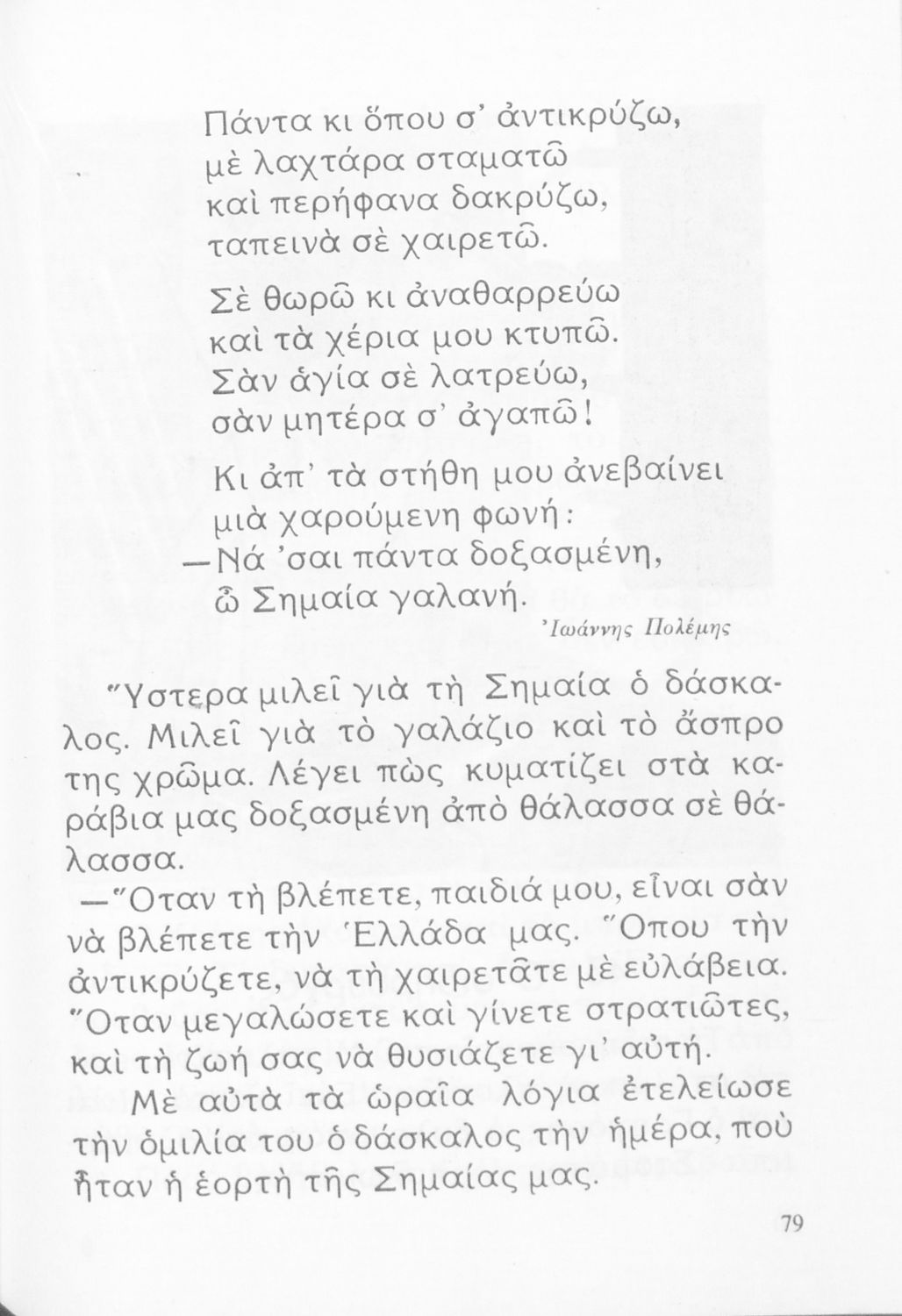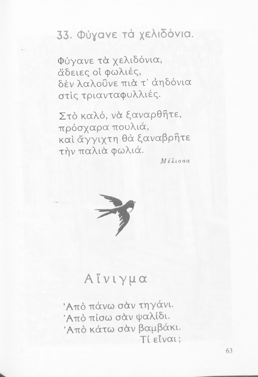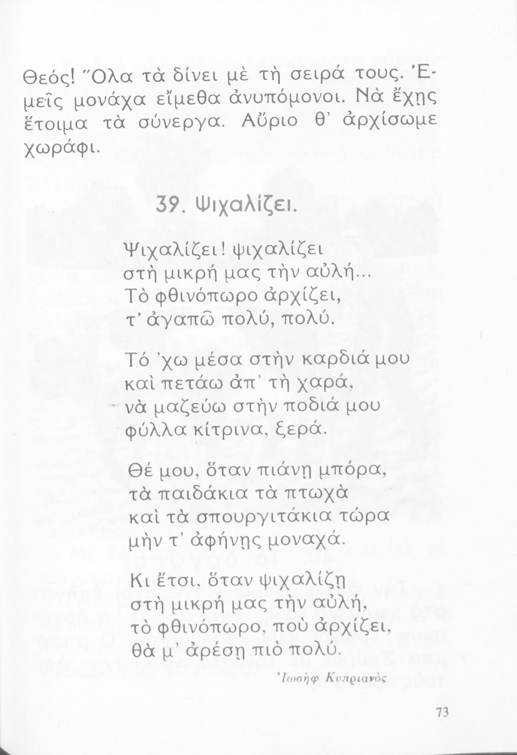 Αναγνωστικό Β' Δημοτικού που περιλαμβάνει ποιήματα και πεζά εμπνευσμένα από την καθημερινή ζωή, την ελληνική μυθολογία, την ελληνική φύση και τη θρησκευτική παράδοση.