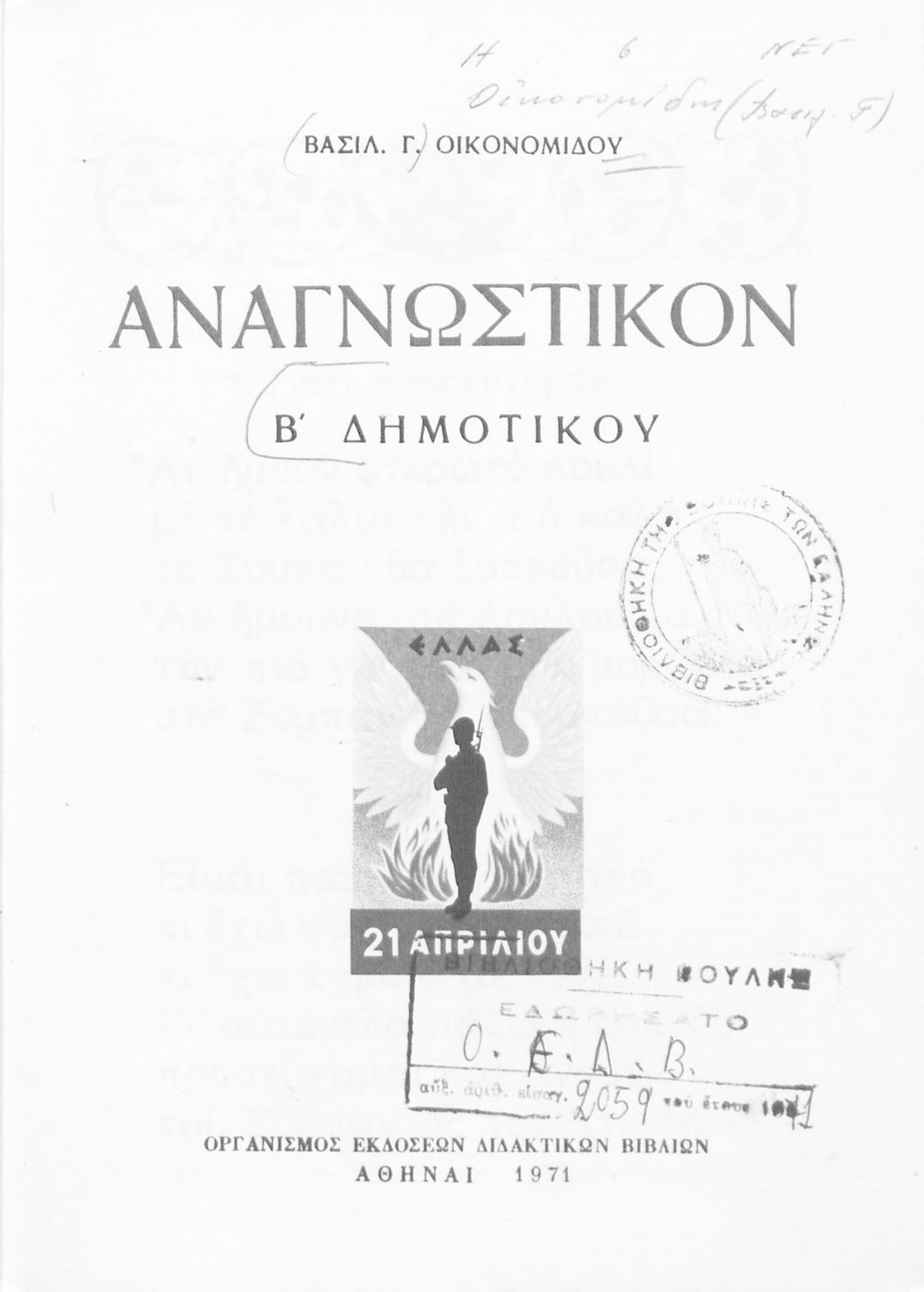 Εκδότης: Οργανισμός Εκδόσεως Διδακτικών Βιβλίων Έτος έκδοσης: 1971 Τόπος έκδοσης: Αθήνα Έκδοση: 12η Υπουργική απόφαση / Σύμβαση: 2066/5-3-1971 Έτος έγκρισης: 1971 |