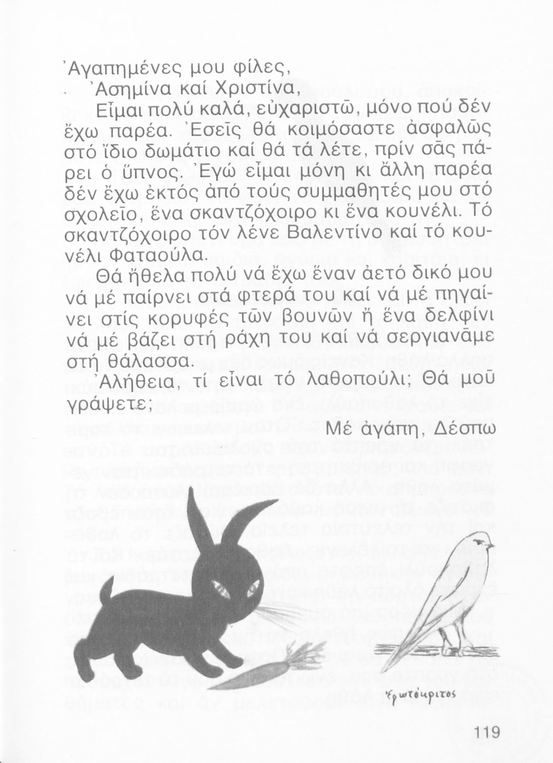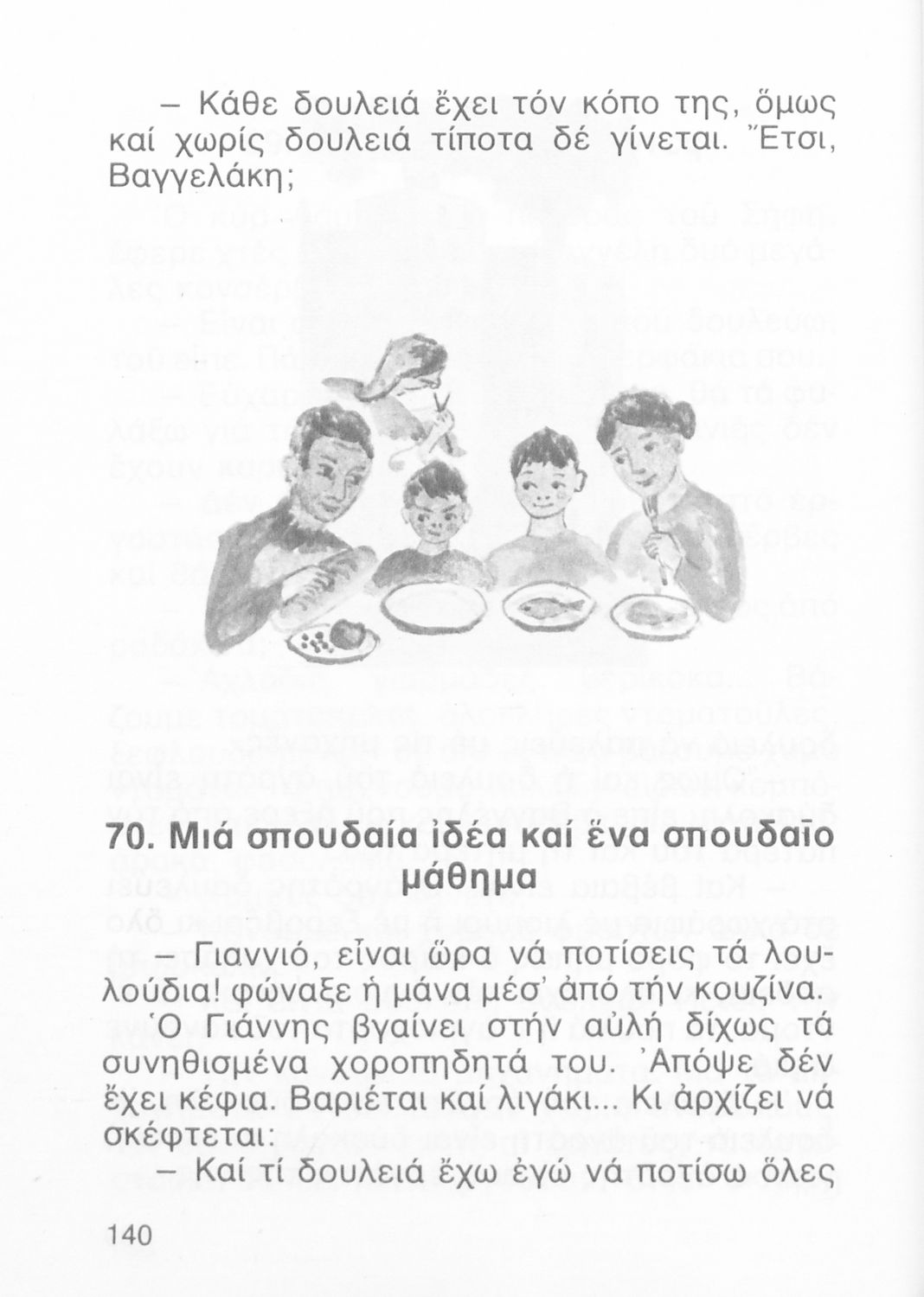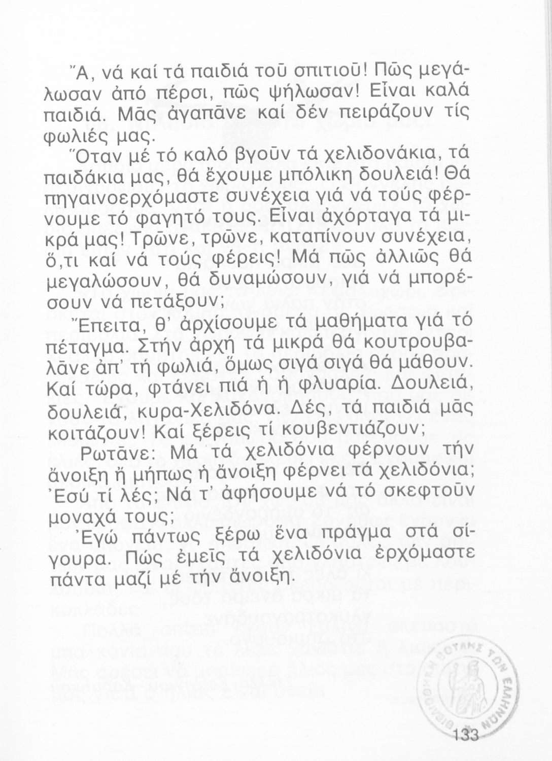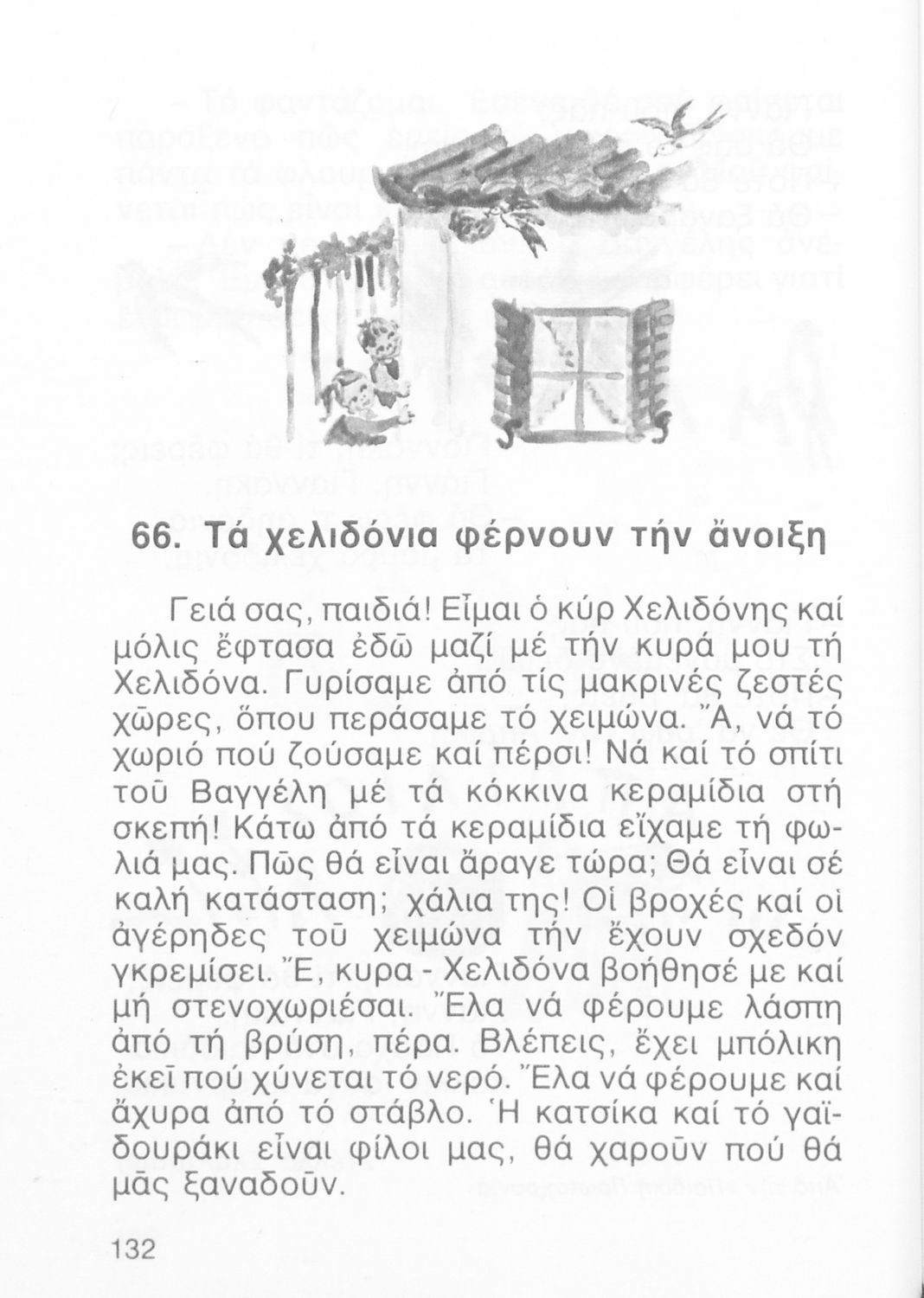 Αναγνωστικό Β' Δημοτικού που περιλαμβάνει μικρά διηγήματα και ποιήματα με περιεχόμενο από την οικογενειακή και κοινωνική ζωή, την ελληνική φύση, την ελληνική ιστορία και μυθολογία και την υγιεινή.