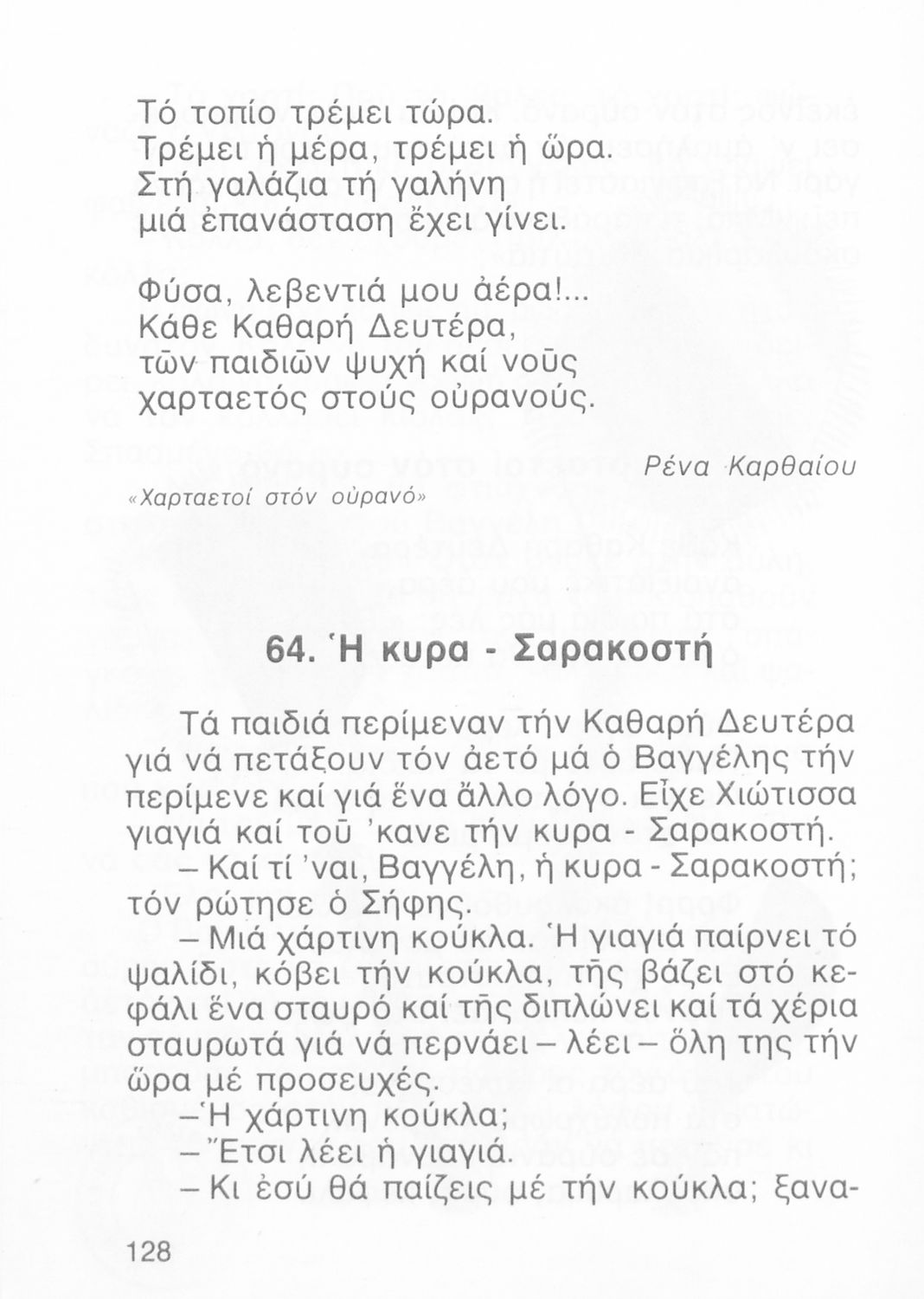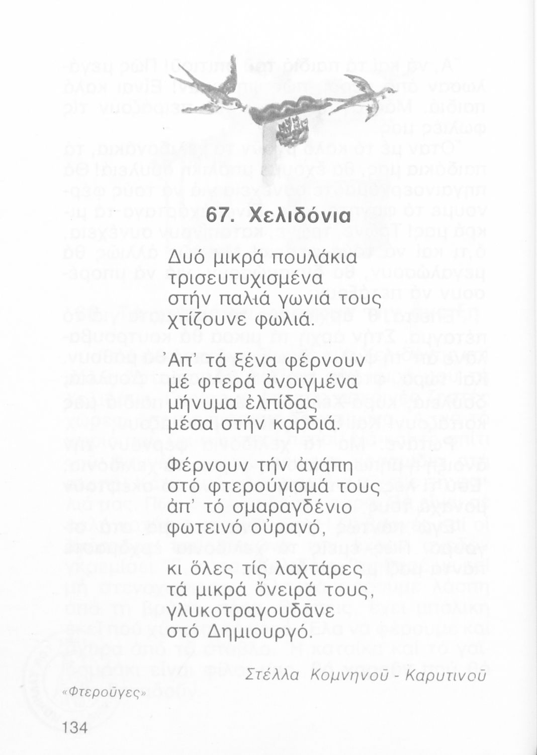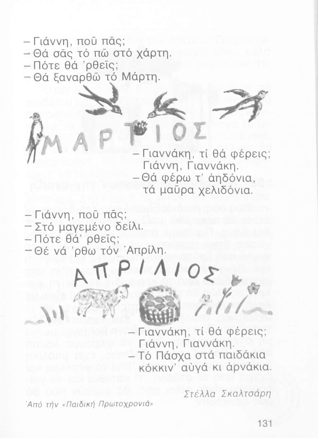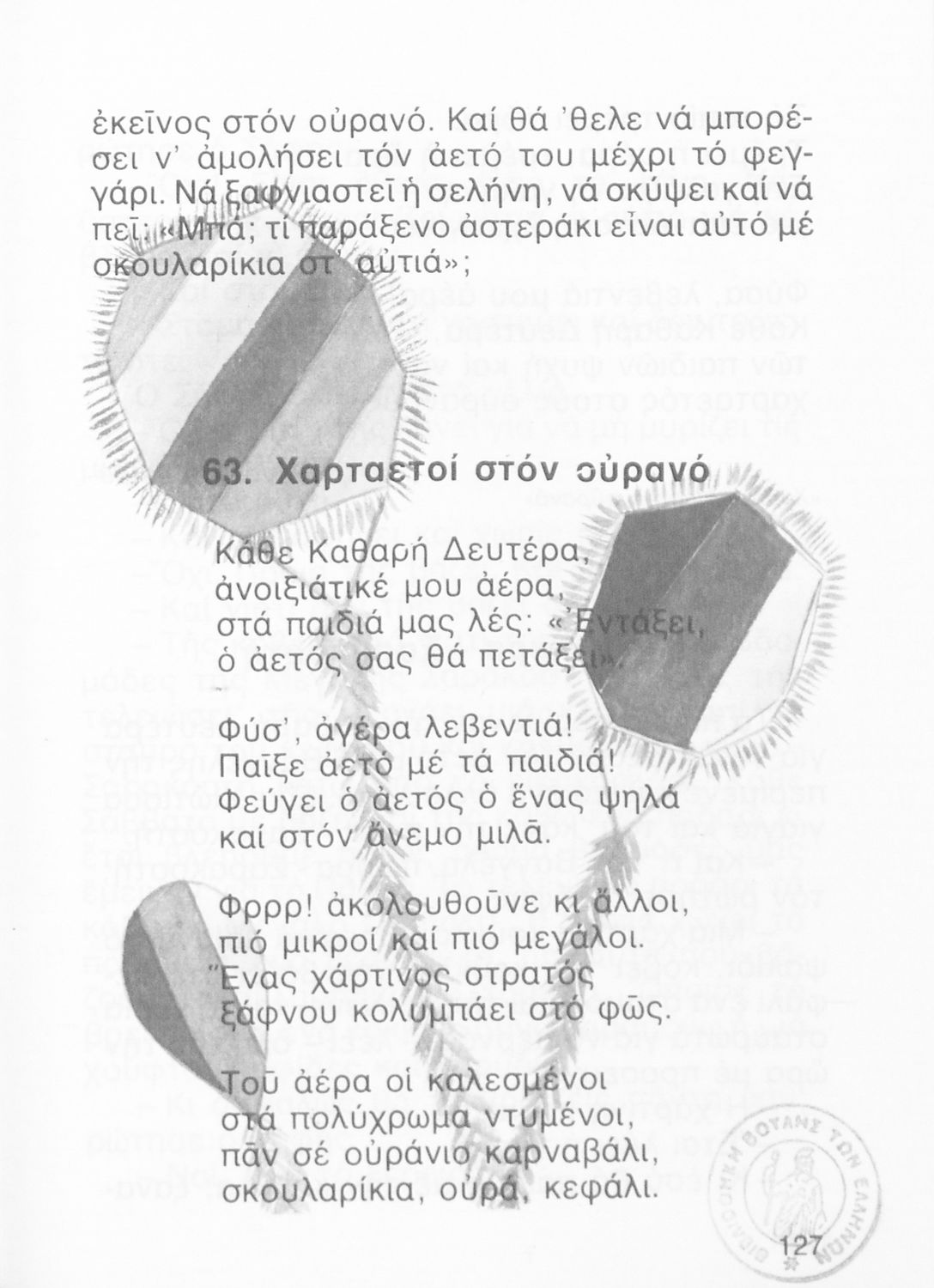 Αναγνωστικό Β' Δημοτικού που περιλαμβάνει ποιήματα και πεζά εμπνευσμένα από την καθημερινή ζωή, την ελληνική μυθολογία, την ελληνική φύση και τη θρησκευτική παράδοση.