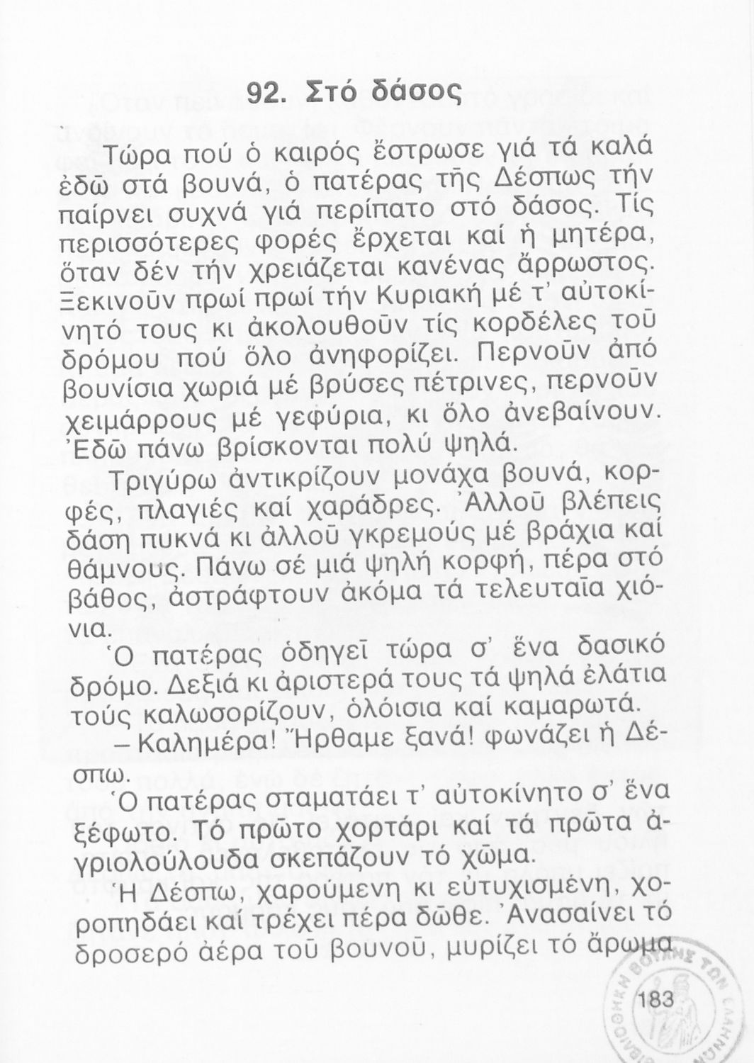 Αναγνωστικό Β' Δημοτικού που περιλαμβάνει μικρά διηγήματα και ποιήματα με περιεχόμενο από την οικογενειακή και κοινωνική ζωή, την ελληνική φύση, την ελληνική ιστορία και μυθολογία και την υγιεινή.