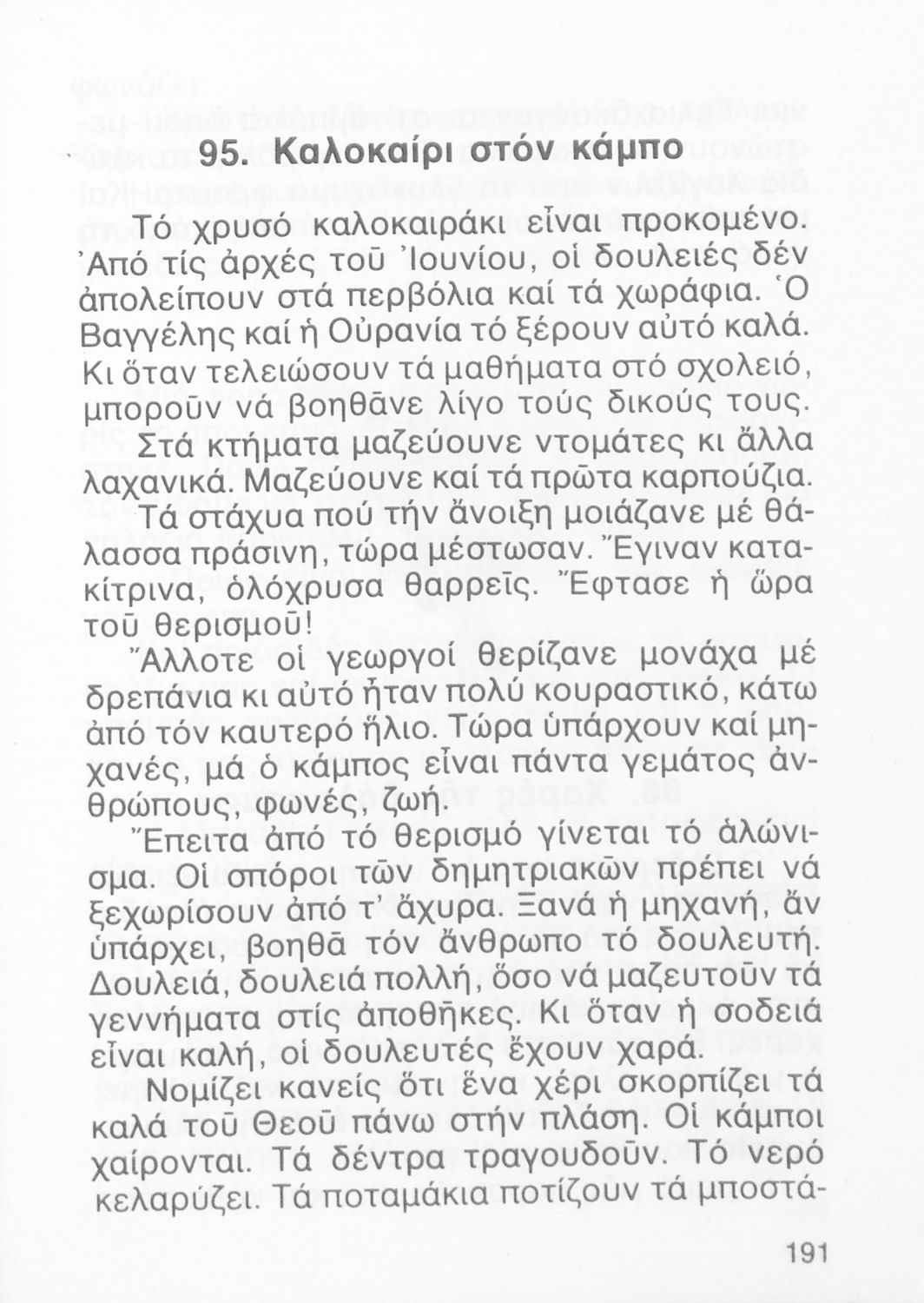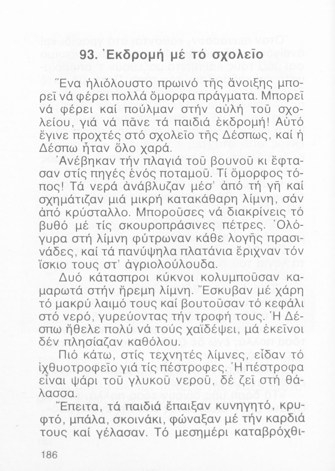 Αναγνωστικό Β' Δημοτικού που περιλαμβάνει ποιήματα και πεζά εμπνευσμένα από την καθημερινή ζωή, την ελληνική μυθολογία, την ελληνική φύση και τη θρησκευτική παράδοση.