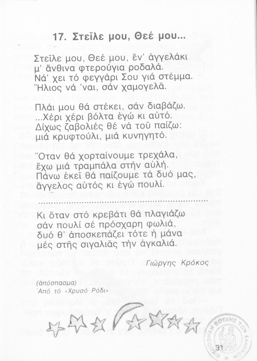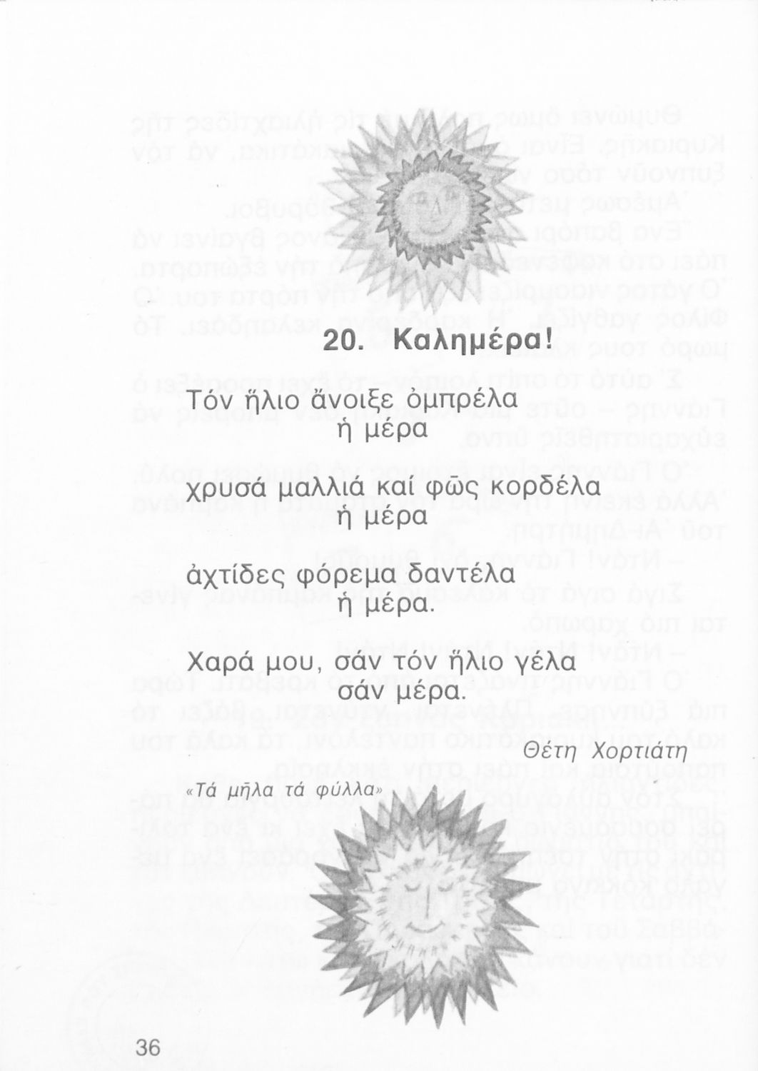Αναγνωστικό Β' Δημοτικού που περιλαμβάνει ποιήματα και πεζά εμπνευσμένα από την καθημερινή ζωή, την ελληνική μυθολογία, την ελληνική φύση και τη θρησκευτική παράδοση.