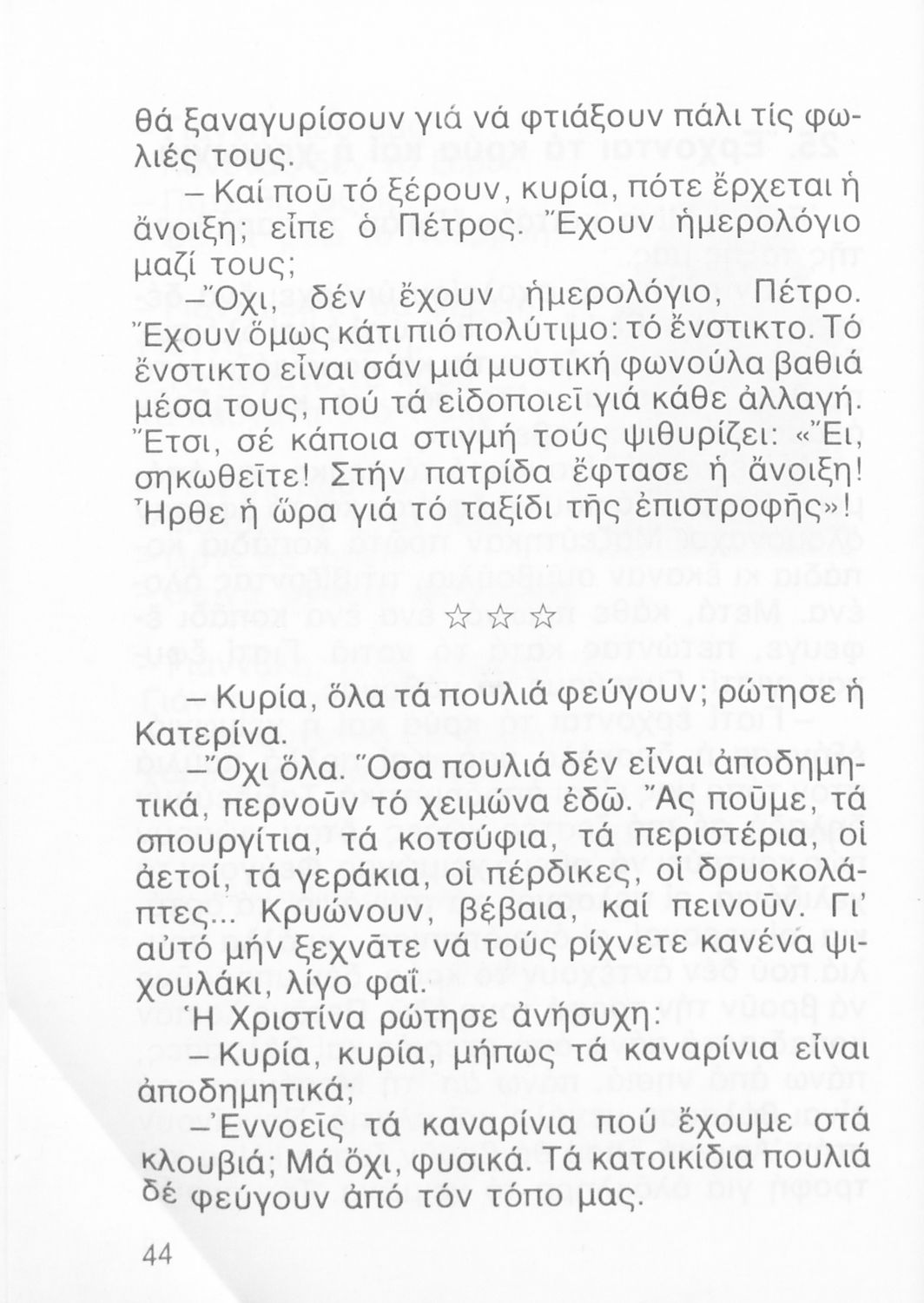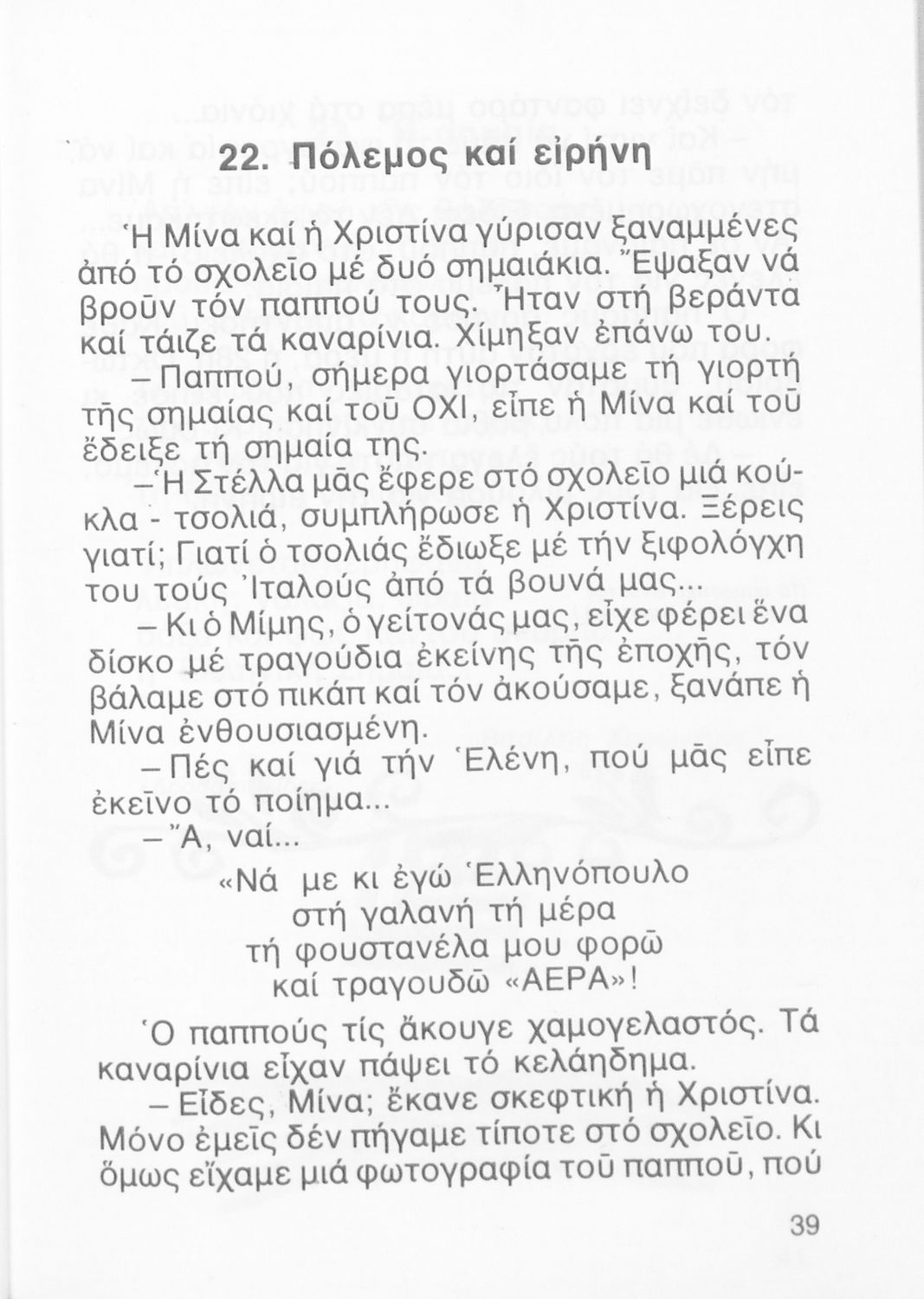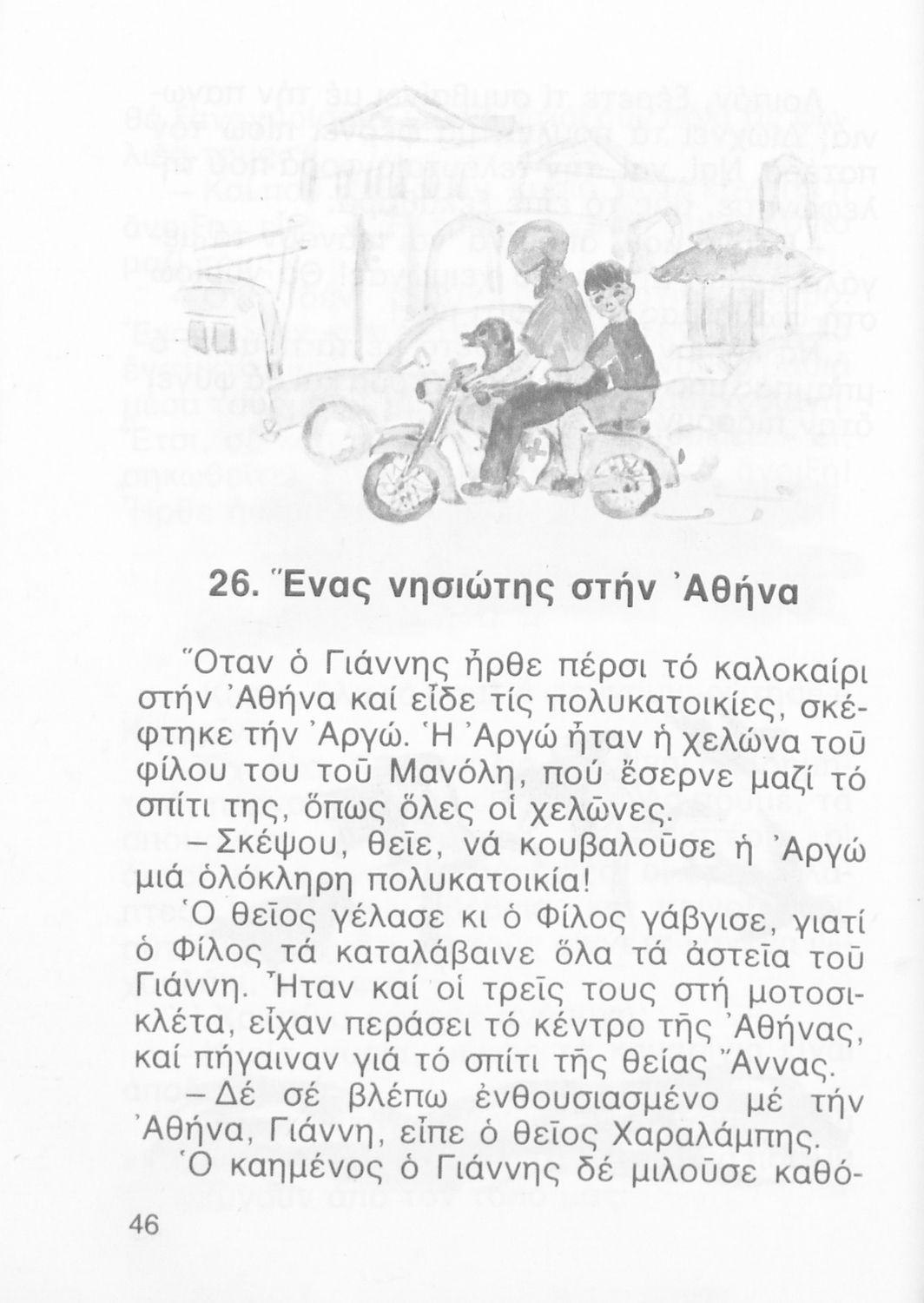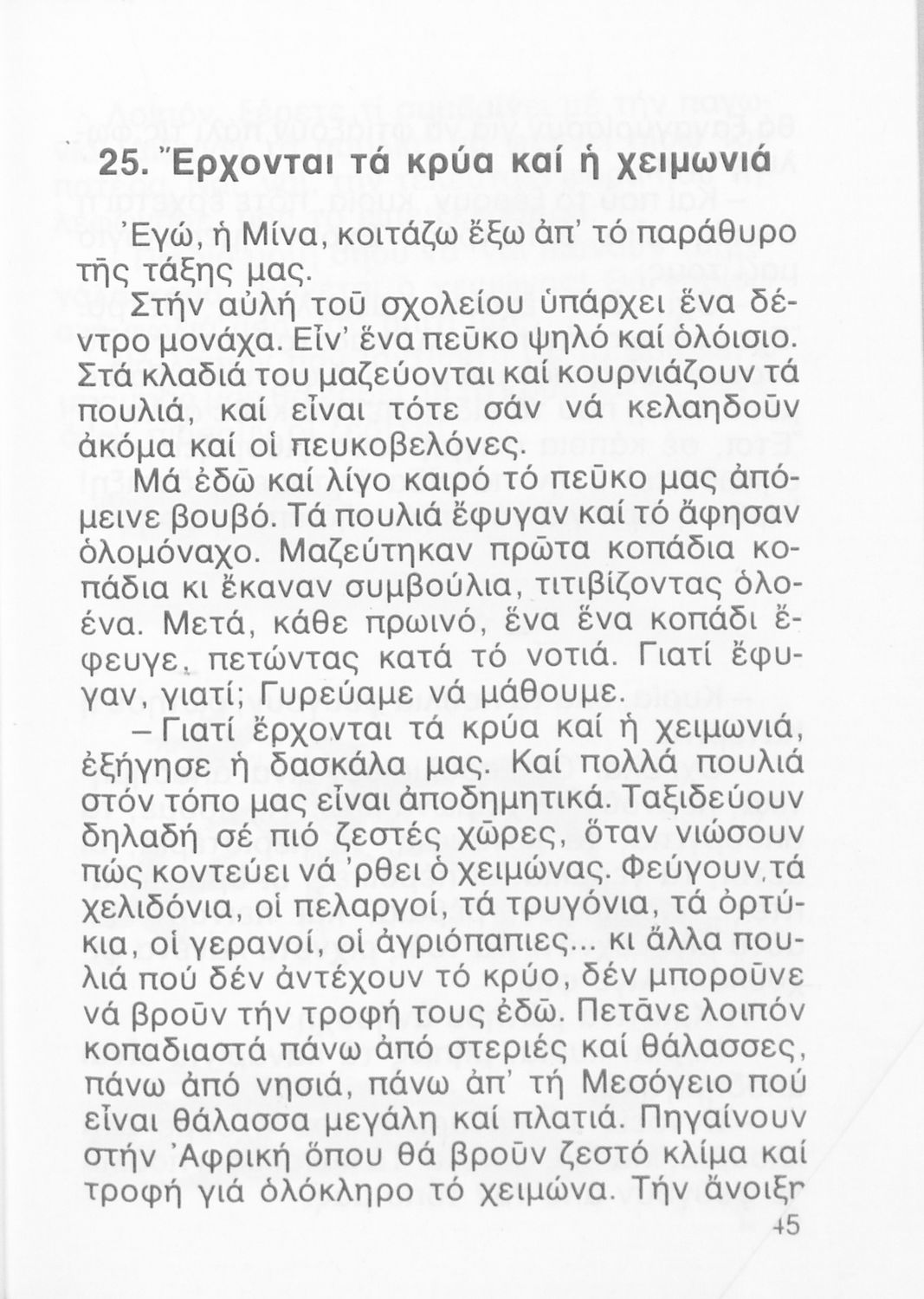 Αναγνωστικό Β' Δημοτικού που περιλαμβάνει μικρά διηγήματα και ποιήματα με περιεχόμενο από την οικογενειακή και κοινωνική ζωή, την ελληνική φύση, την ελληνική ιστορία και μυθολογία και την υγιεινή.