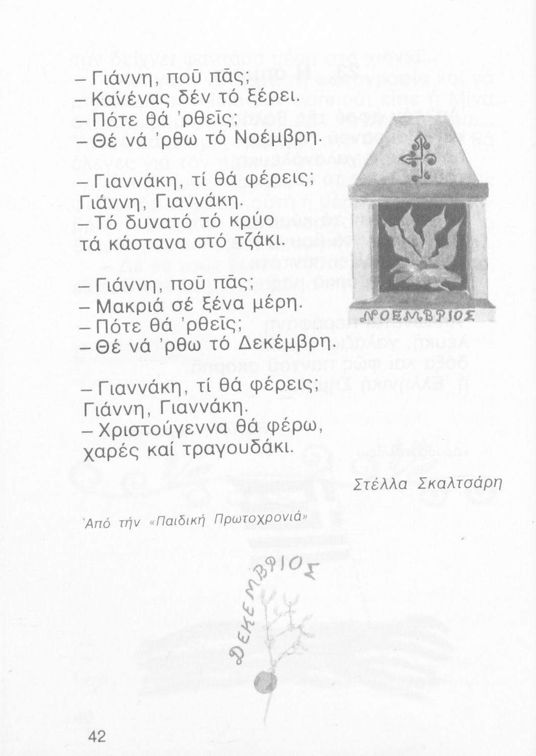 Αναγνωστικό Β' Δημοτικού που είναι χωρισμένο σύμφωνα με τις εποχές του χρόνου και περιλαμβάνει κείμενα ηθοποιητικού περιεχομένου εμπνευσμένα από τη θρησκευτική, εθνική, κοινωνική και οικογενειακή ζωή. Φέρει το
