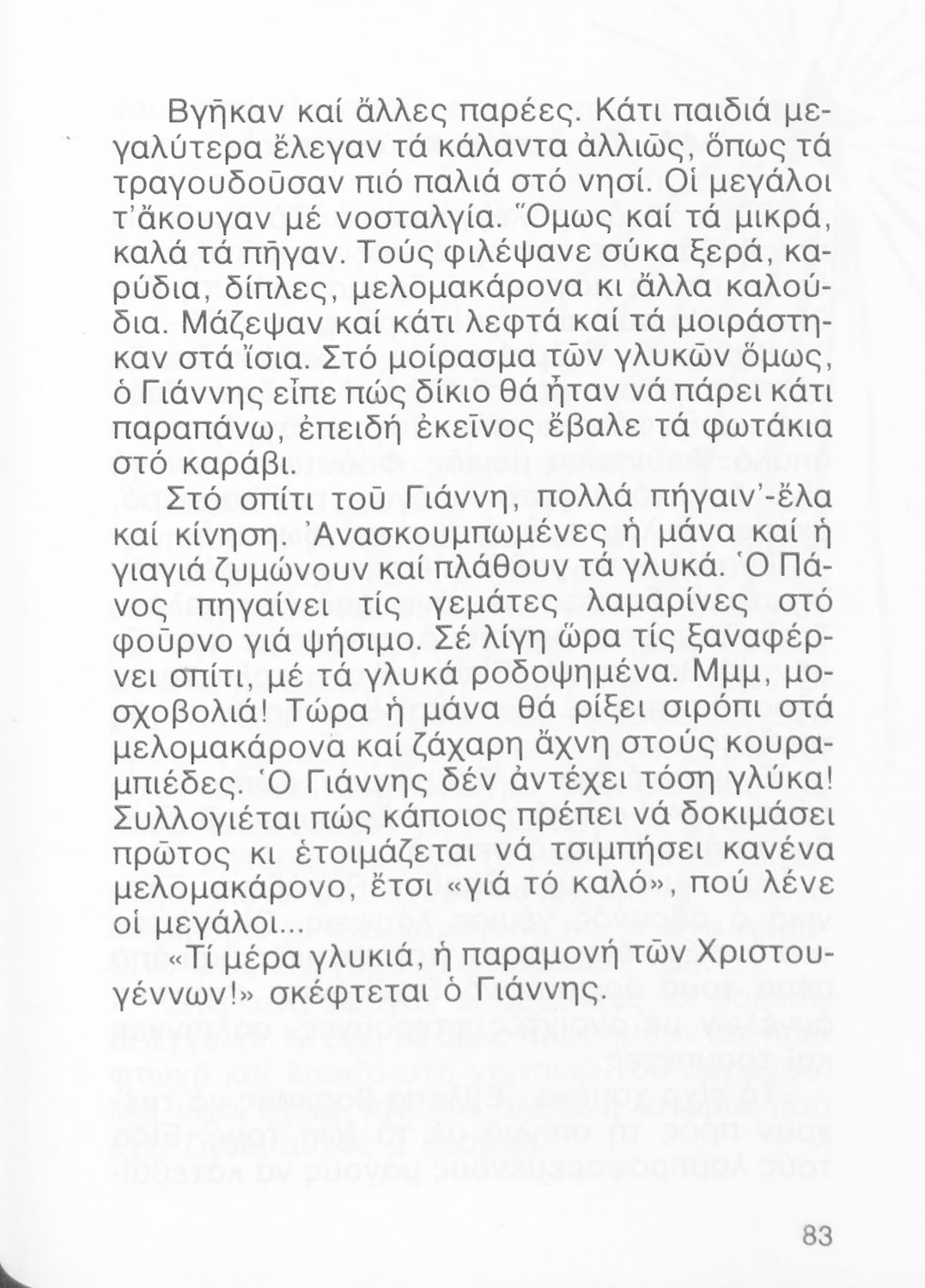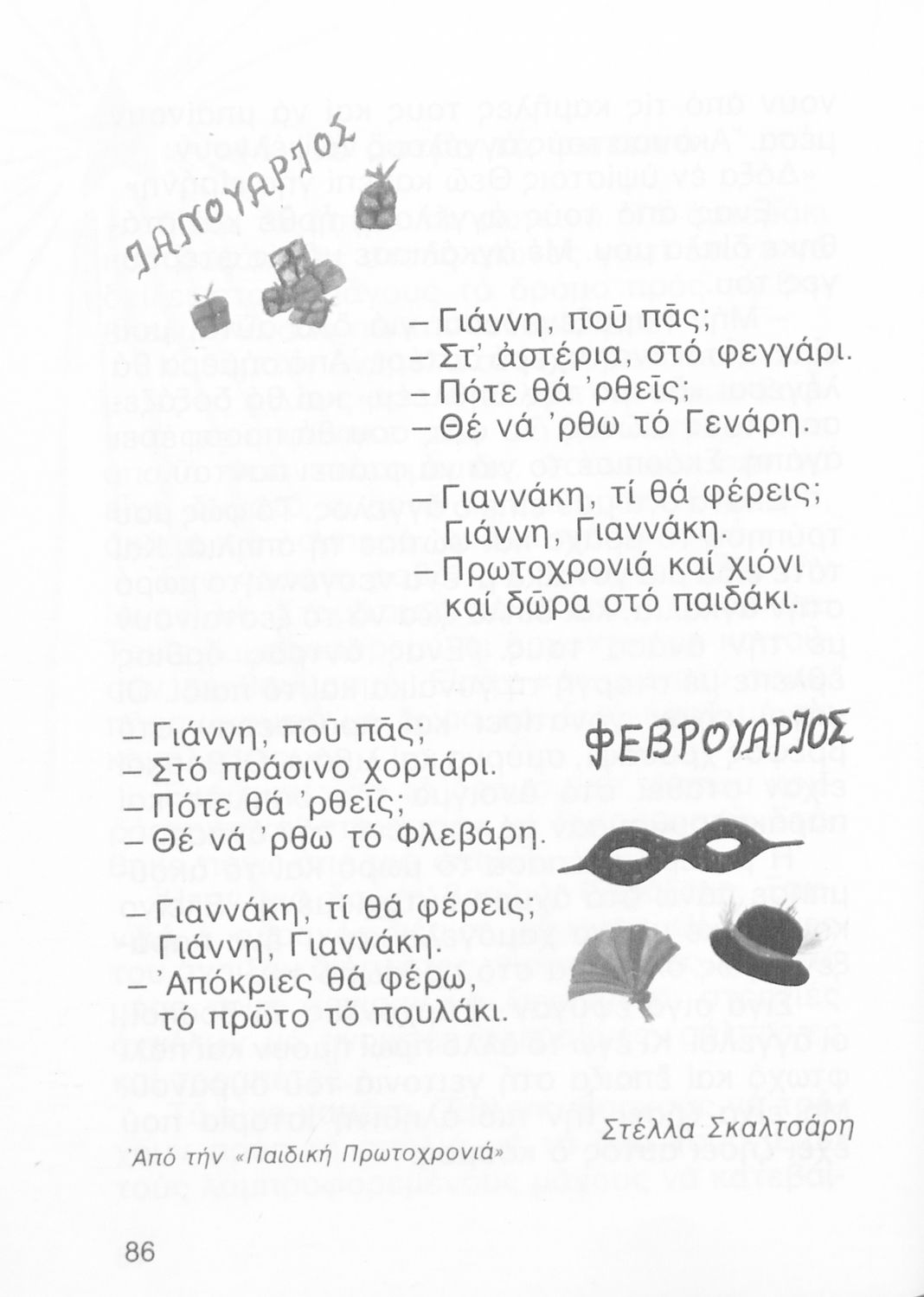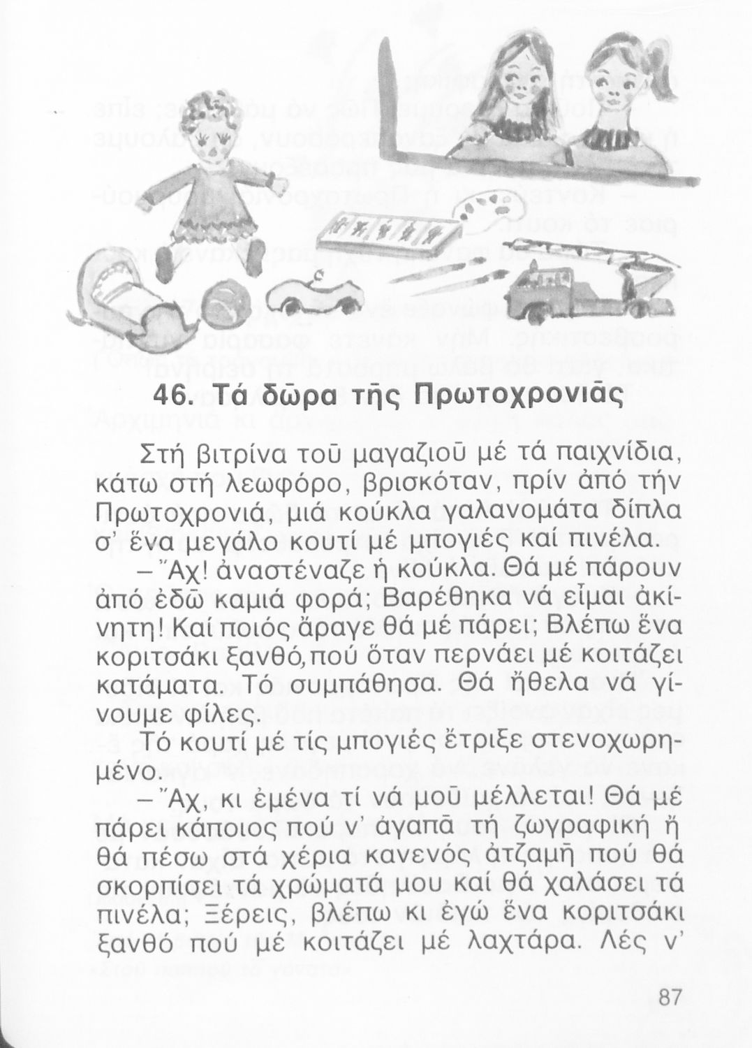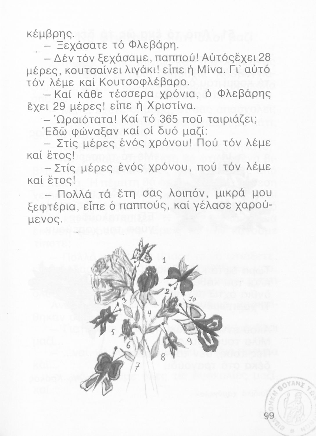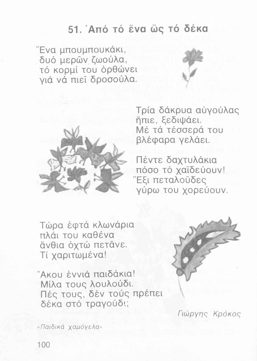 Αναγνωστικό Β' Δημοτικού που περιλαμβάνει ποιήματα και πεζά εμπνευσμένα από την καθημερινή ζωή, την ελληνική μυθολογία, την ελληνική φύση και τη θρησκευτική παράδοση.
