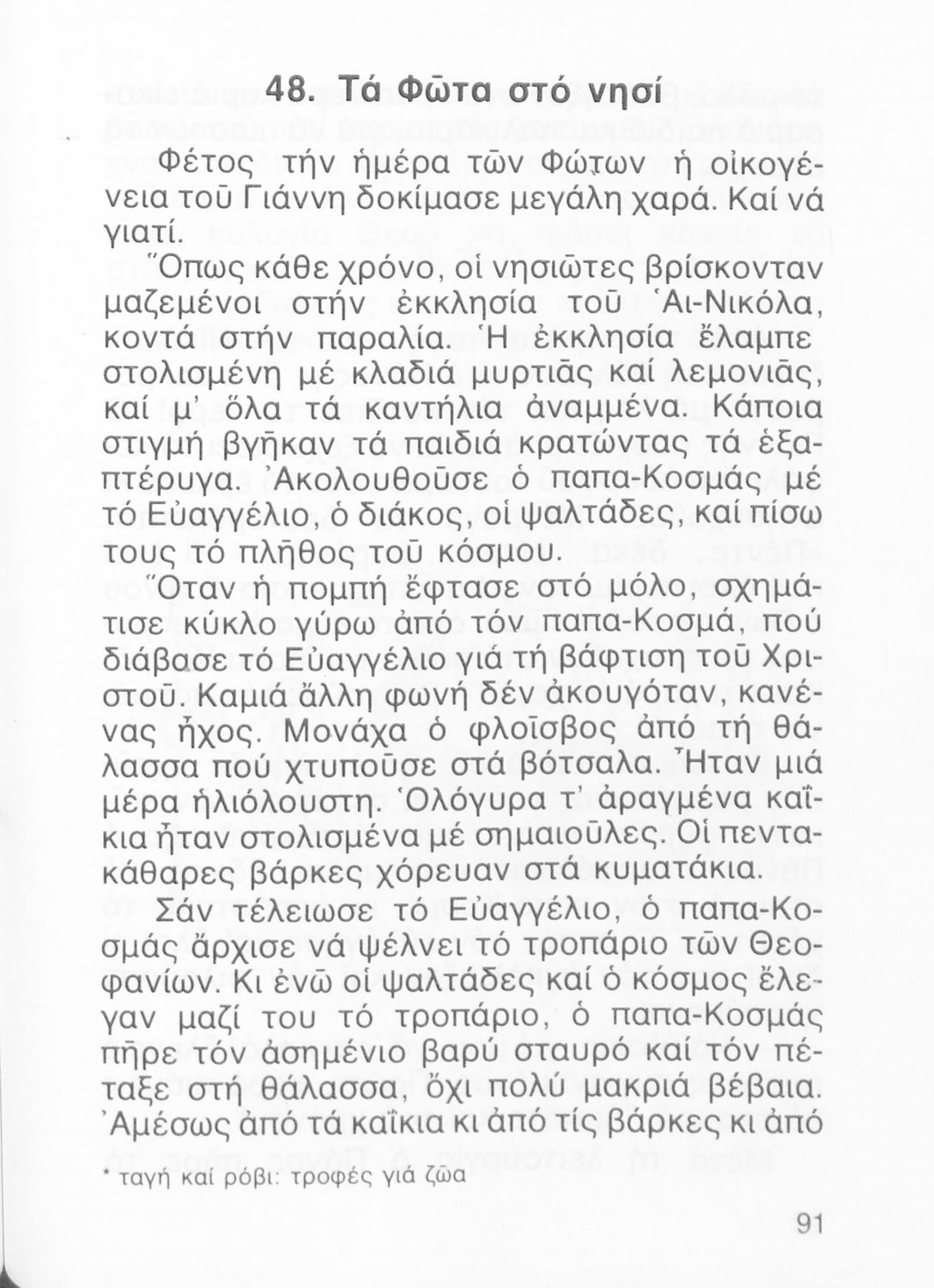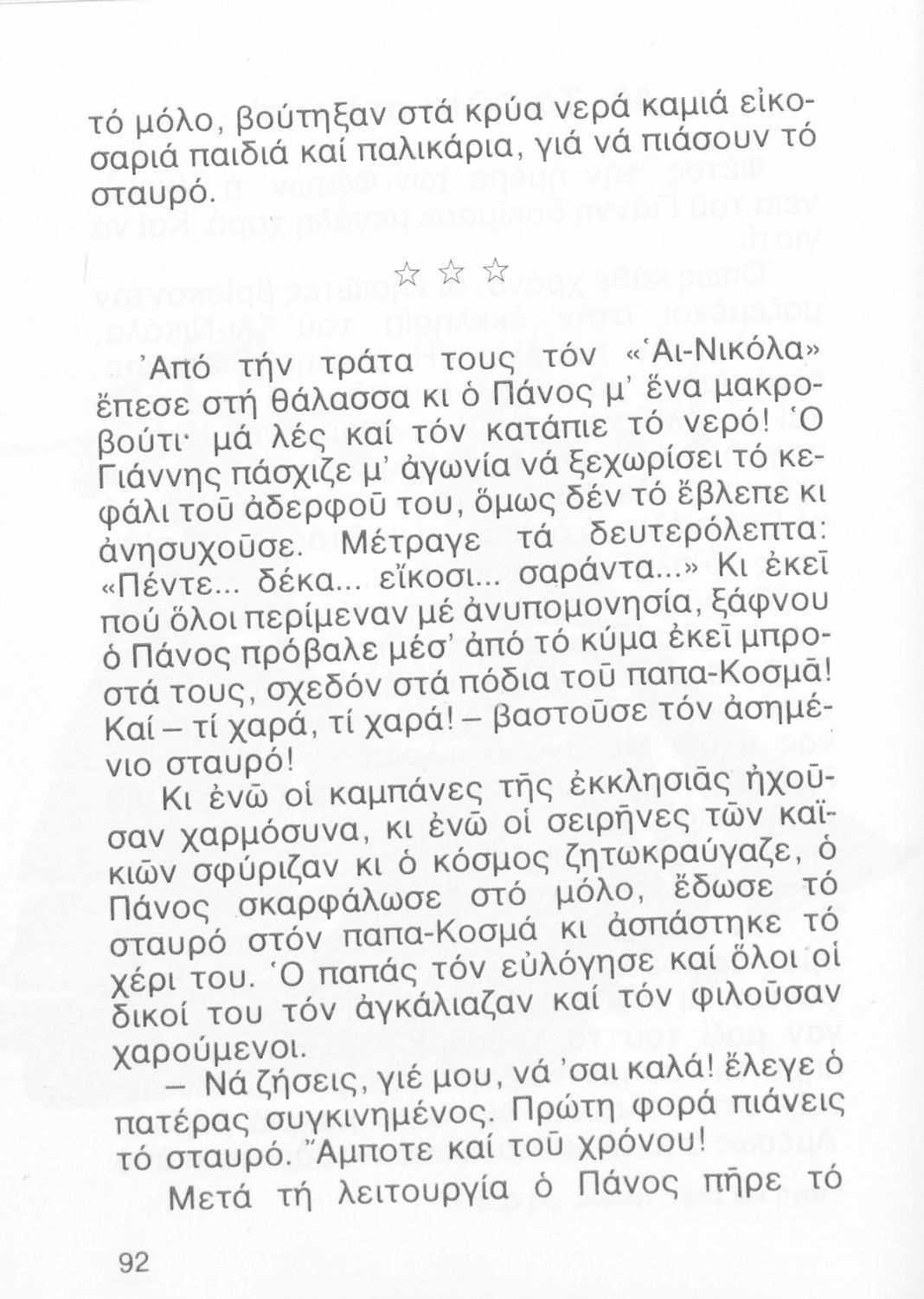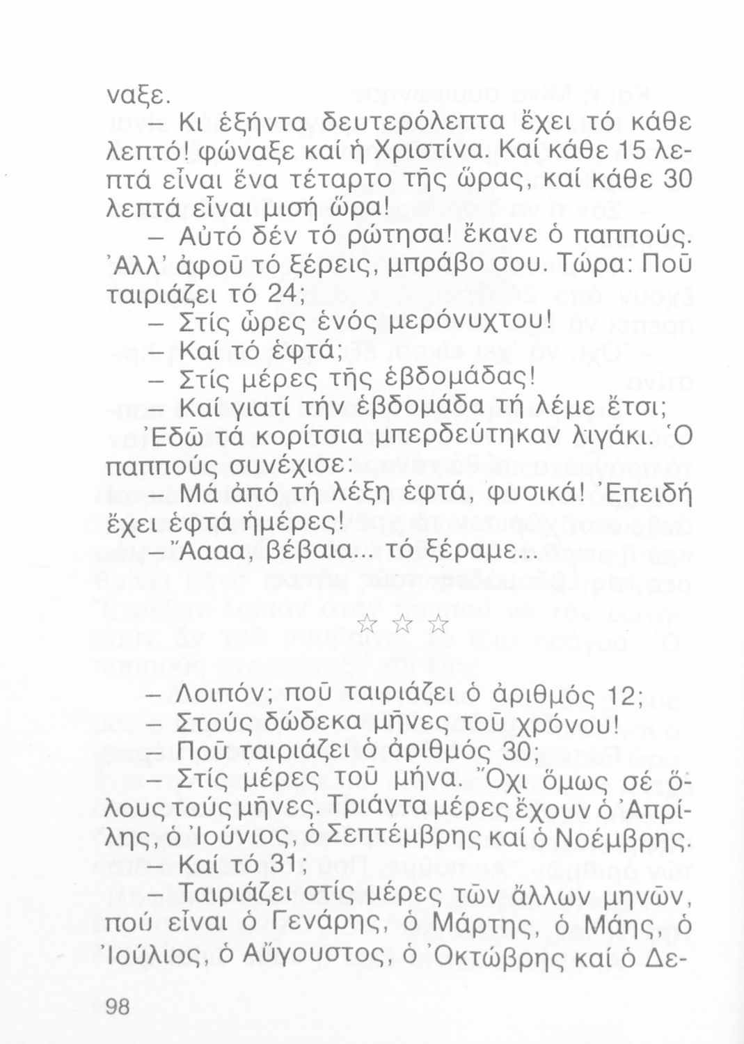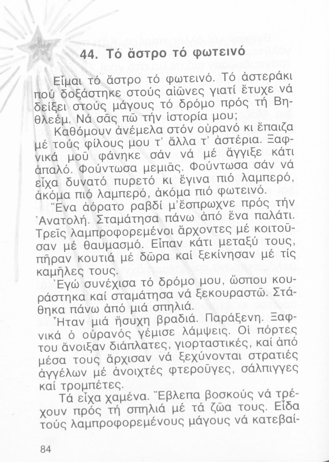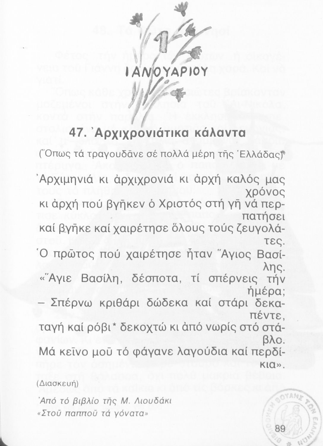 Αναγνωστικό Β' Δημοτικού που περιλαμβάνει ποιήματα και πεζά εμπνευσμένα από την καθημερινή ζωή, την ελληνική μυθολογία, την ελληνική φύση και τη θρησκευτική παράδοση.