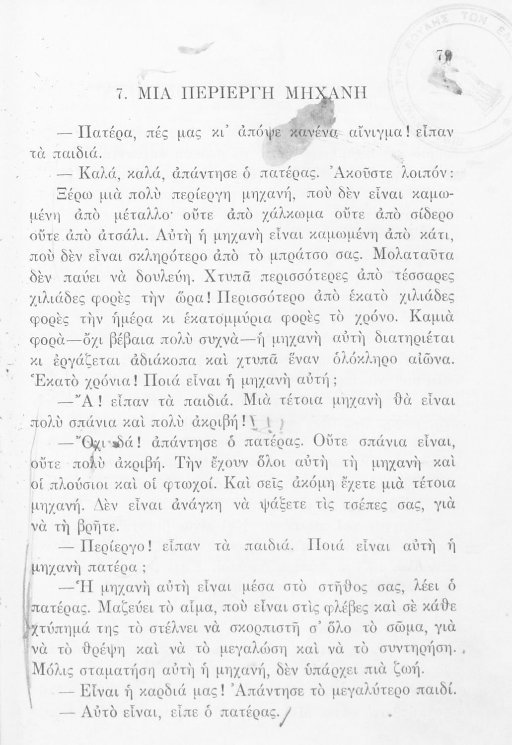Αναγνωστικό Γ' Δημοτικού που περιέχει πεζά και ποιήματα εμπνευσμένα από τη θρησκευτική, εθνική, κοινωνική και ατομική ζωή, και την ελληνική φύση, ιστορία και μυθολογία.