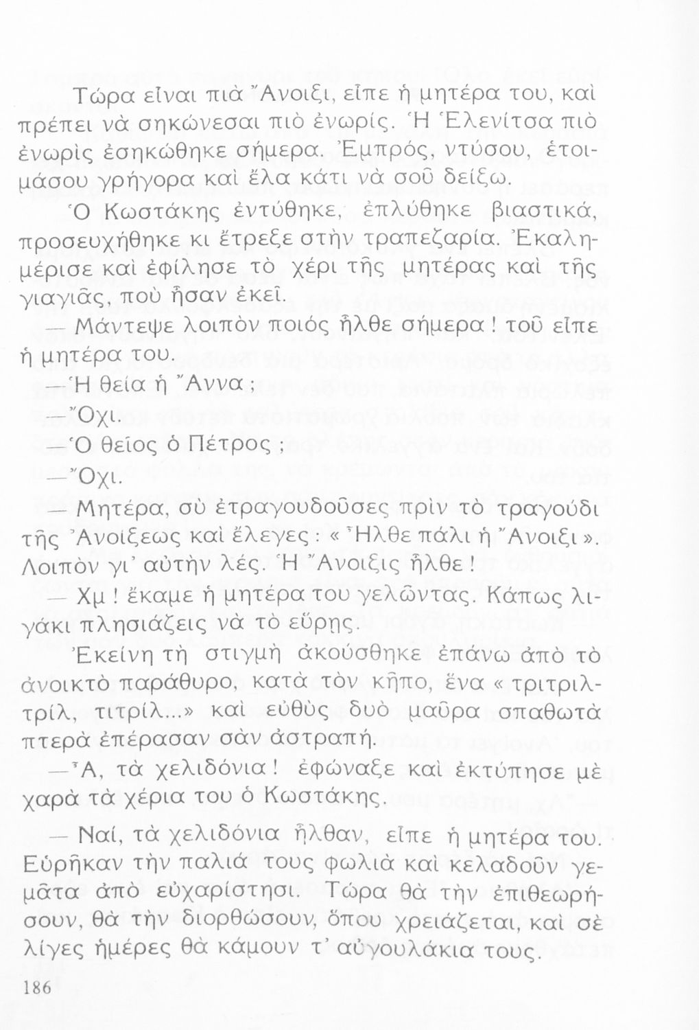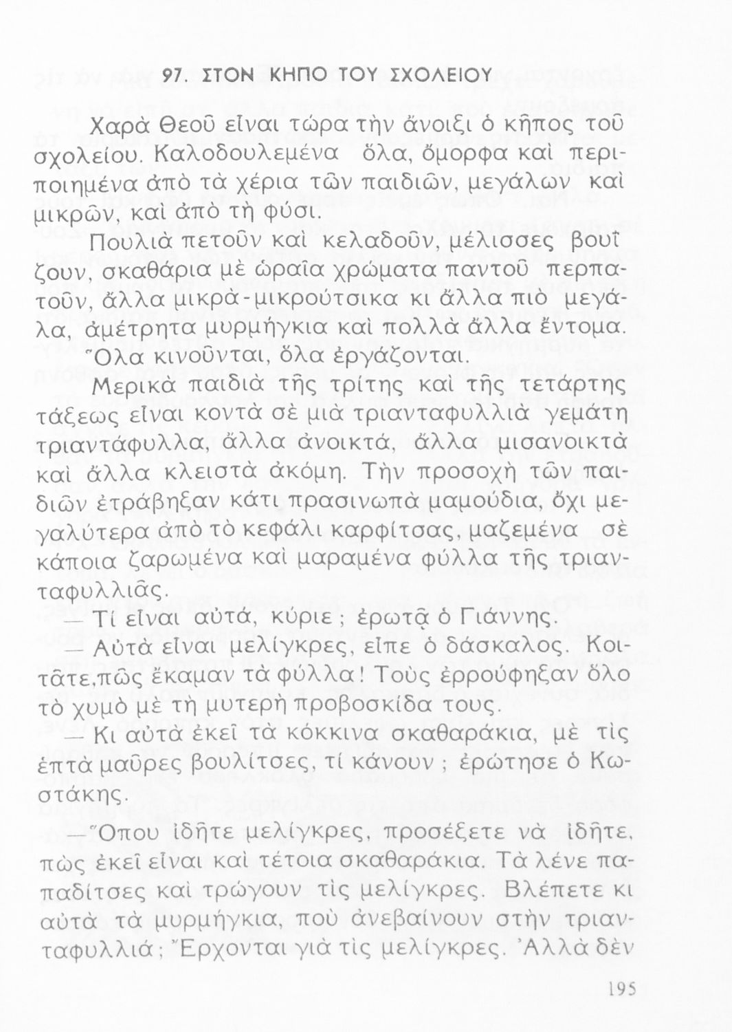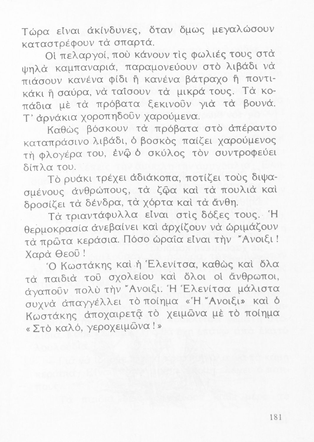 Αναγνωστικό Γ' Δημοτικού που είναι χωρισμένο σύμφωνα με τις εποχές του χρόνου και περιλαμβάνει ποιήματα και πεζά εμπνευσμένα από τη ζωή στην ύπαιθρο, την εθνική, οικογενειακή και κοινωνική ζωή, τη θρησκευτική παράδοση, τις ασχολίες των ανθρώπων, και την ελληνική φύση.