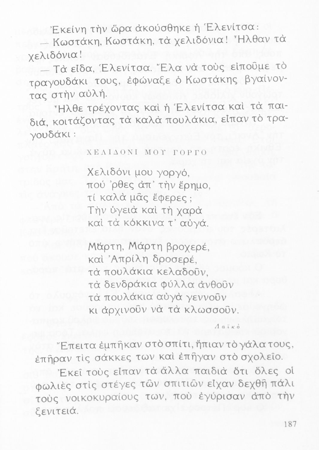 Αναγνωστικό της Γ΄ Δημοτικού που περιέχει πεζά και ποιήματα εμπνευσμένα από την κοινωνική και οικογενειακή ζωή του τόπου. Περιλαμβάνει ερωτήσεις κατανόησης και λεξιλογικές ασκήσεις.