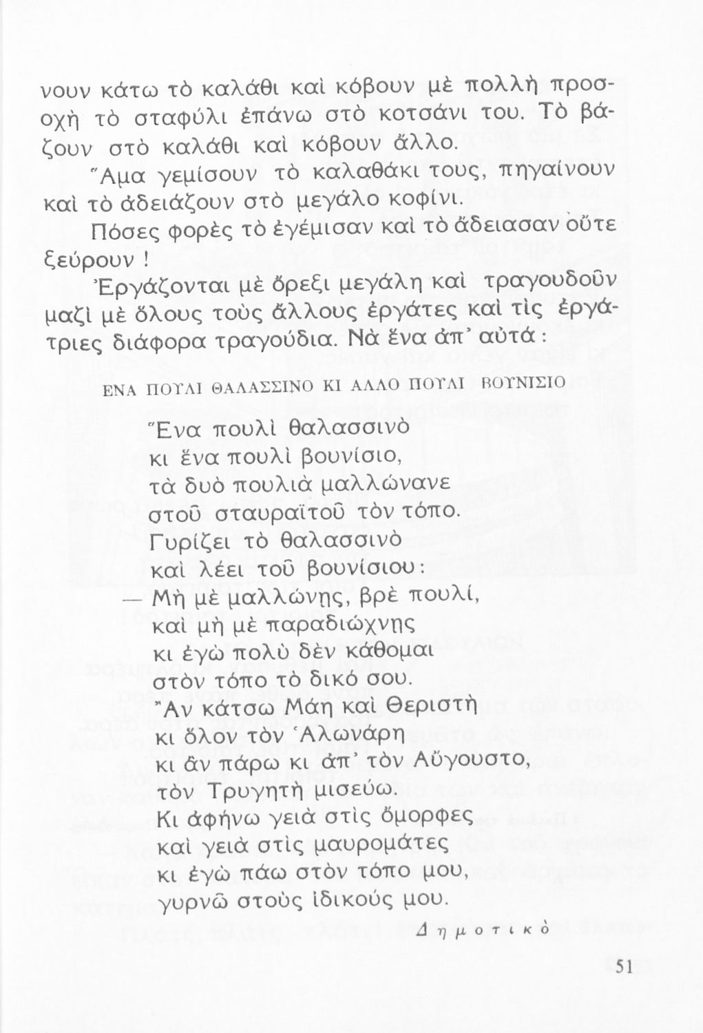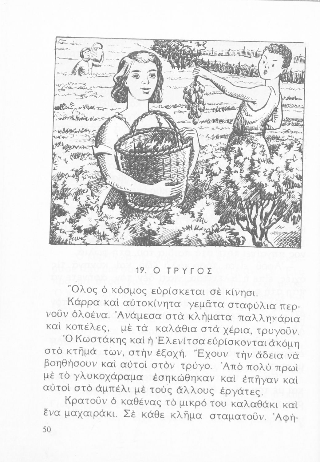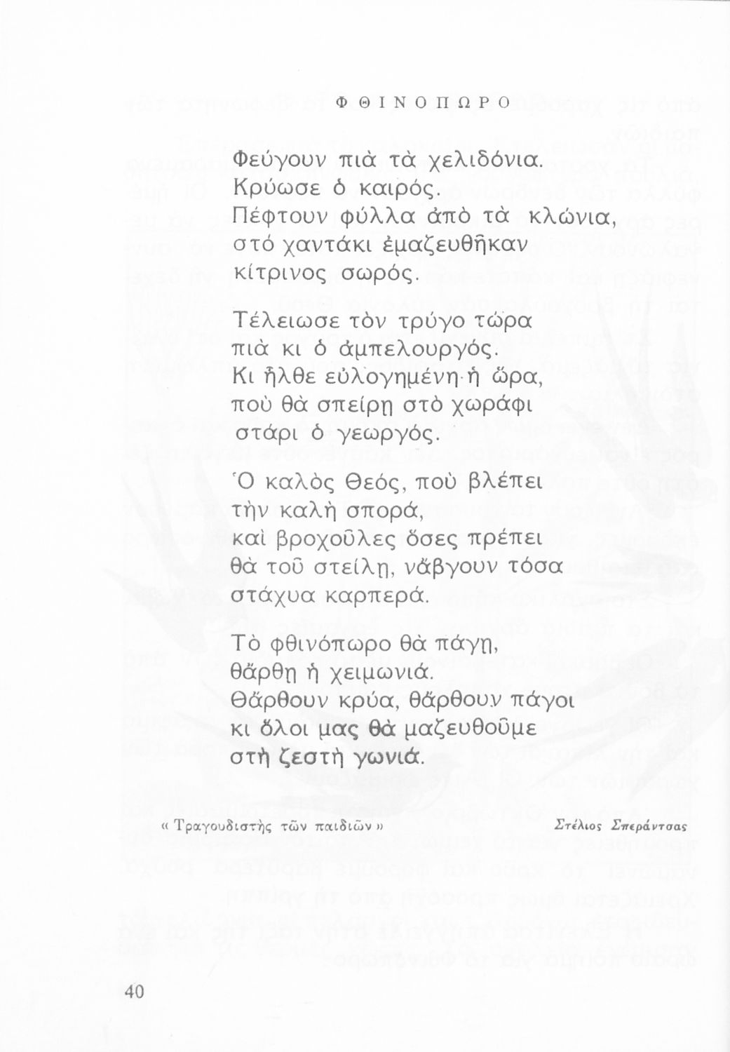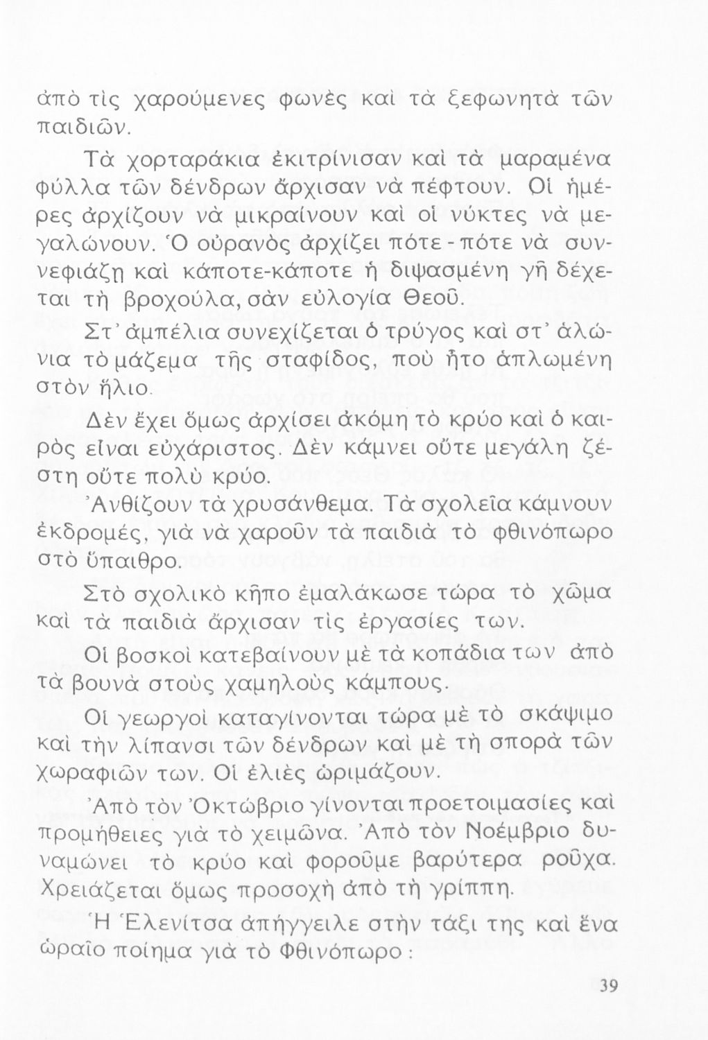520 ## _aΑναγνωστικό Γ' Δημοτικού που είναι χωρισμένο σύμφωνα με τις εποχές του χρόνου και περιλαμβάνει ποιήματα και πεζά εμπνευσμένα από τη ζωή στην ύπαιθρο, την εθνική, οικογενειακή και κοινωνική ζωή, τη θρησκευτική παράδοση, τις ασχολίες των ανθρώπων, και την ελληνική φύση.