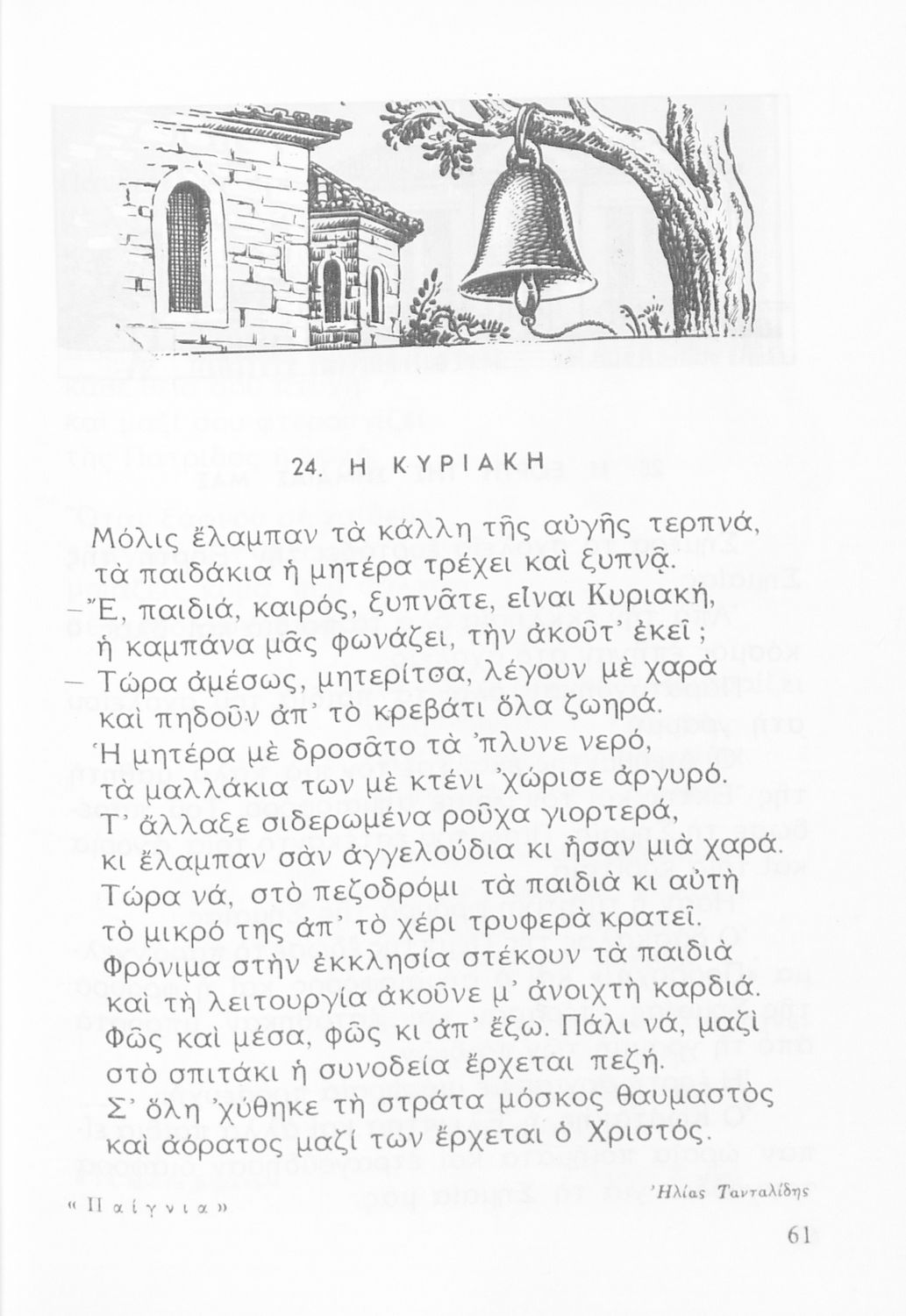 Αναγνωστικό Γ' Δημοτικού που είναι χωρισμένο σύμφωνα με τις εποχές του χρόνου και περιλαμβάνει ποιήματα και πεζά εμπνευσμένα από τη ζωή στην ύπαιθρο, την εθνική, οικογενειακή και κοινωνική ζωή, τη θρησκευτική ...
