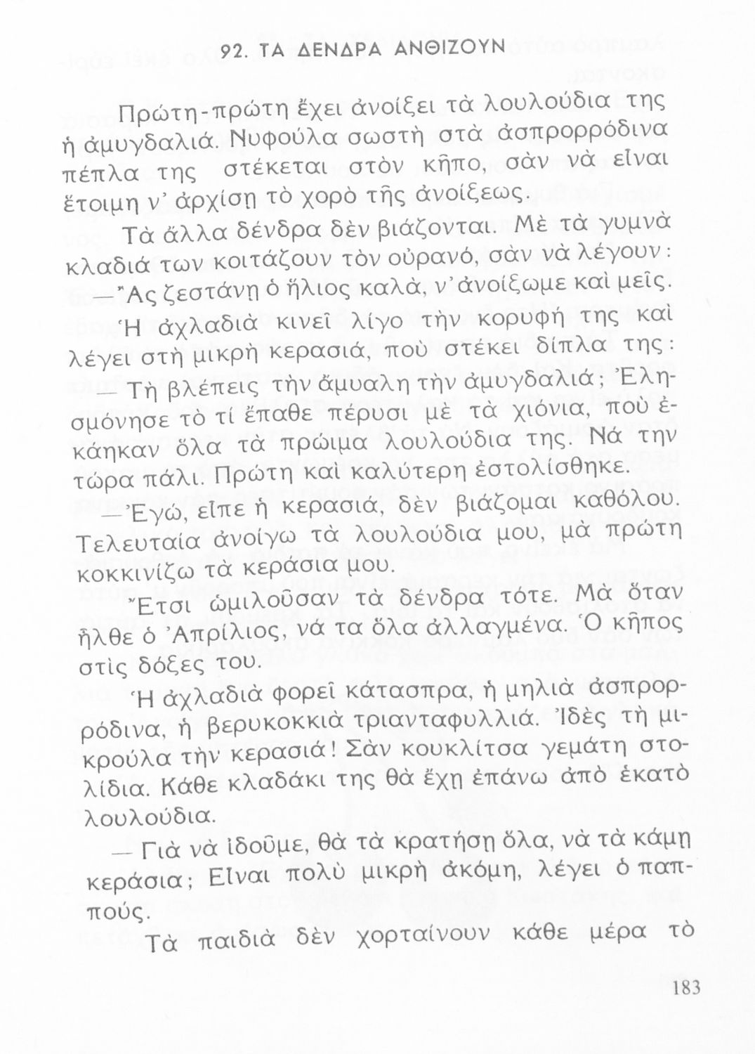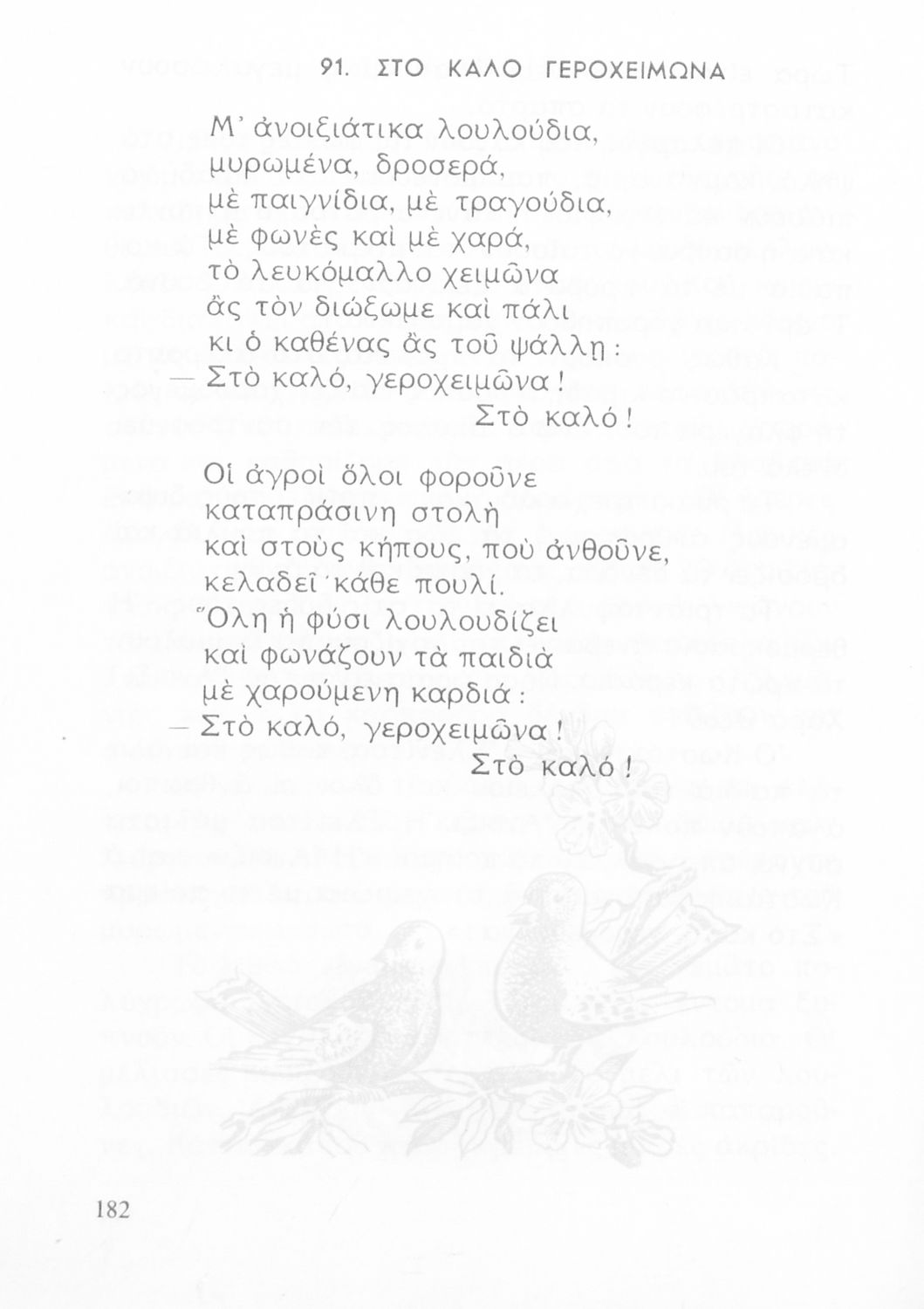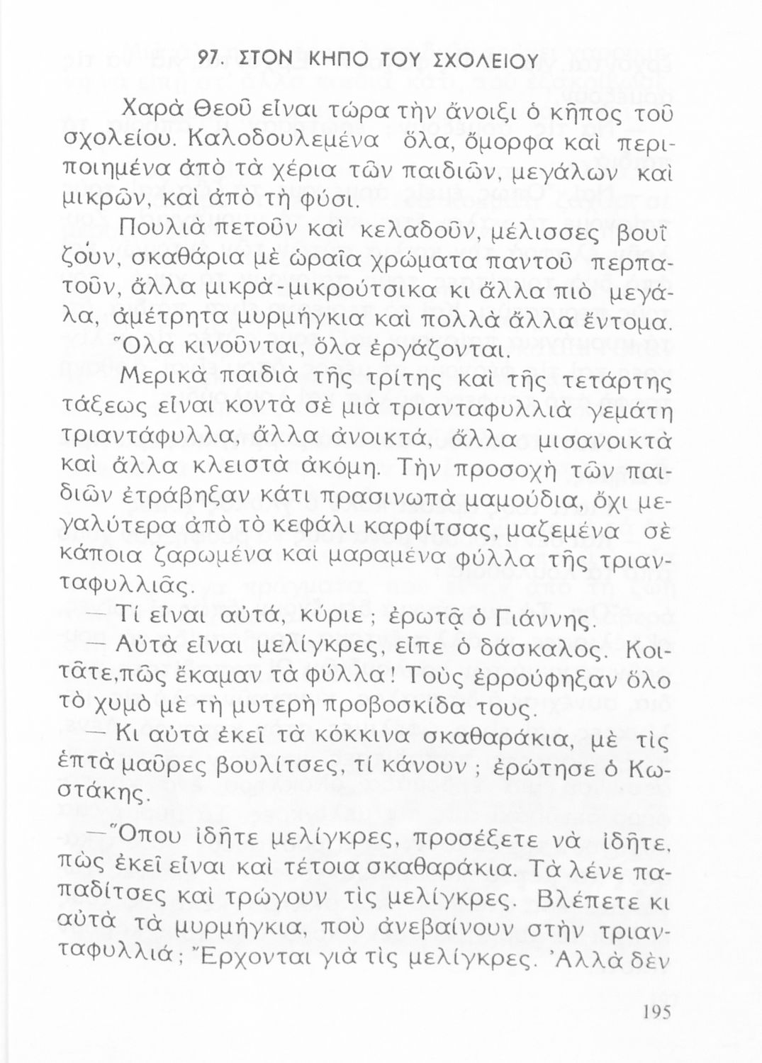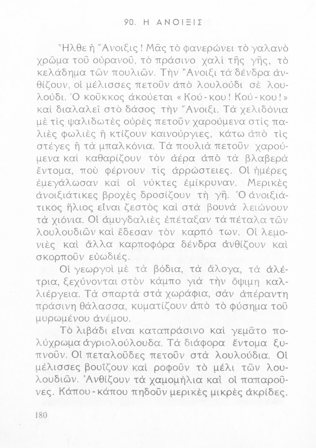 Αναγνωστικό Γ' Δημοτικού που είναι χωρισμένο σύμφωνα με τις εποχές του χρόνου και περιλαμβάνει ποιήματα και πεζά εμπνευσμένα από τη ζωή στην ύπαιθρο, την εθνική, οικογενειακή και κοινωνική ζωή, τη θρησκευτική παράδοση, τις ασχολίες των ανθρώπων, και την ελληνική φύση.