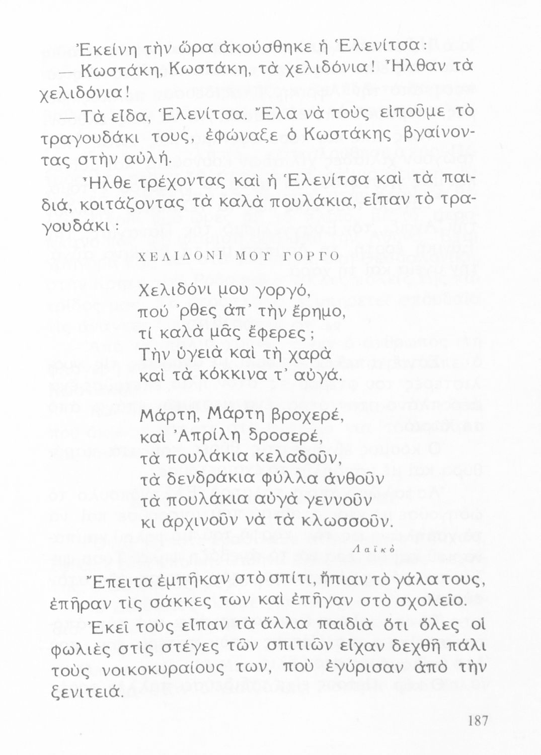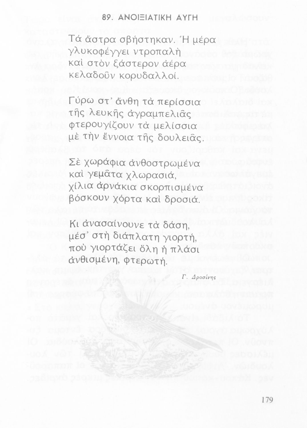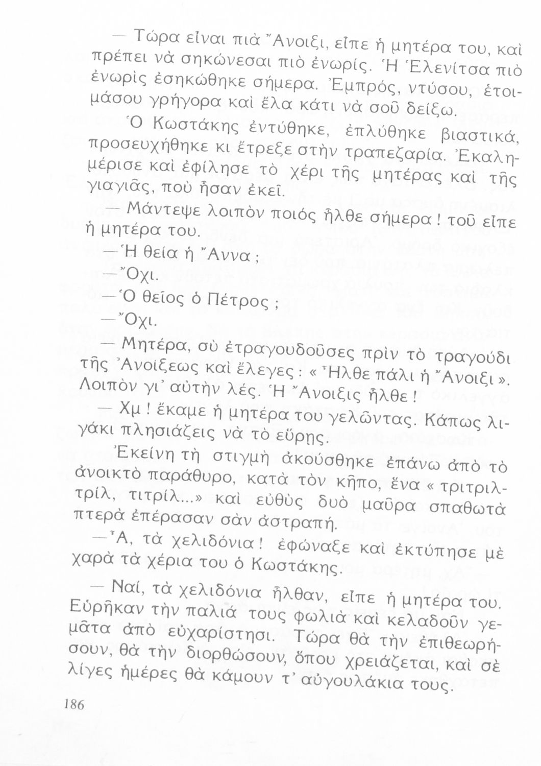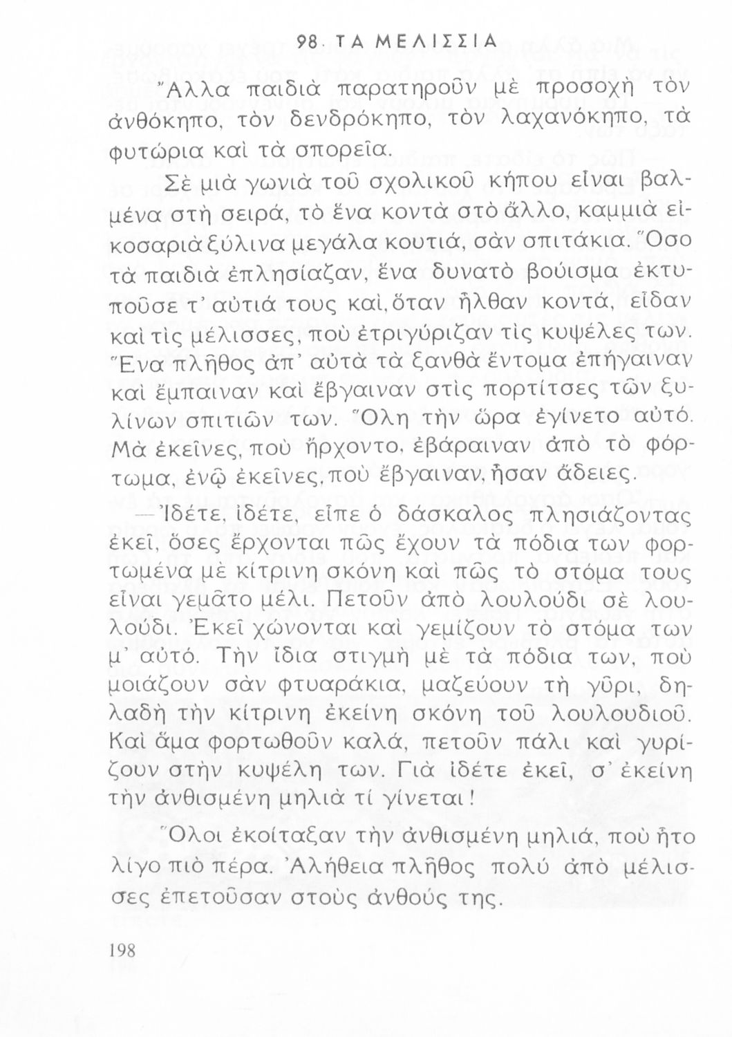 Αναγνωστικό Γ' Δημοτικού που είναι χωρισμένο σύμφωνα με τις εποχές του χρόνου και περιλαμβάνει ποιήματα και πεζά εμπνευσμένα από τη ζωή στην ύπαιθρο, την εθνική, οικογενειακή και κοινωνική ζωή, τη θρησκευτική παράδοση, τις ασχολίες των ανθρώπων, και την ελληνική φύση.
