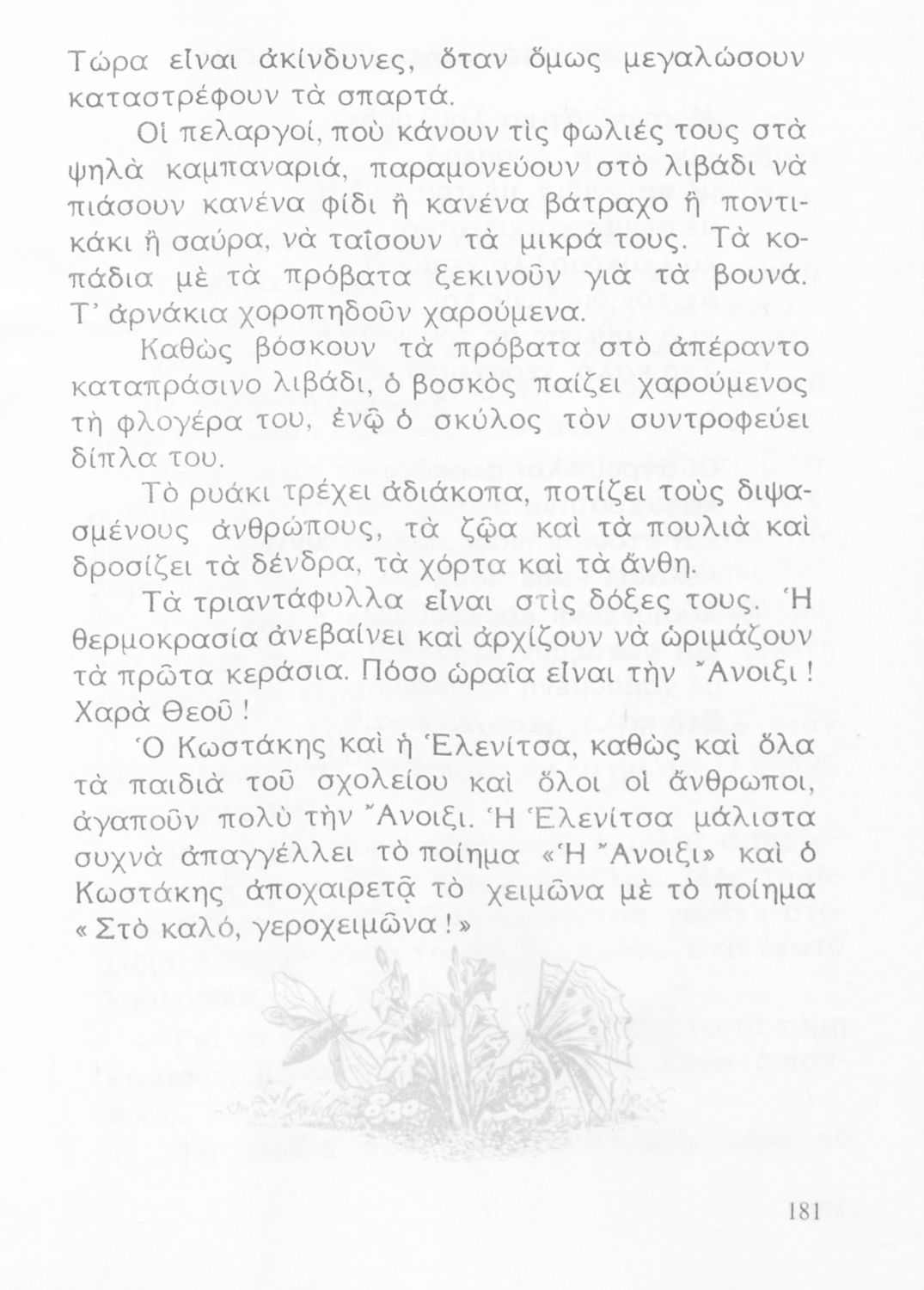 Αναγνωστικό Γ' Δημοτικού που είναι χωρισμένο σύμφωνα με τις εποχές του χρόνου και περιλαμβάνει ποιήματα και πεζά εμπνευσμένα από τη ζωή στην ύπαιθρο, την εθνική, οικογενειακή και κοινωνική ζωή, τη θρησκευτική ...