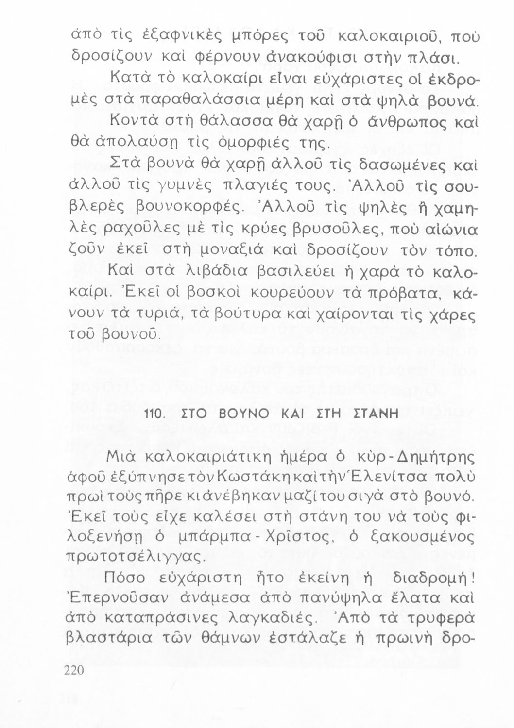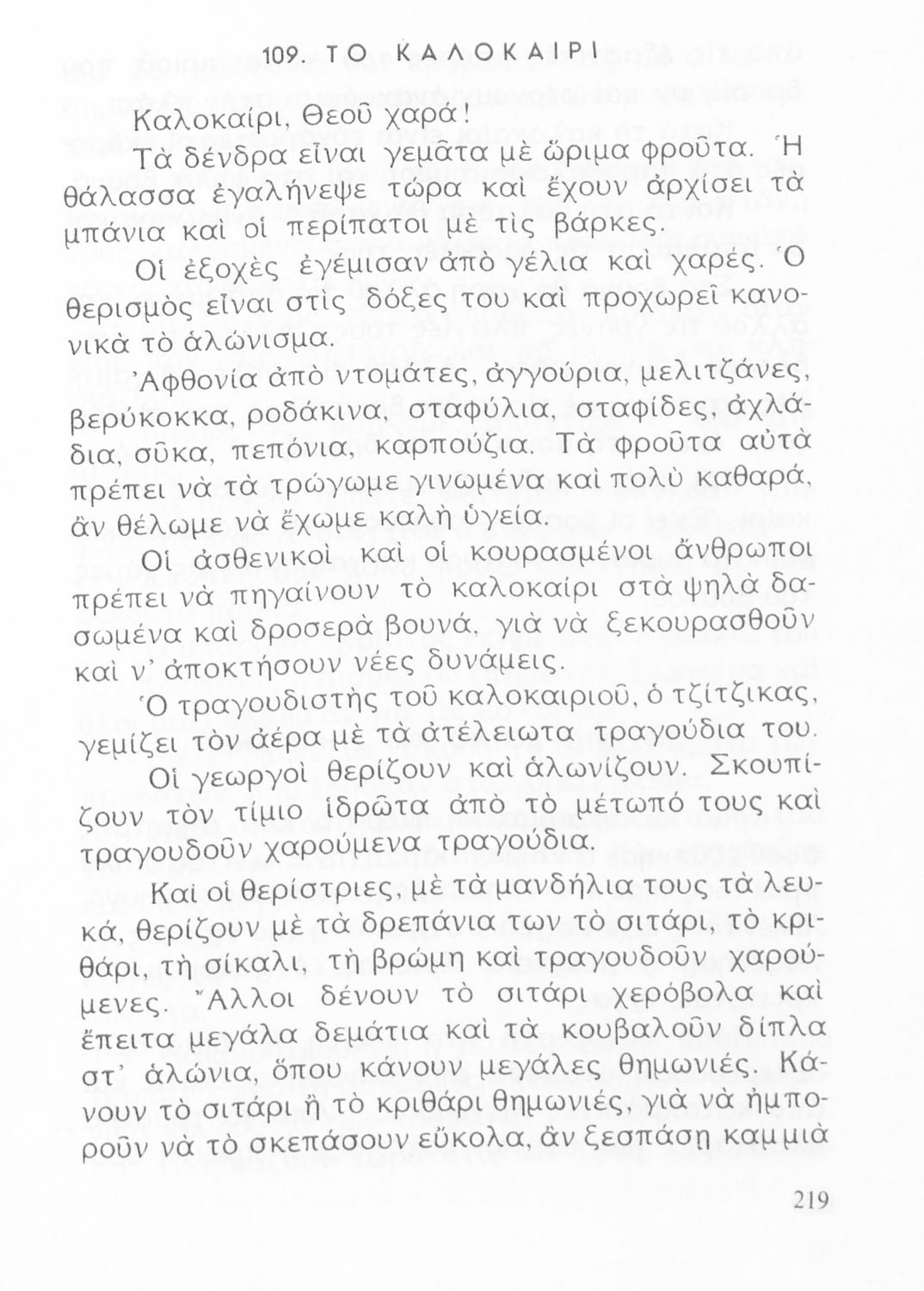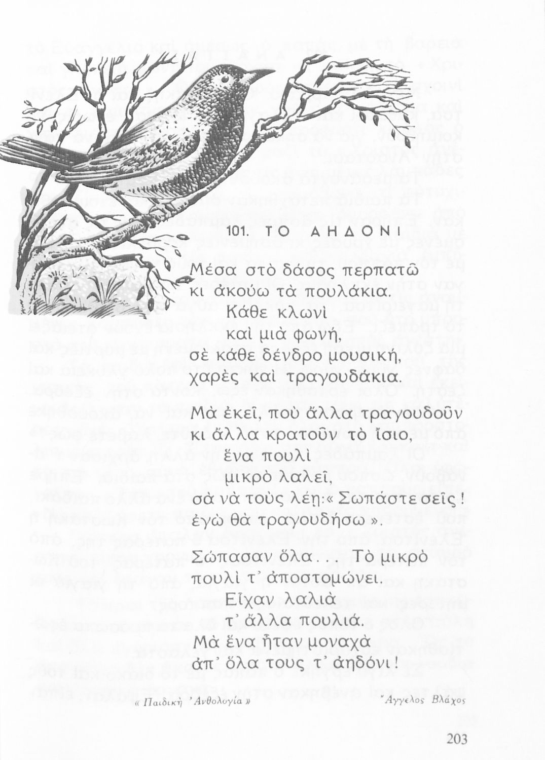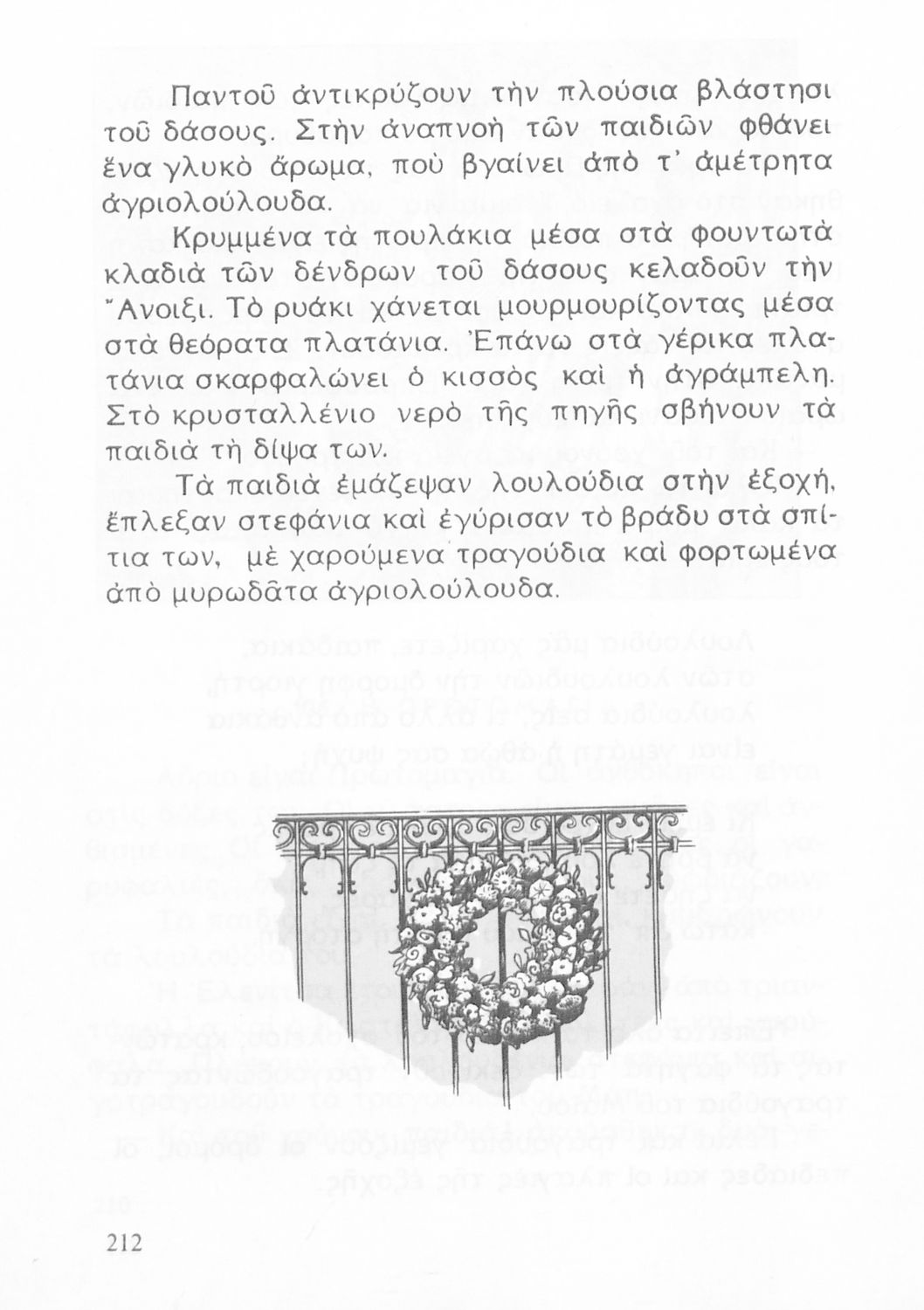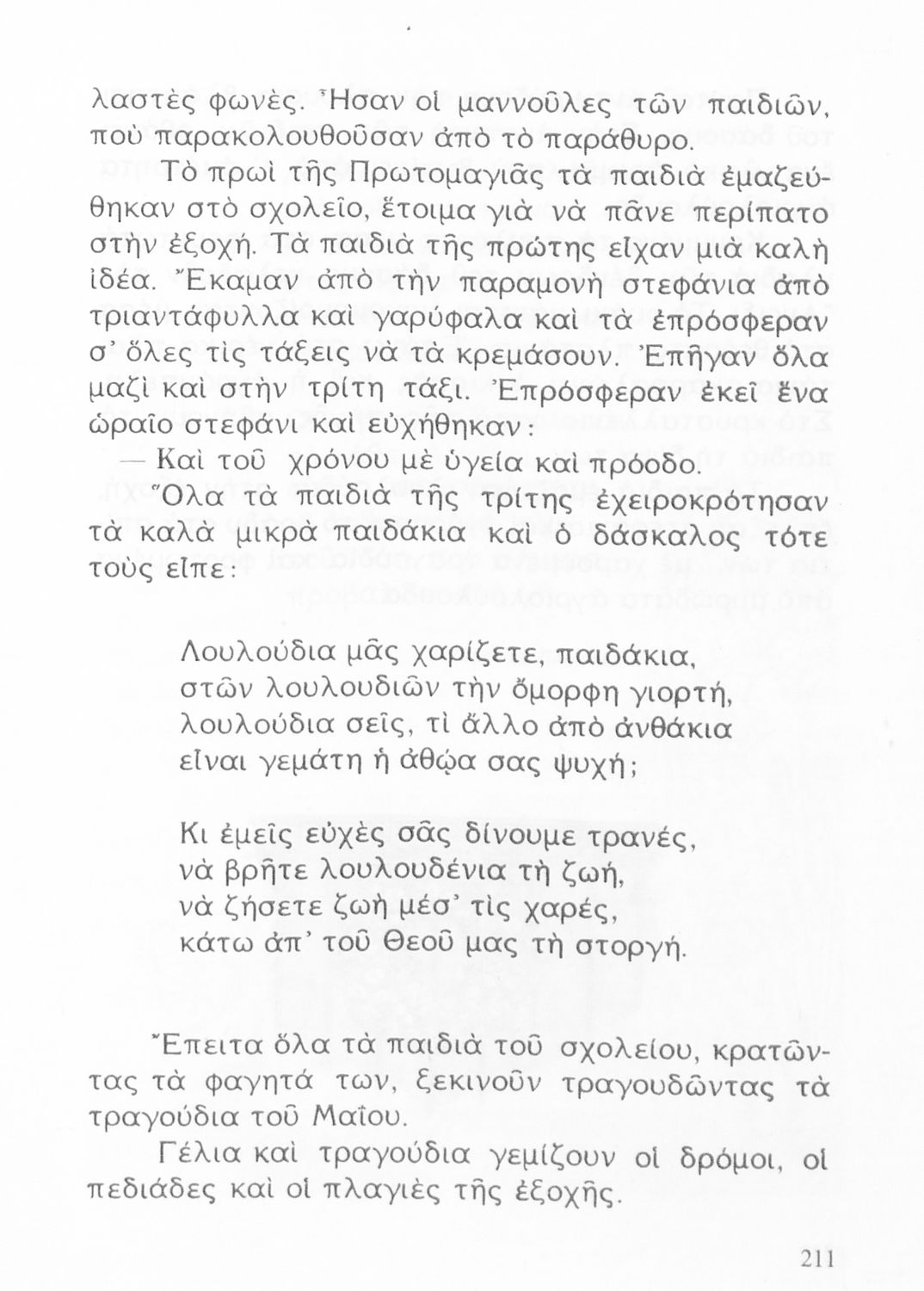 Αναγνωστικό Γ' Δημοτικού που είναι χωρισμένο σύμφωνα με τις εποχές του χρόνου και περιλαμβάνει ποιήματα και πεζά εμπνευσμένα από τη ζωή στην ύπαιθρο, την εθνική, οικογενειακή και κοινωνική ζωή, τη θρησκευτική παράδοση, τις ασχολίες των ανθρώπων, και την ελληνική φύση.